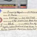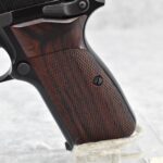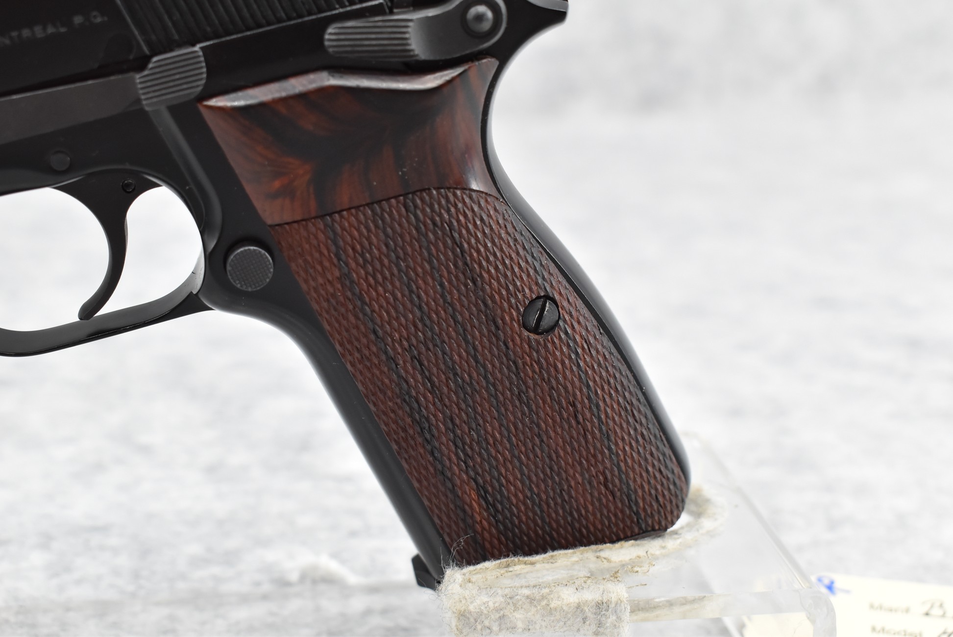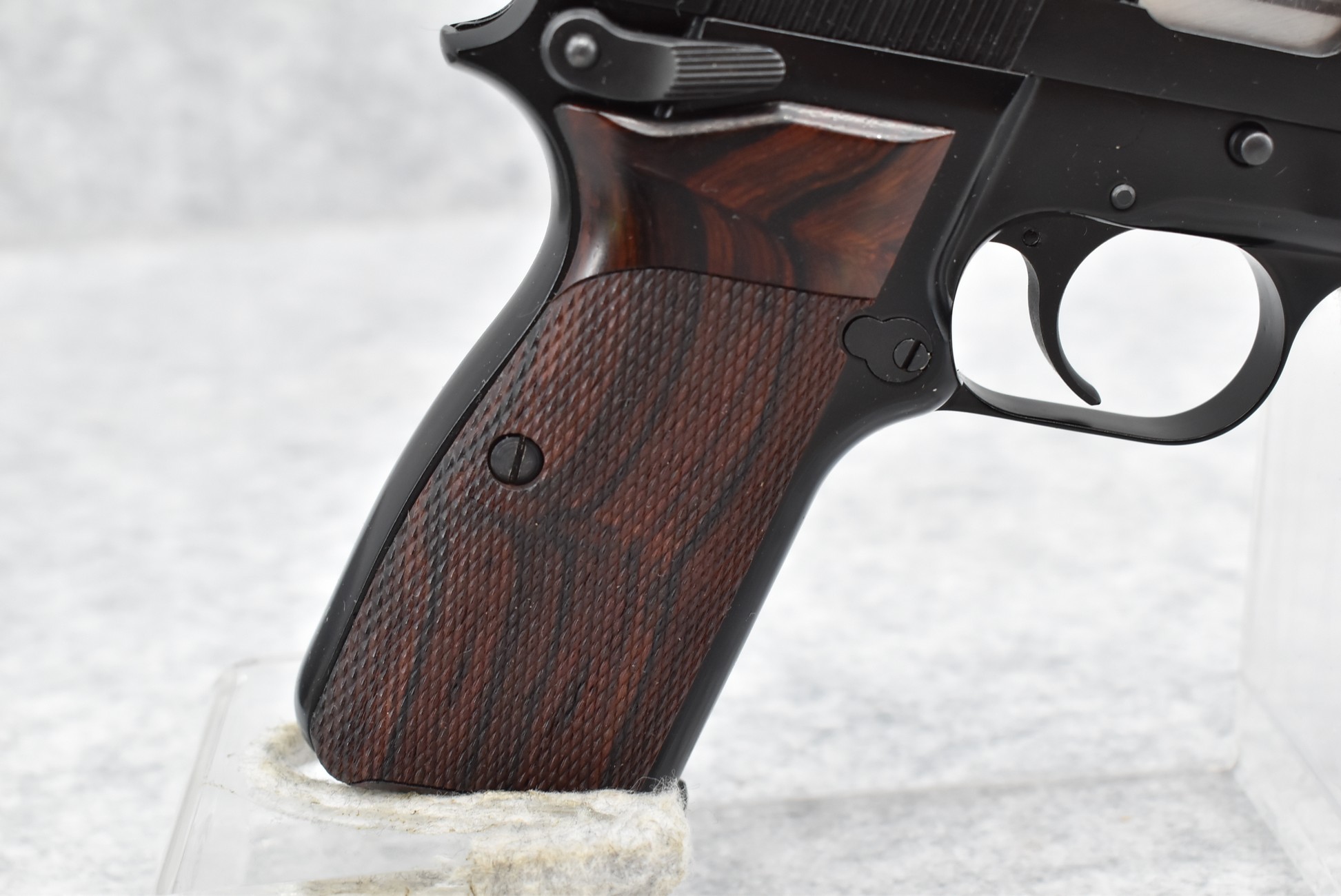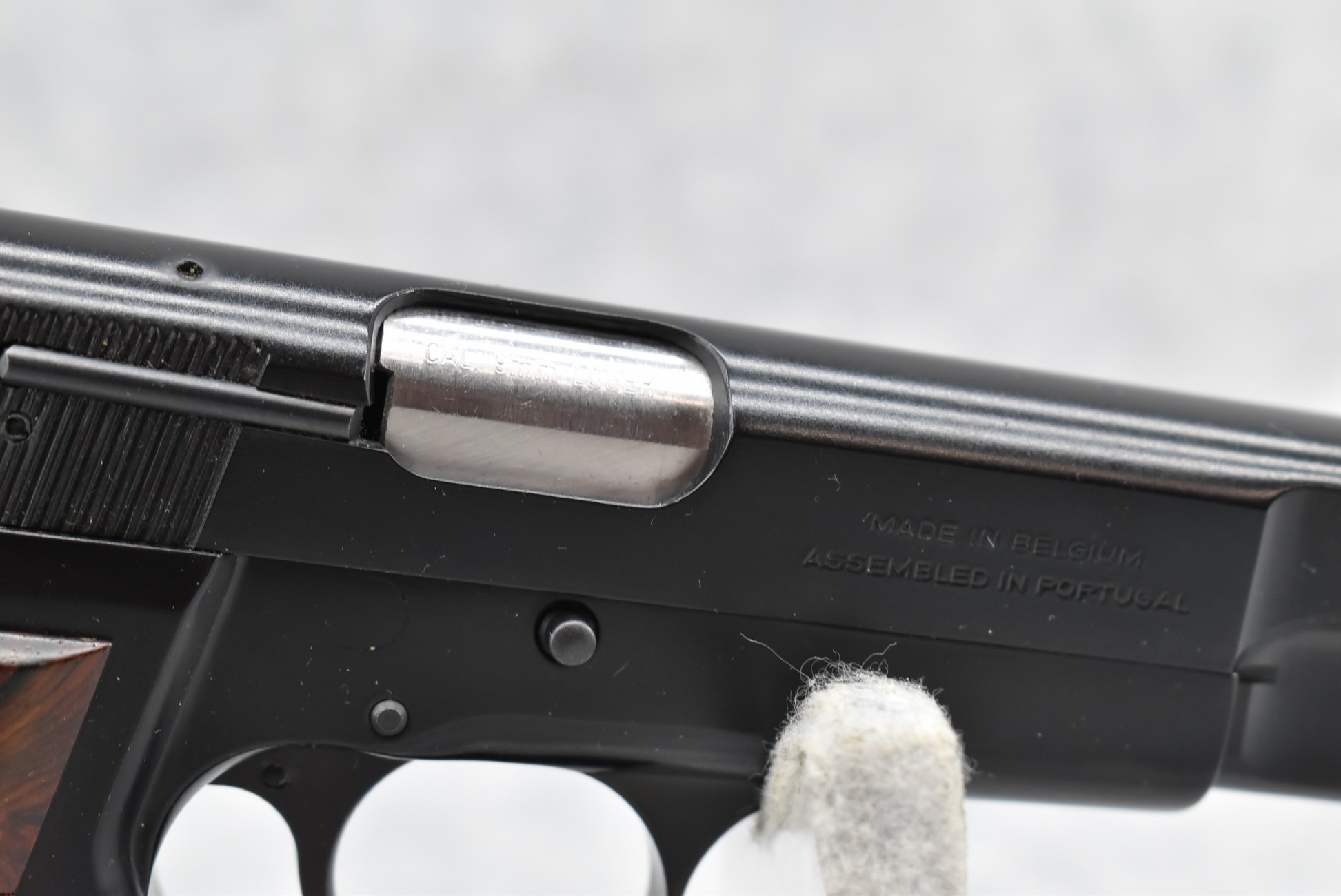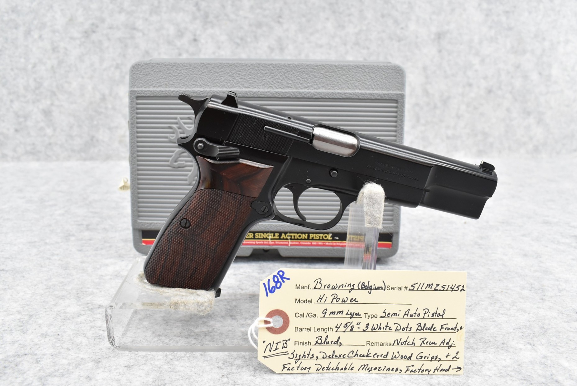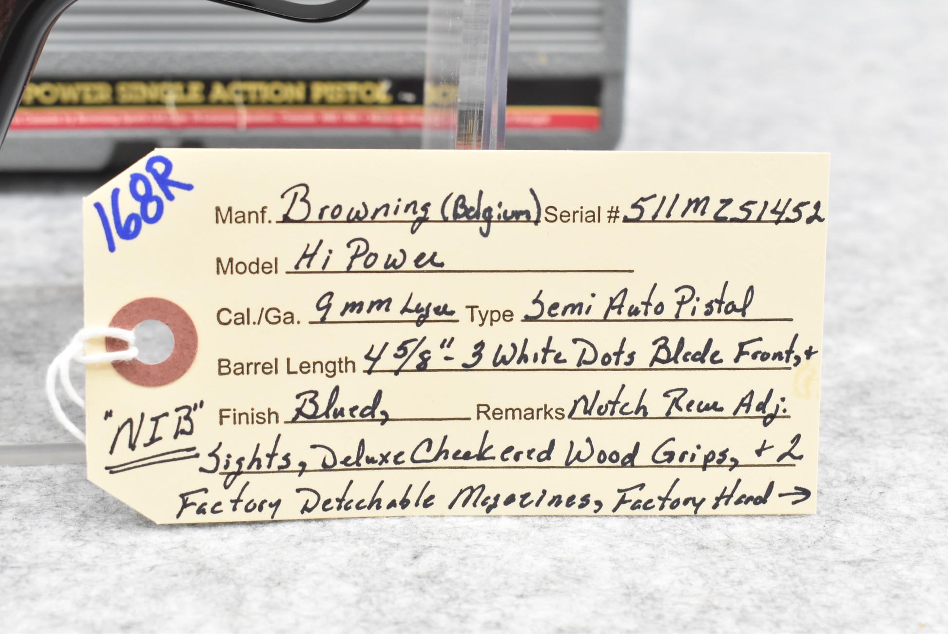 168R. Browning (Belgium) – Mod. Hi Power – 9mm Cal. Semi-Auto Pistol – w/4 21/32” Barrel w/3-White Dot Blade Front & Notch Rear Adj. Sights – Blued Finish – w/Deluxe Checkered Wood Grips – w/2 Factory Detachable Magazine – New w/Factory Hard Case & Manual