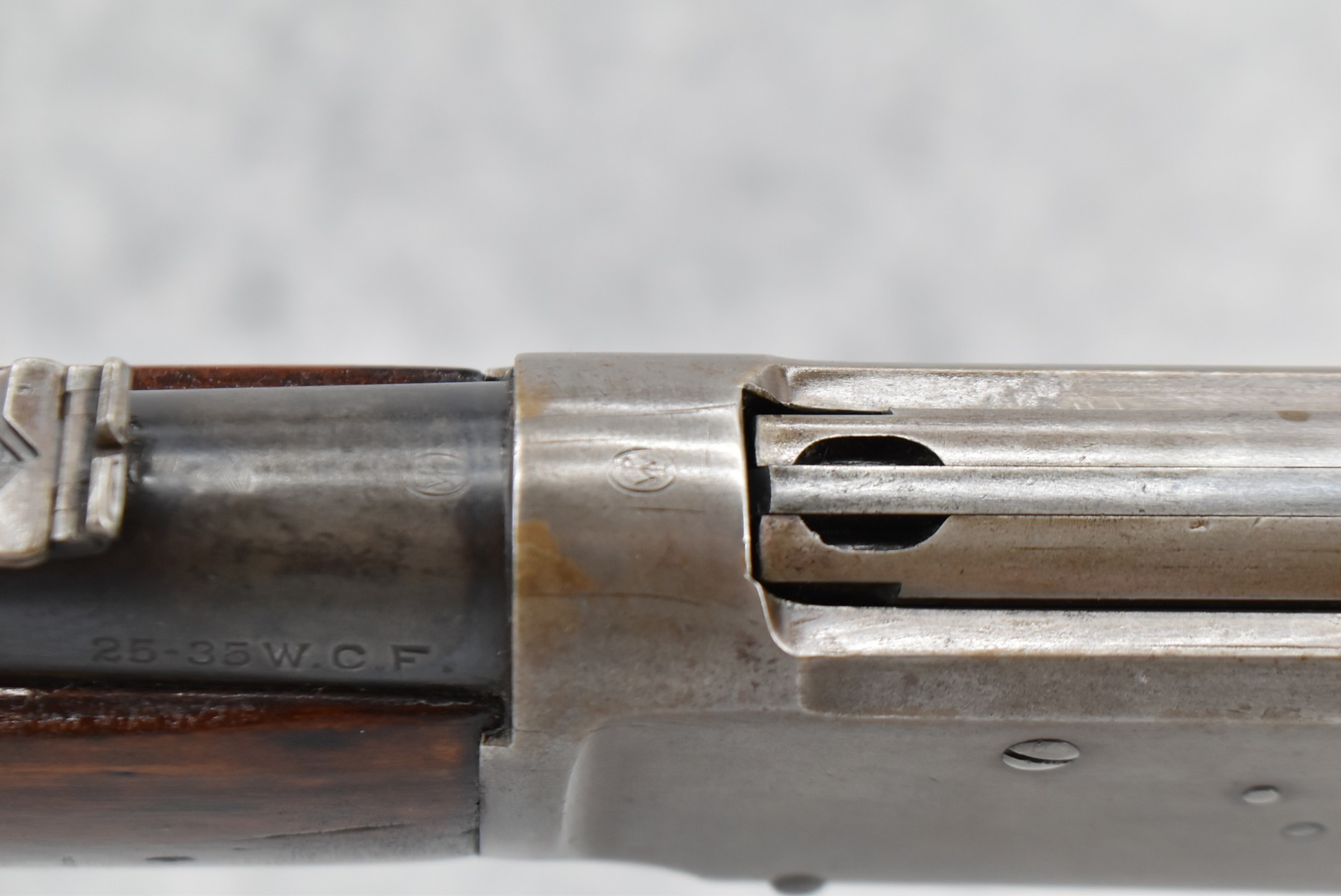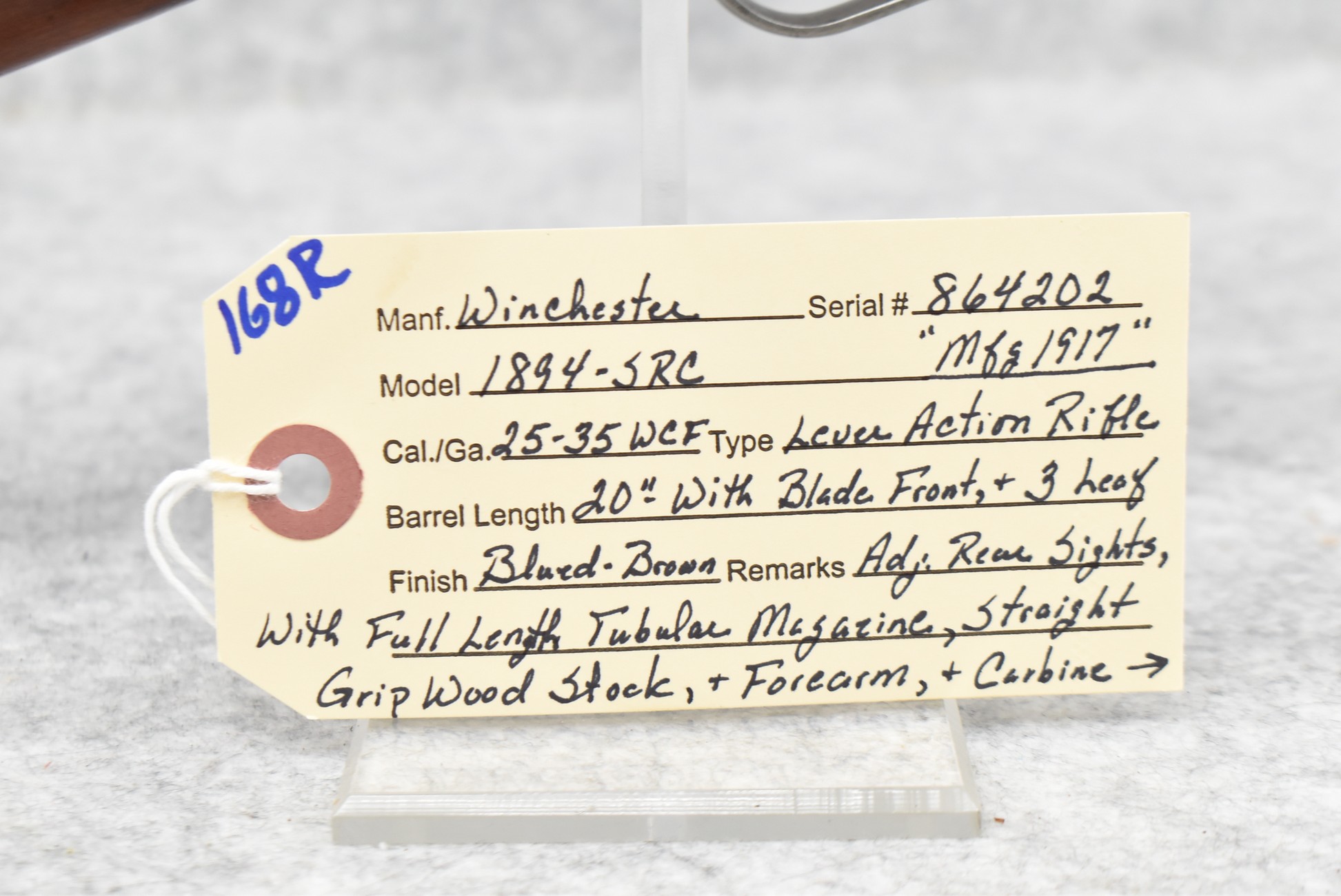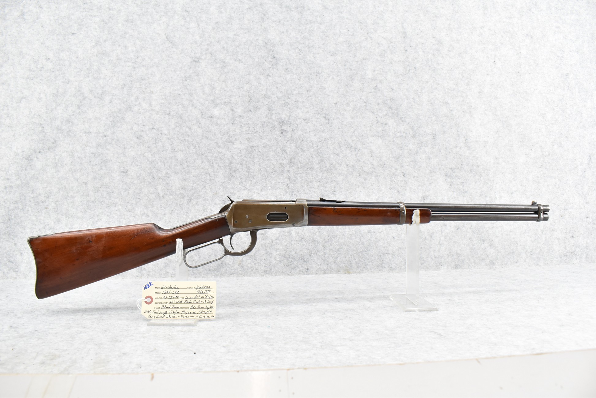 168R. Winchester – Mod. 1894 Saddle Ring Carbine – 25-35 WCF Cal. Lever Action Rifle – w/20” Barrel w/Blade Front & 3-Leaf Adj. Rear Sights w/Full Length Tubular Magazine – Blued/Brown Finish – w/Straight Grip Wood Stocks w/Carbine Metal Butt Plate – Mfg. 1917