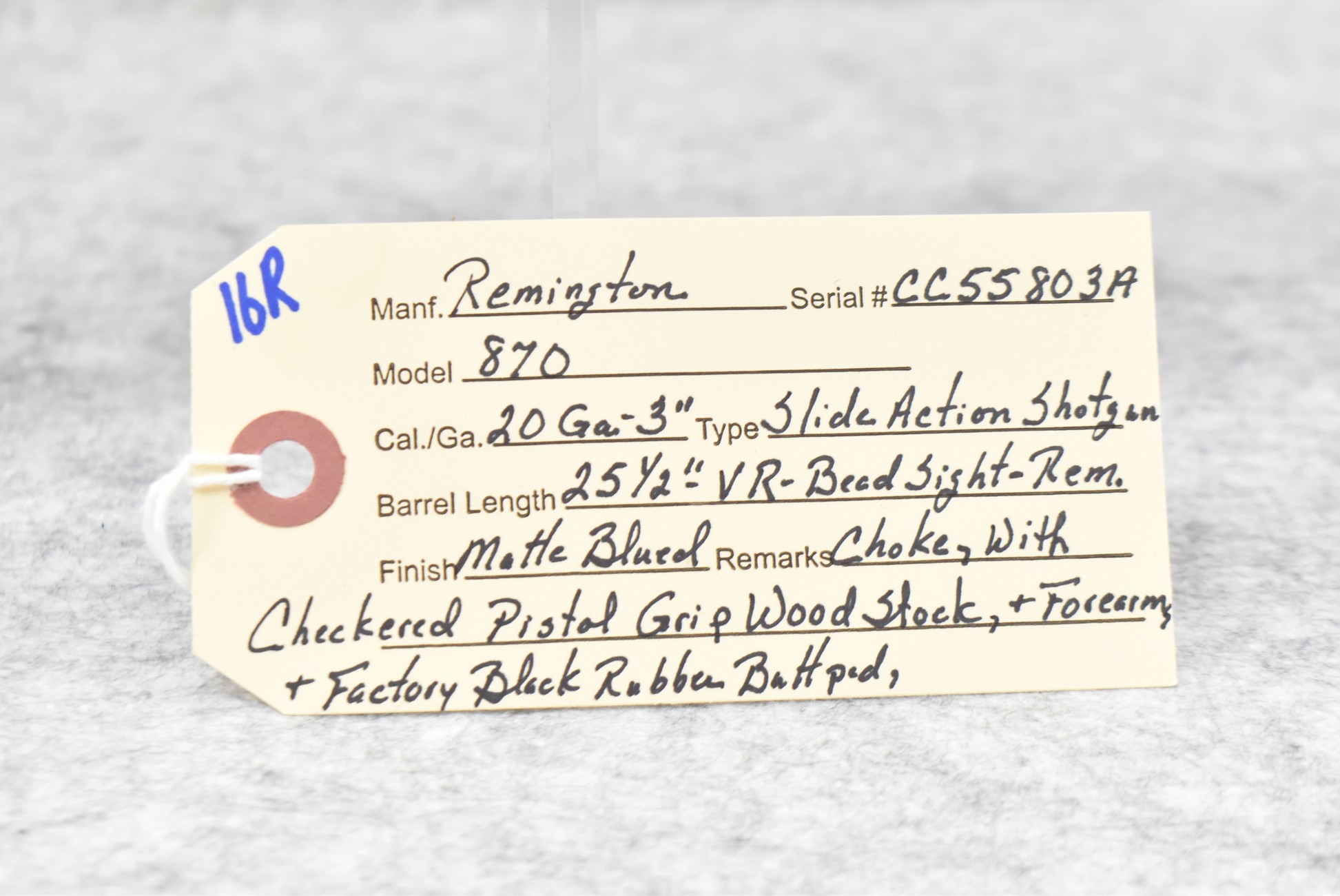 16R. Remington – Mod. 870 – 20ga. 3” Pump Action Shotgun – w/25½” Rem. Choke Vent Rib Barrel w/Bead Sight – Matte Blued Finish – w/Checkered Pistol Grip Wood Stocks w/Factory Butt Pad