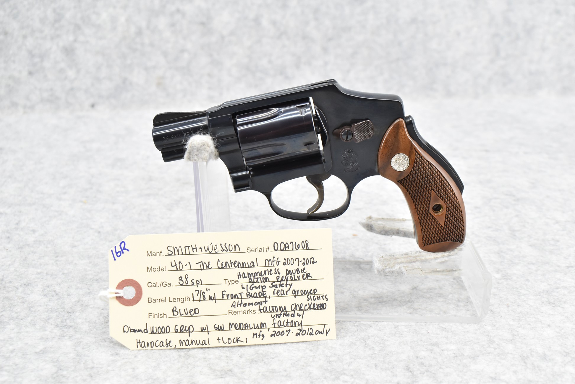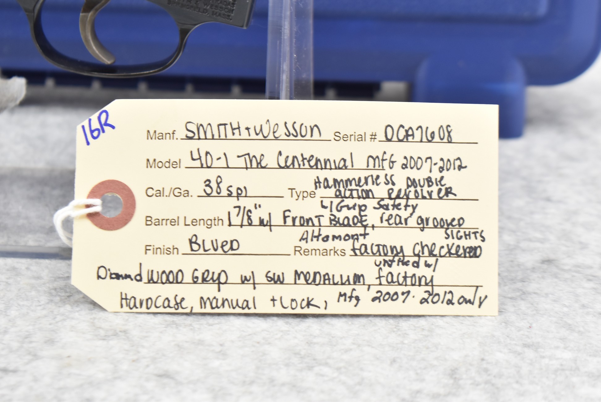 16R. Smith & Wesson – Mod. 40-1 “The Centennial” – 38 Spl. Cal. Hammerless Double Action Revolver – w/1 7/8” Barrel w/Front Blade & Rear Grooved Sights – Blued Finish – w/Altamont Factory Checkered Diamond Wood Grip w/S&W Medallion – w/Grip Safety – Unfired w/Factory Hard Case & Manual – Mfg. Between 2007-2012 Only