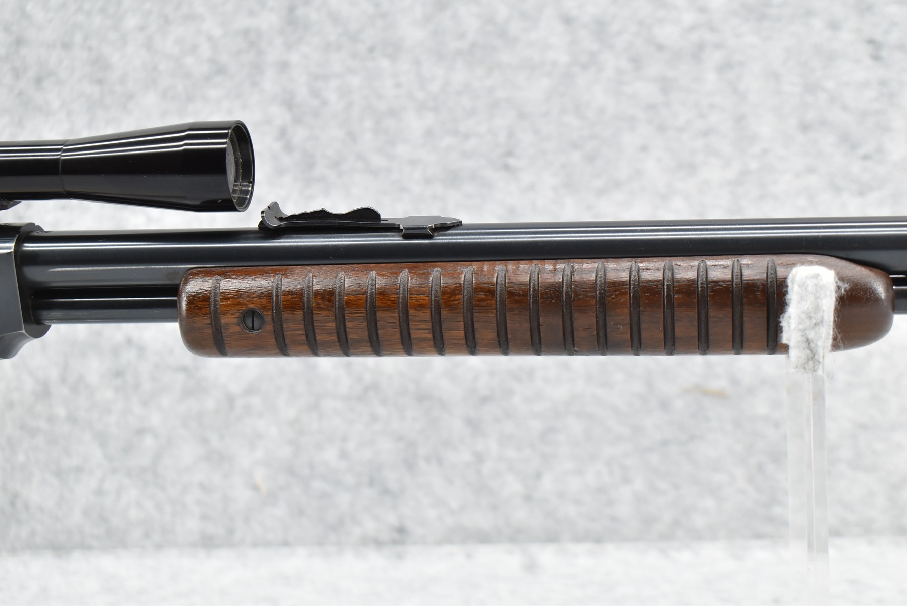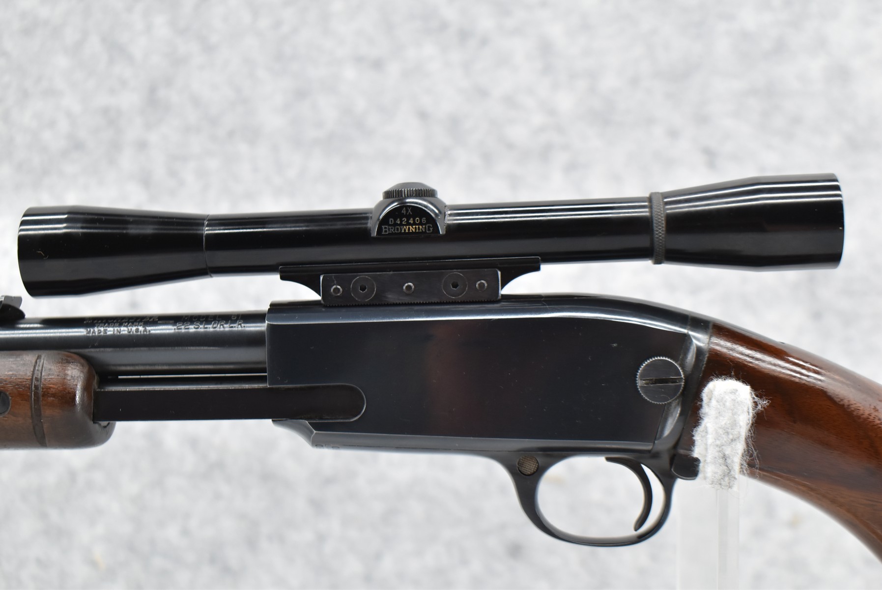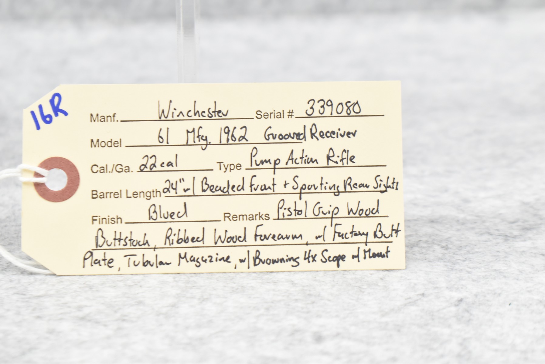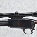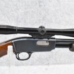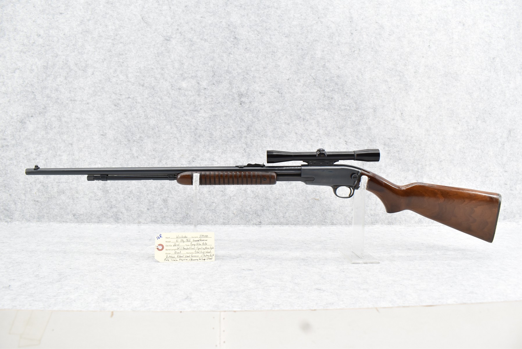 16R.       Winchester – Mod. 61 Grooved Receiver – 22 Cal. Pump Action Rifle – w/24” Barrel w/Beaded Front & Sporting Rear Sights – Blued Finish – w/Pistol Grip Wood Butt Stock w/Factory Butt Plate & Ribbed Wood Forearm – w/Tubular Magazine – w/Browning 4x Scope w/Rings – Mfg. 1962
