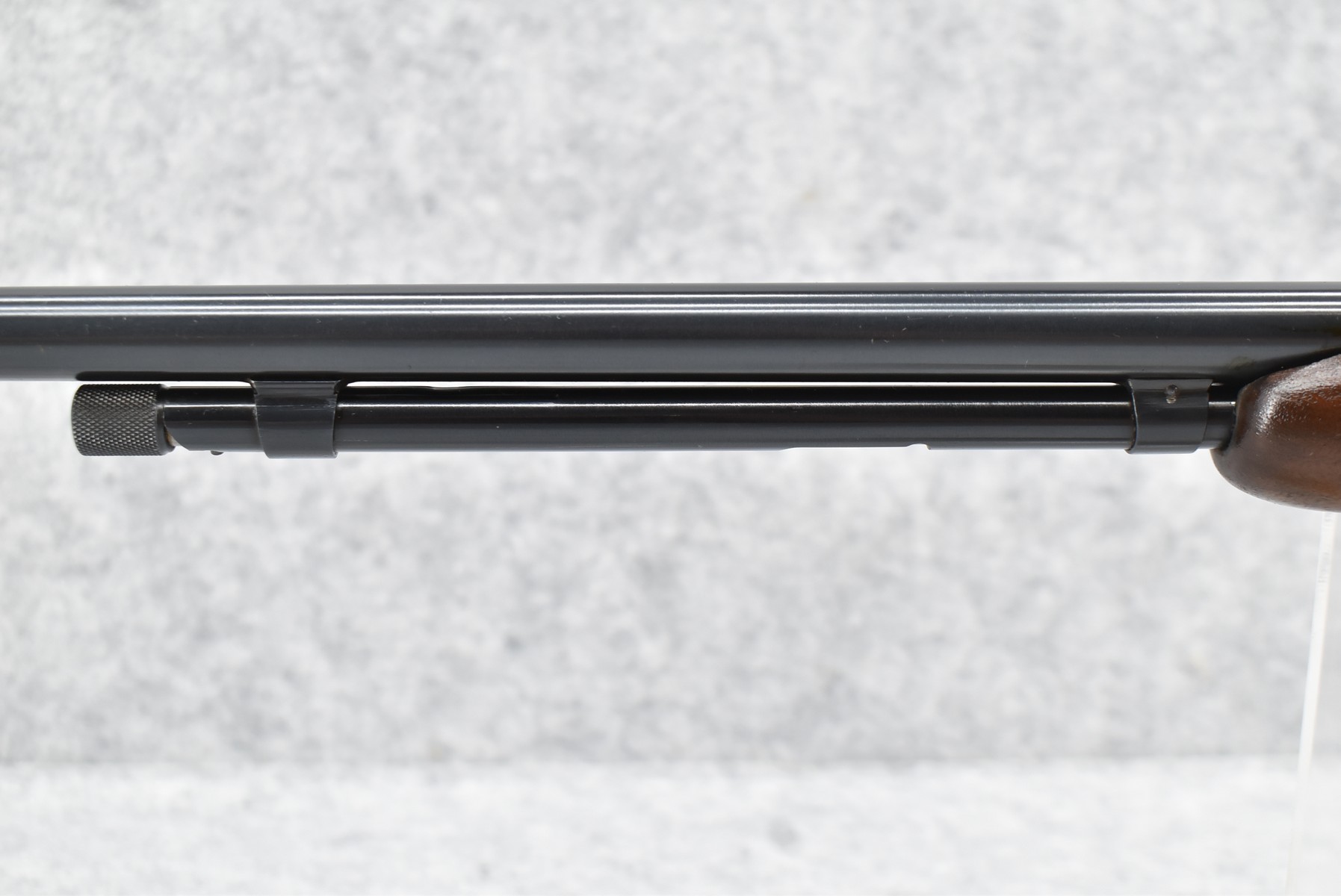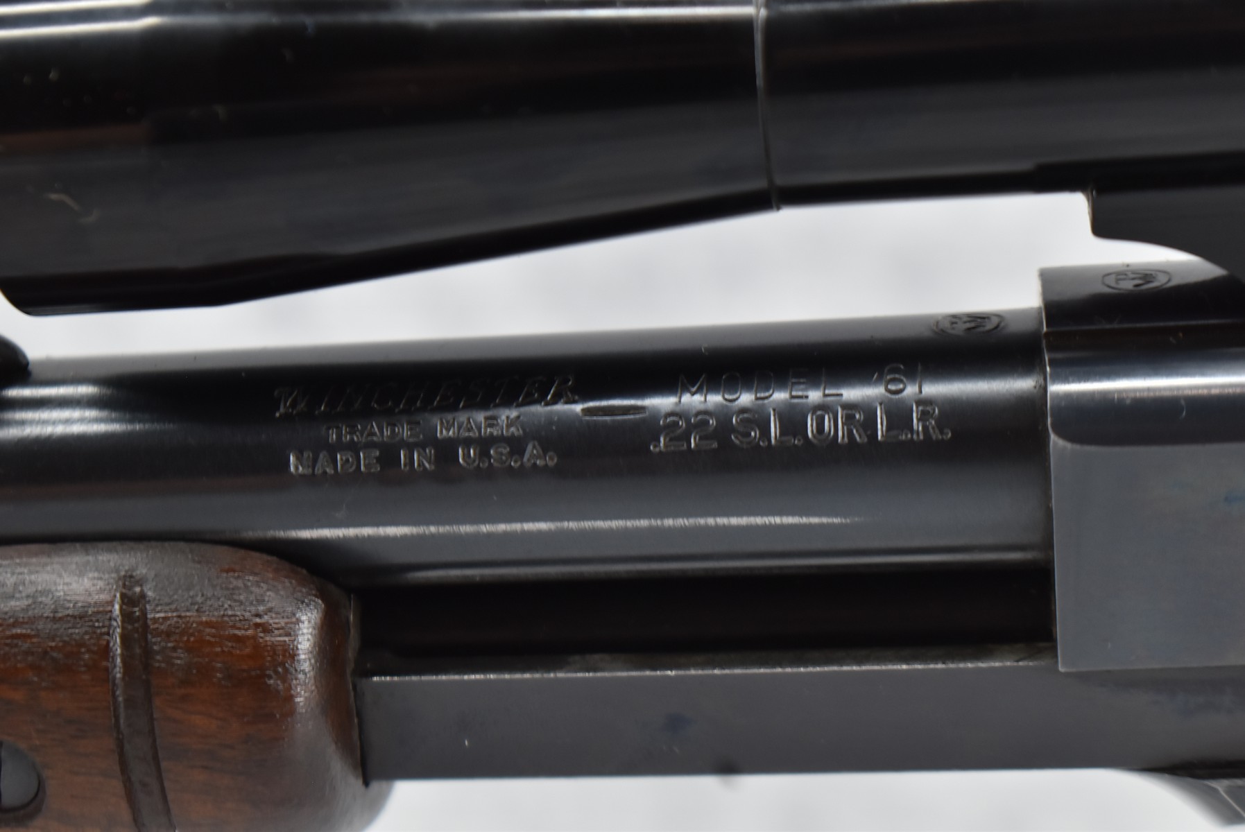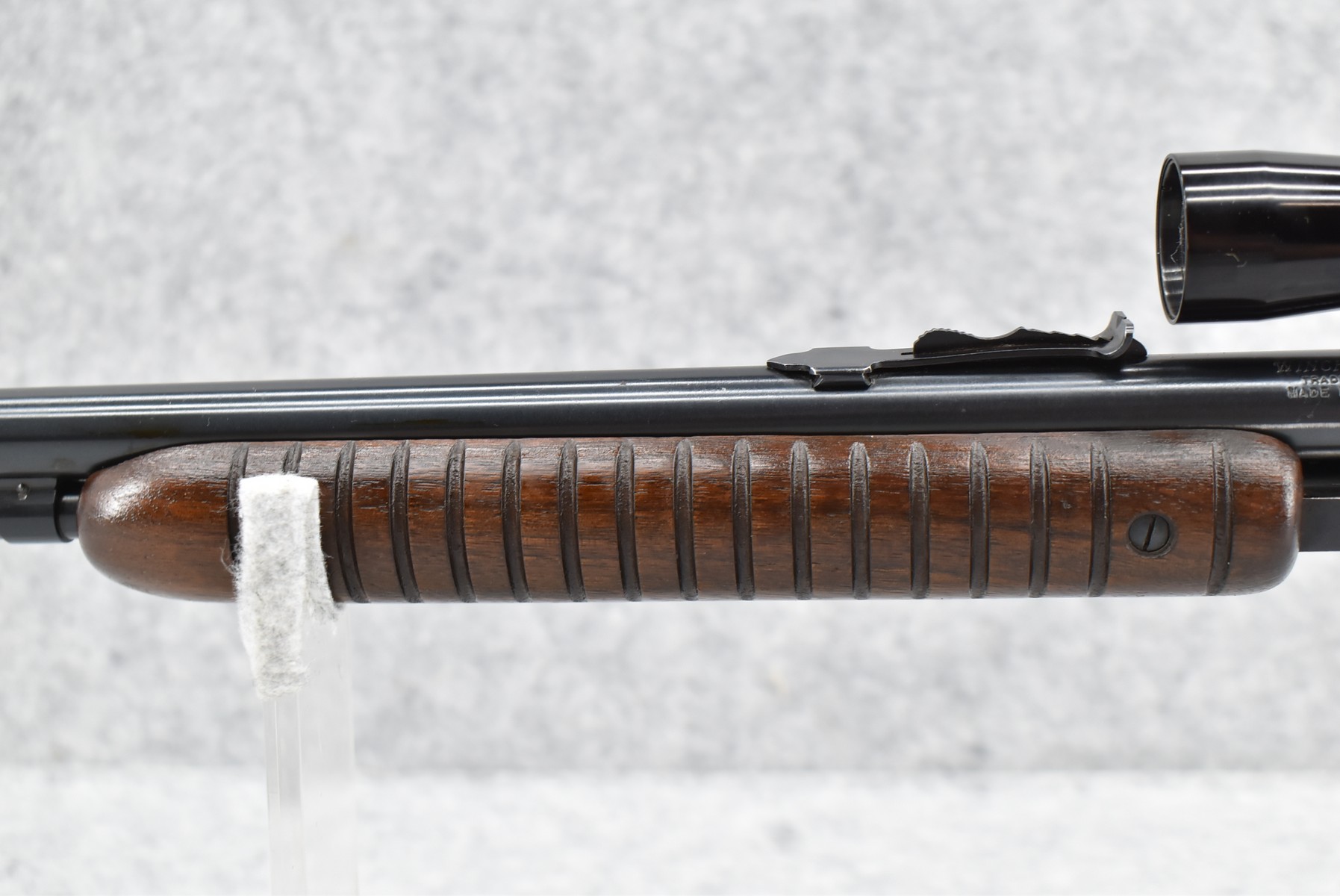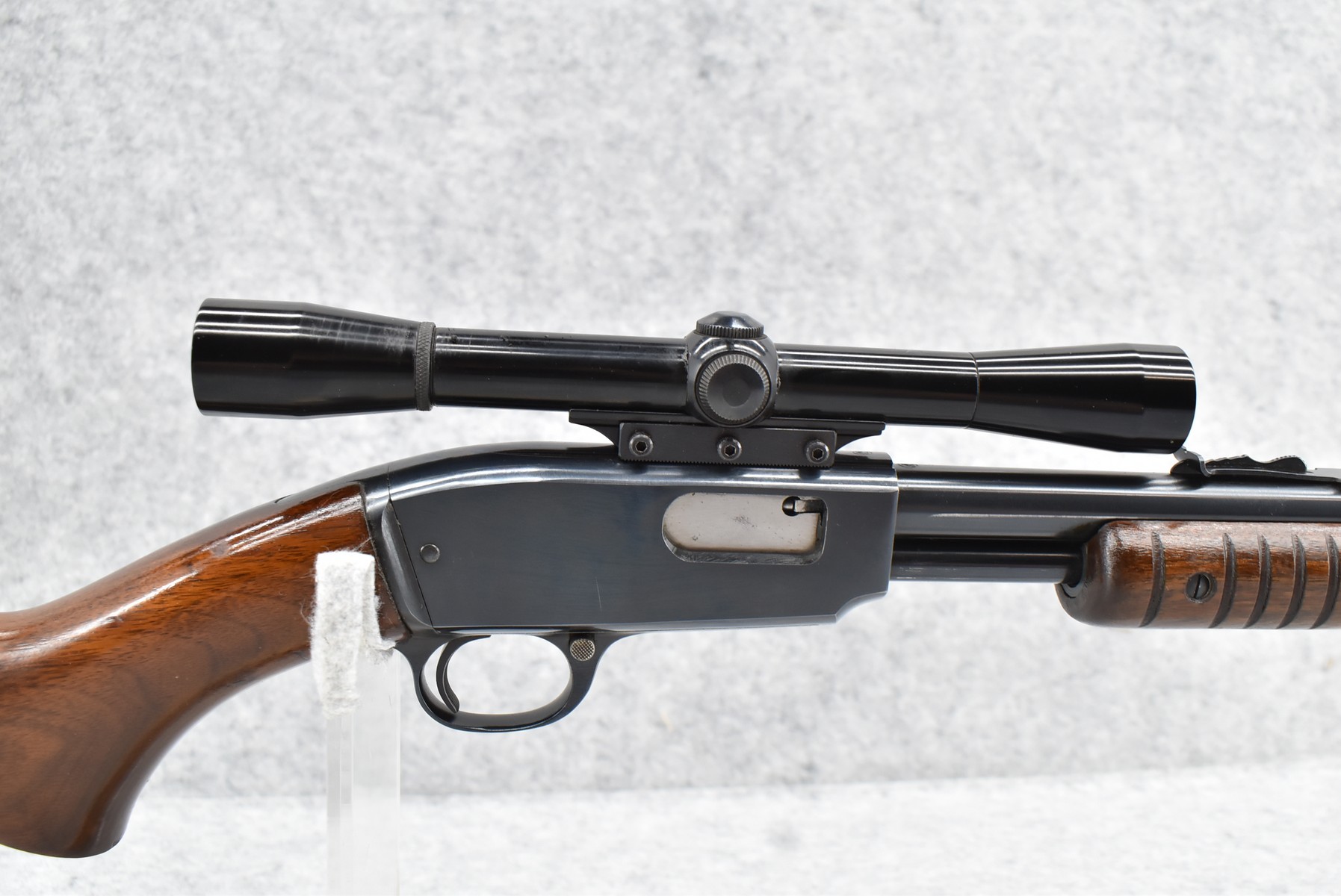 16R.       Winchester – Mod. 61 Grooved Receiver – 22 Cal. Pump Action Rifle – w/24” Barrel w/Beaded Front & Sporting Rear Sights – Blued Finish – w/Pistol Grip Wood Butt Stock w/Factory Butt Plate & Ribbed Wood Forearm – w/Tubular Magazine – w/Browning 4x Scope w/Rings – Mfg. 1962