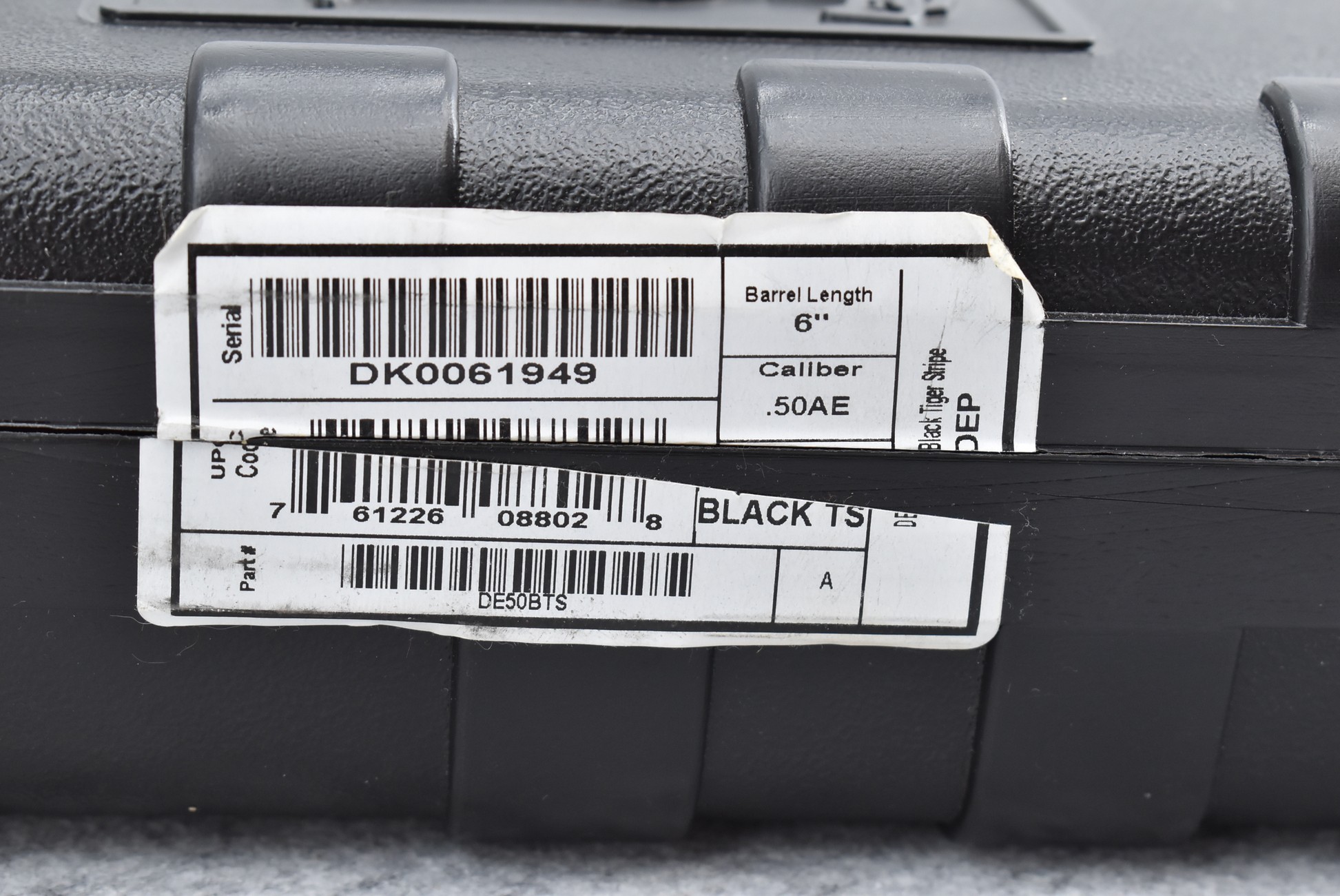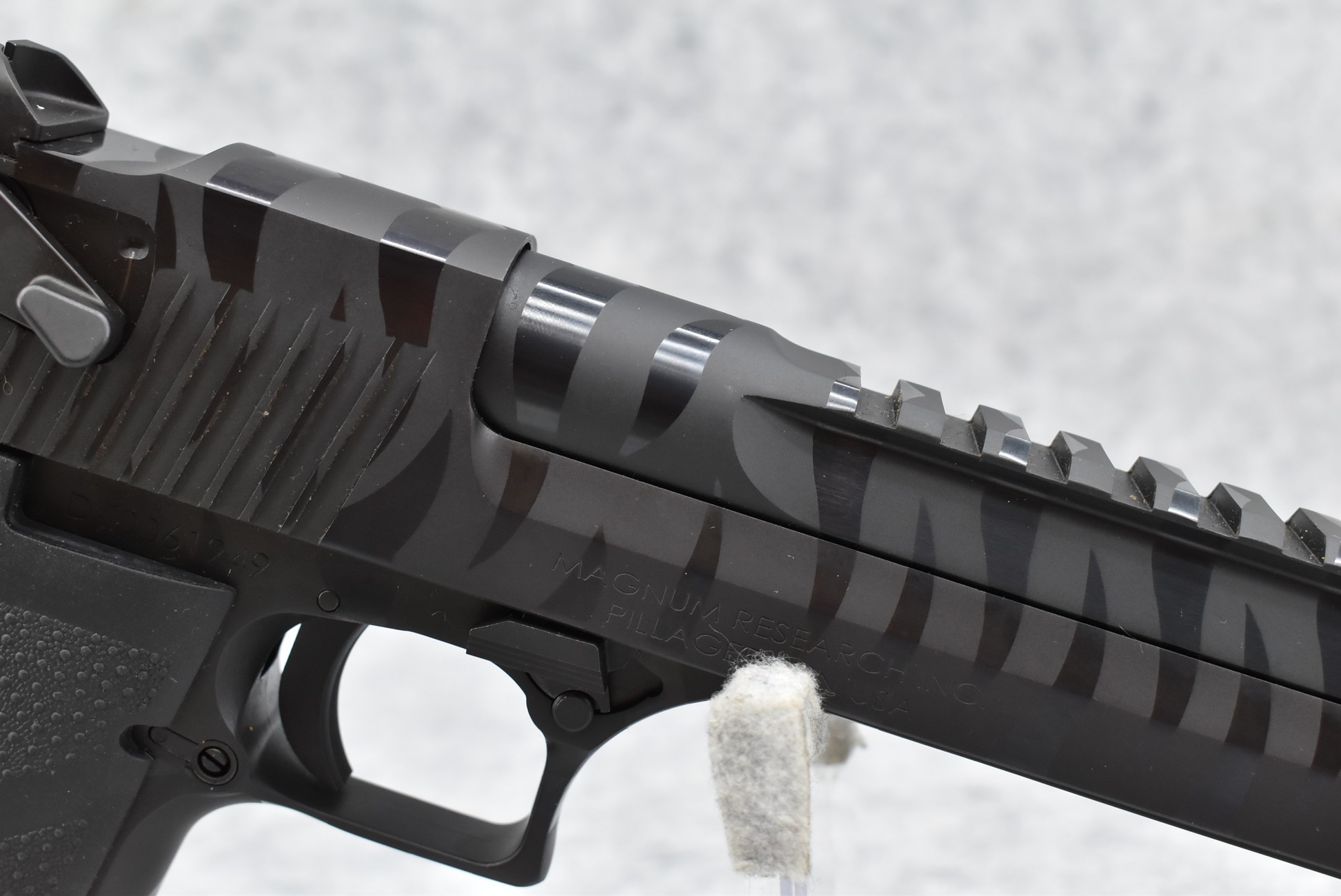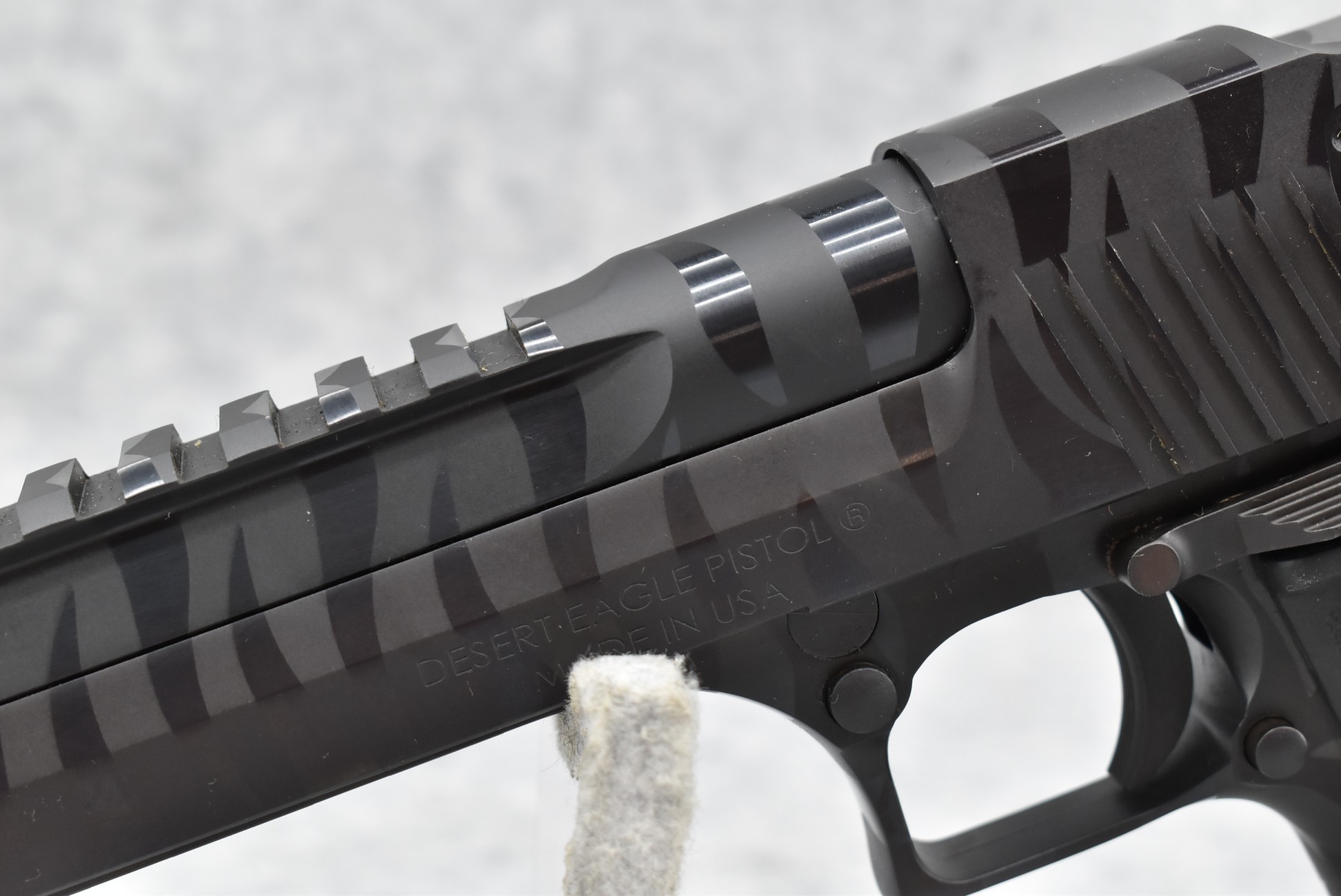 170R. Magnum Research – Mod. Desert Eagle – 50 AE Cal. Semi-Auto Pistol – w/6” Barrel w/Ramp Blade Front & Notch Rear Sights – Blued/Tiger Striped Finish – w/Factory Wraparound Black Rubber Grips – w/Factory Detachable Magazine – Unfired w/Factory Hard Case & Accessories