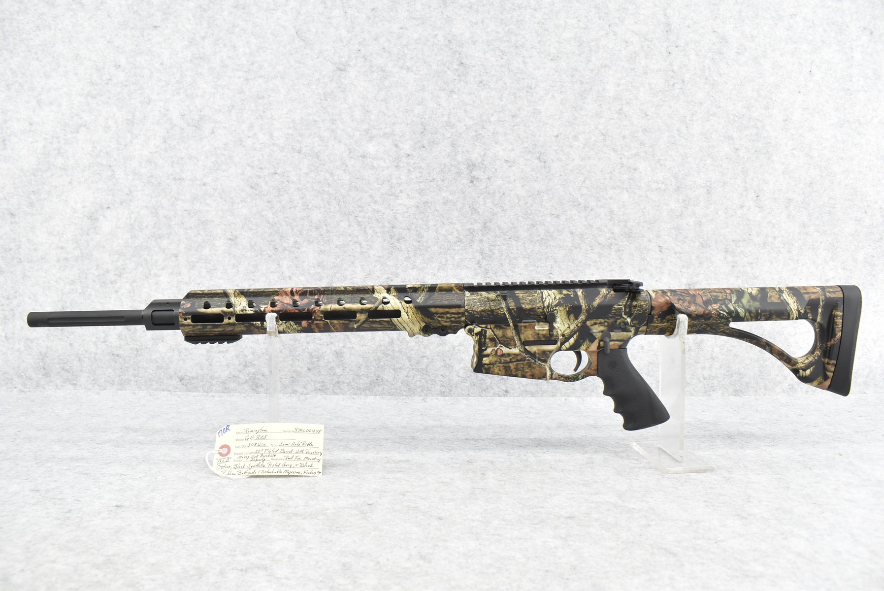 170R. Remington – Mod. G11-R25 – 308 Win. Cal. Semi-Auto Rifle – w/20” Fluted Barrel – Full Mossy Oak Break Up Infinity Camo Coverage – w/Black Synthetic Pistol Grip & Butt Pad – w/Detachable Mag – w/Picatinny Rail for Mounting Optics – New w/Box, Manual & Factory Hard Case