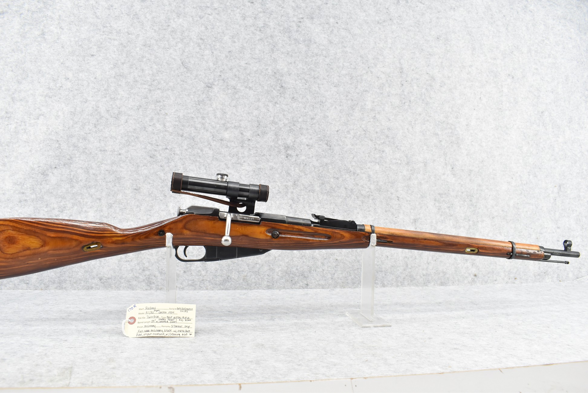 170R. Russian – Mod. 91/30 Sniper – Dated 1934 – 7.62x54R Cal. Bolt Action Rifle – w/29” Barrel w/Hooded Front & Adj. Rear Ladder Sights – Military Finish – w/Straight Grip Full Wood Military Stock w/Metal Butt Plate – w/Cleaning Rod – w/Mosin Nagant 91/30 Rifle Scope & 1pc. Side Mount – Import Marked
