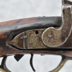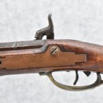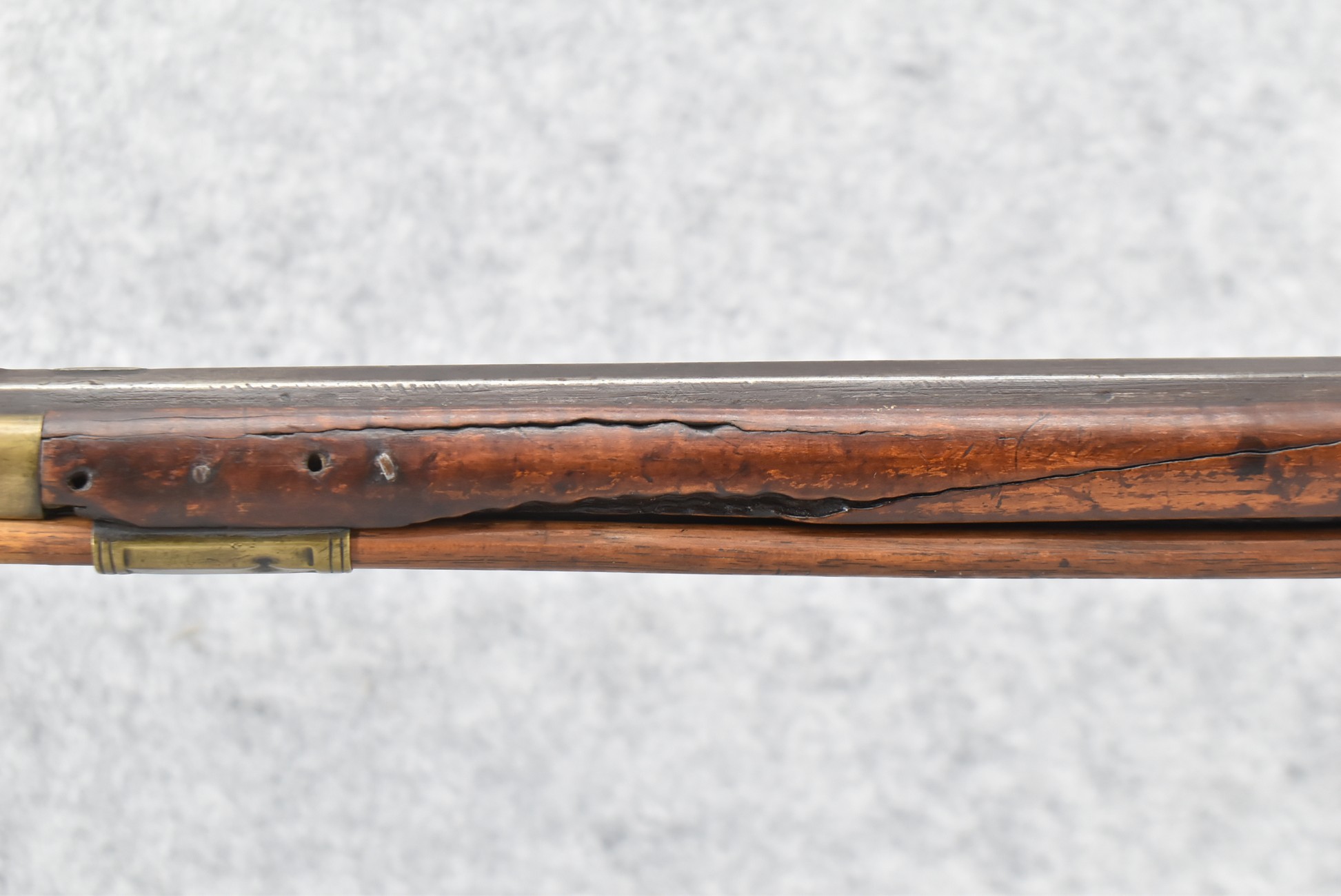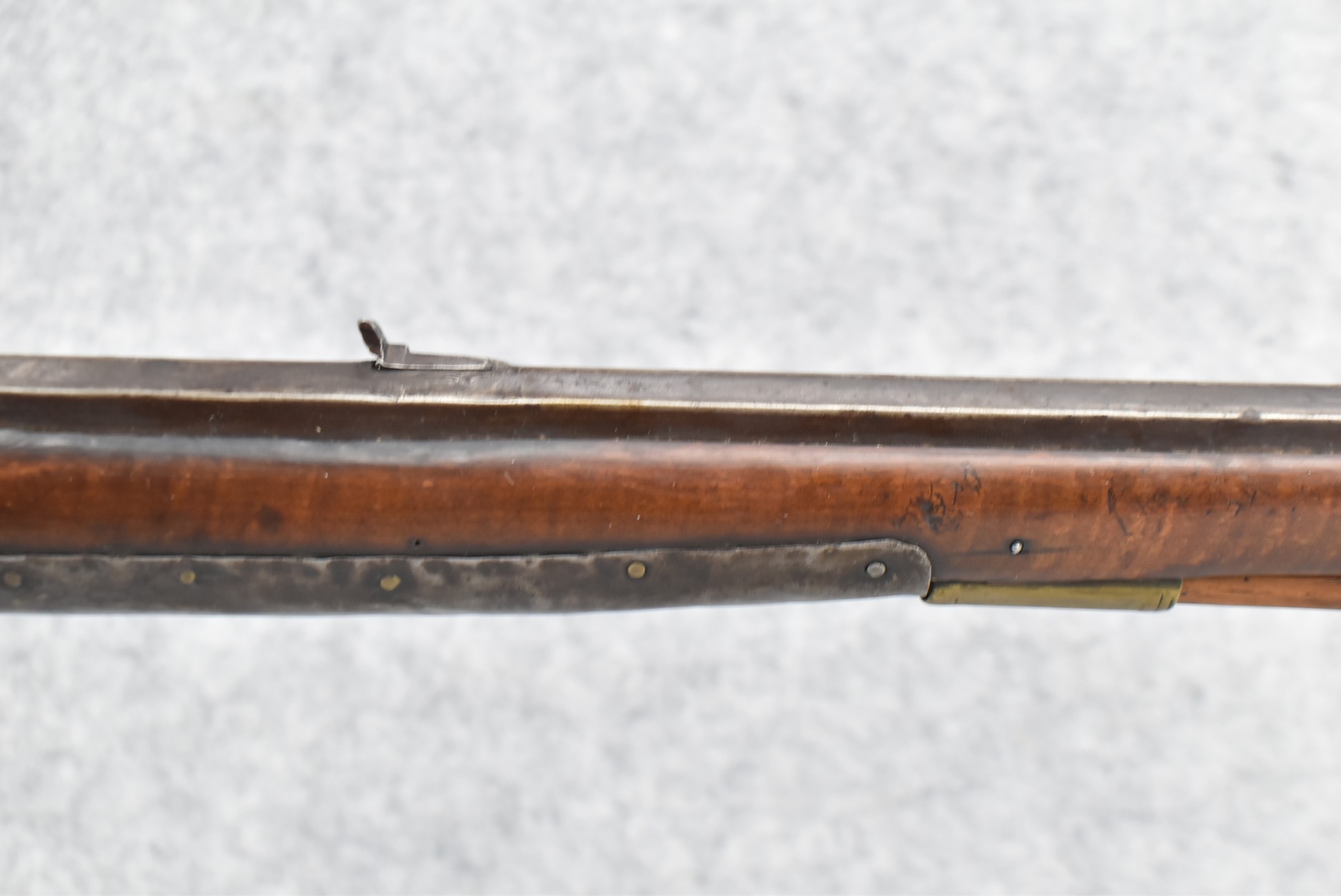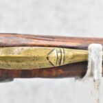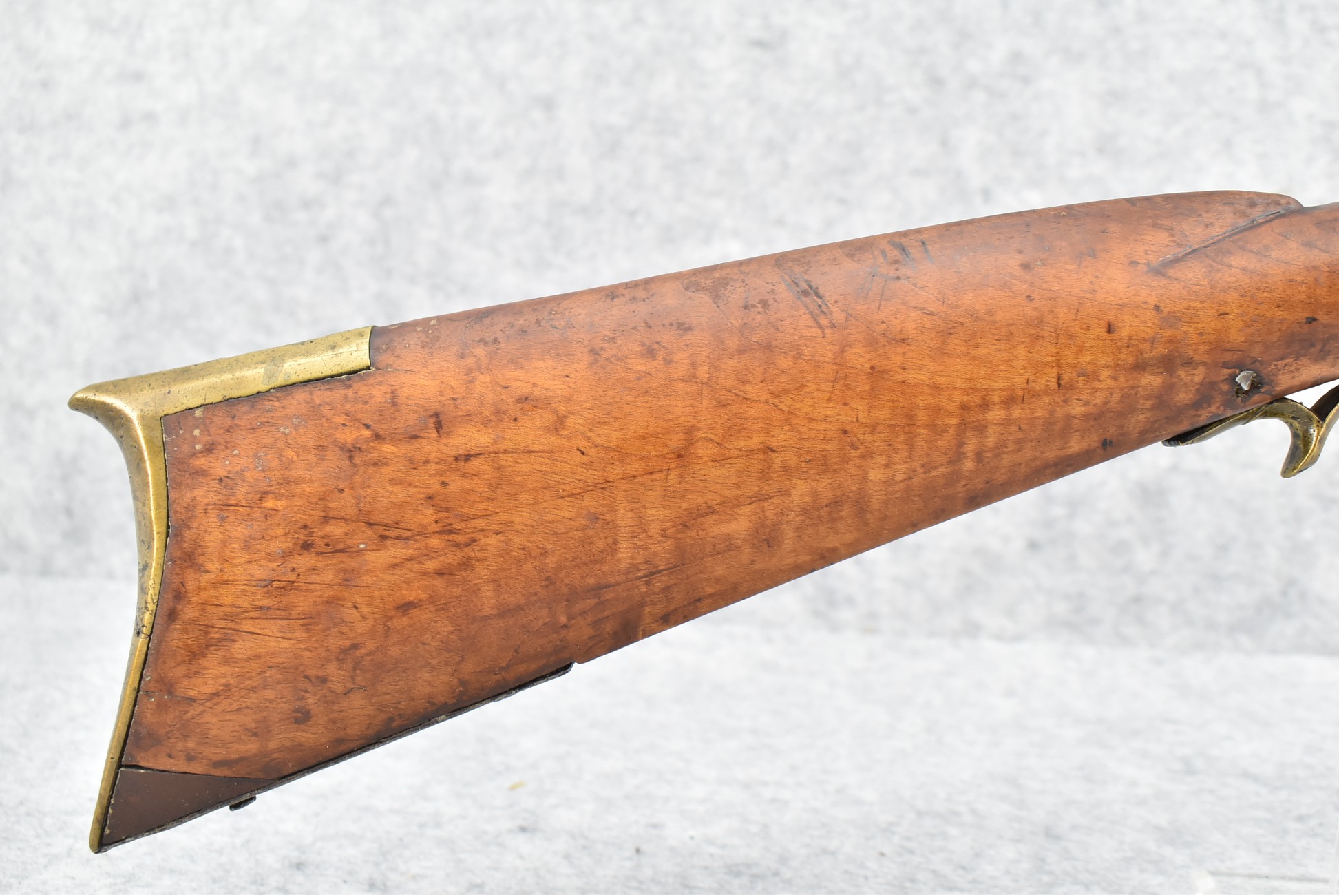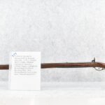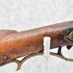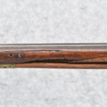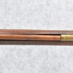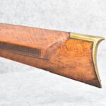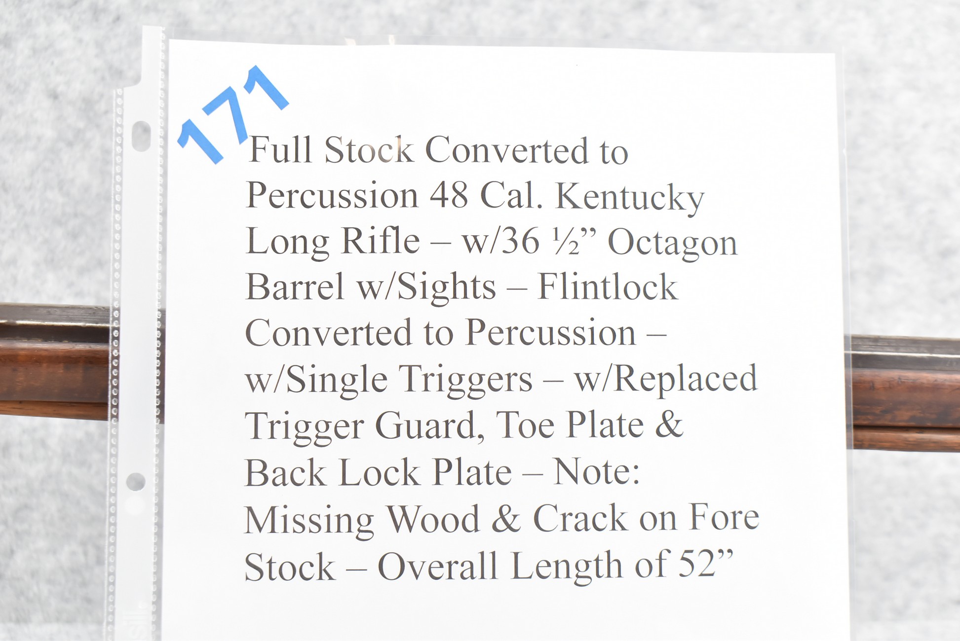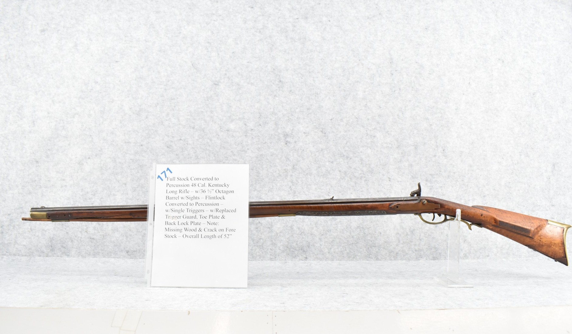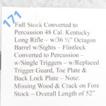 171. Full Stock Converted to Percussion 48 Cal. Kentucky Long Rifle – w/36 ½” Octagon Barrel w/Sights – Flintlock Converted to Percussion – w/Single Triggers – w/Replaced Trigger Guard, Toe Plate & Back Lock Plate – Note: Missing Wood & Crack on Fore Stock – Overall Length of 52”
