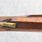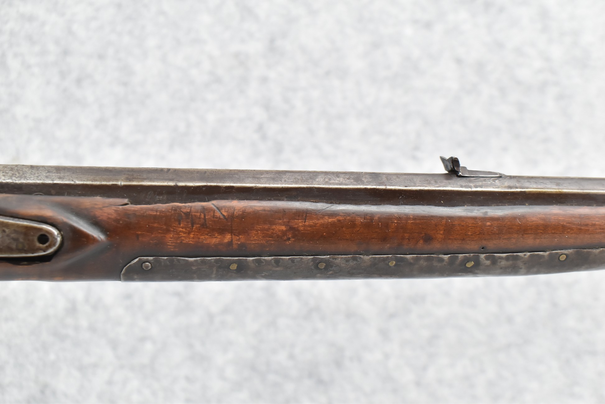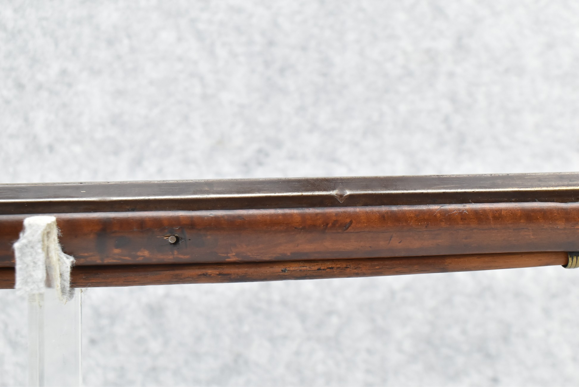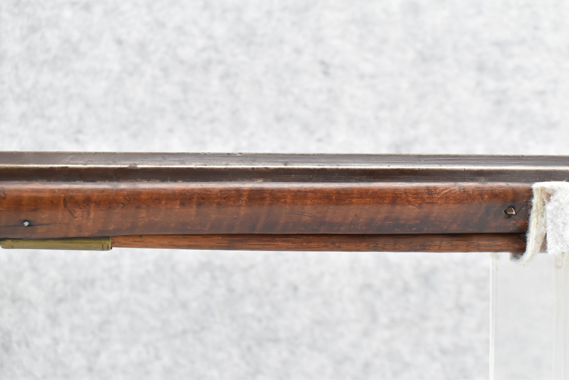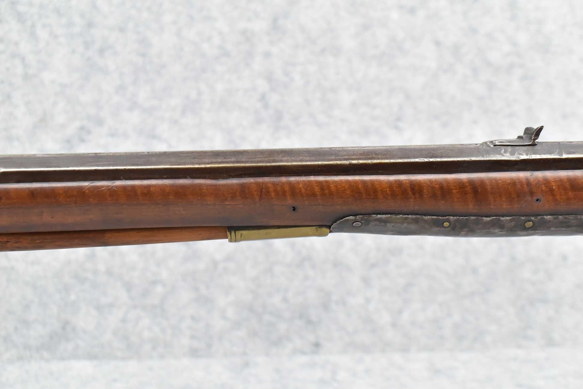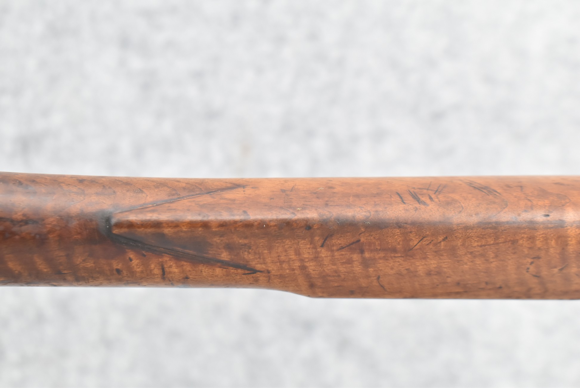 171. Full Stock Converted to Percussion 48 Cal. Kentucky Long Rifle – w/36 ½” Octagon Barrel w/Sights – Flintlock Converted to Percussion – w/Single Triggers – w/Replaced Trigger Guard, Toe Plate & Back Lock Plate – Note: Missing Wood & Crack on Fore Stock – Overall Length of 52”