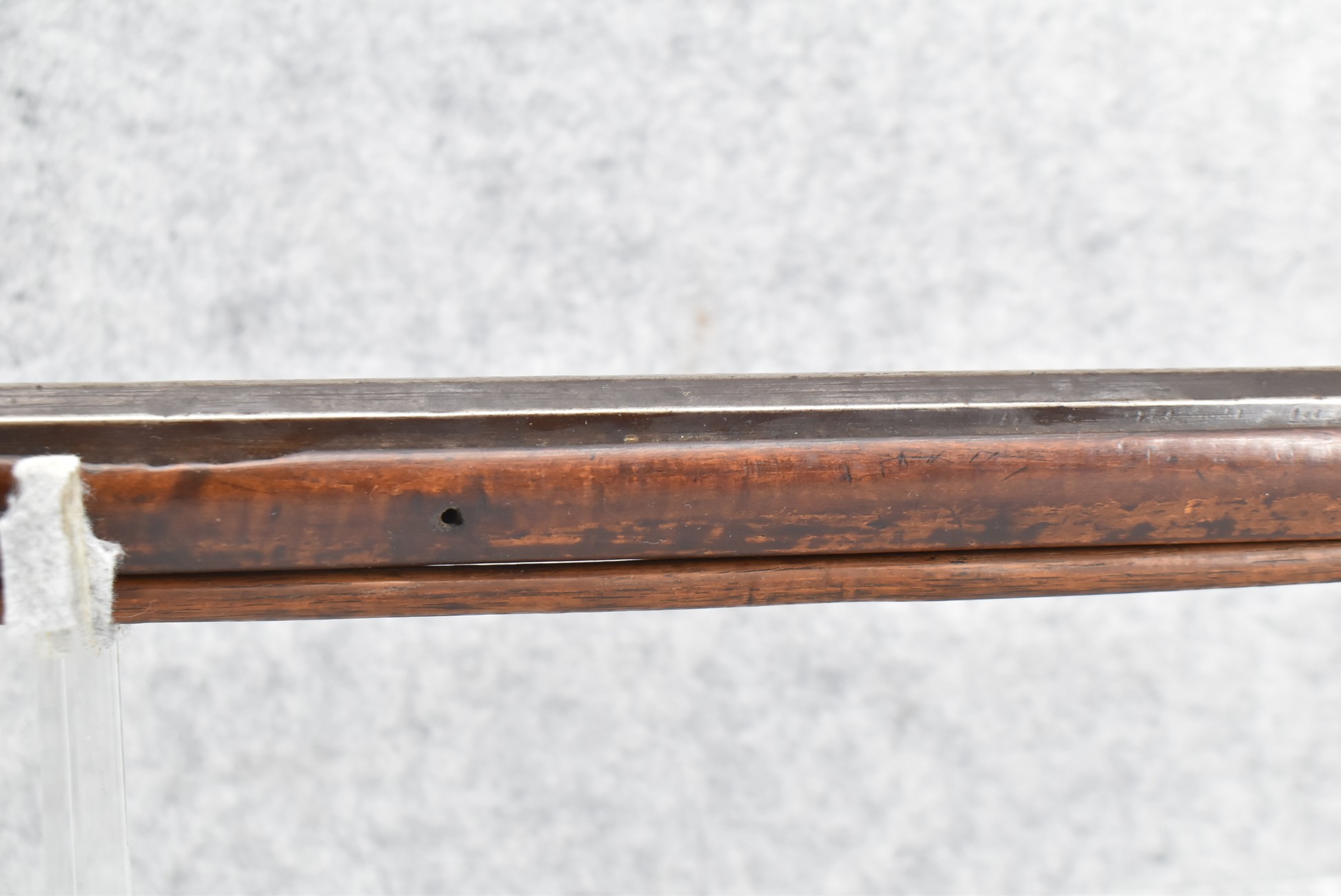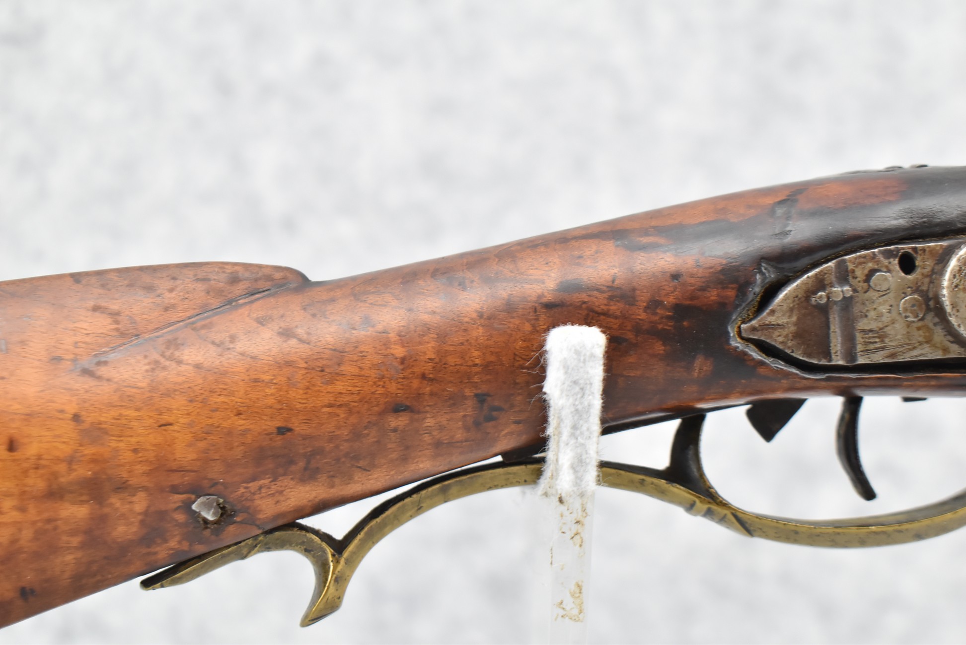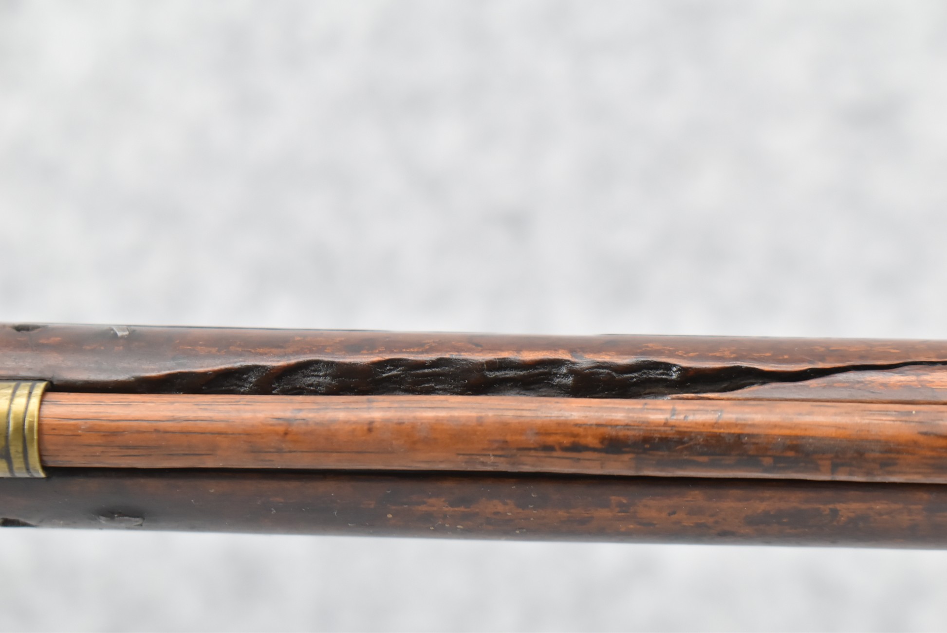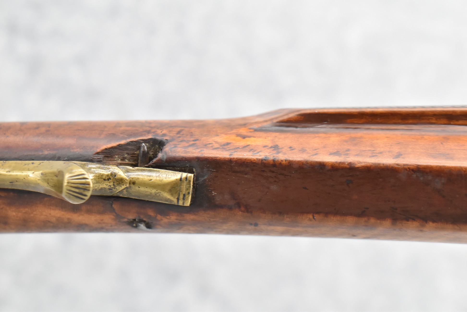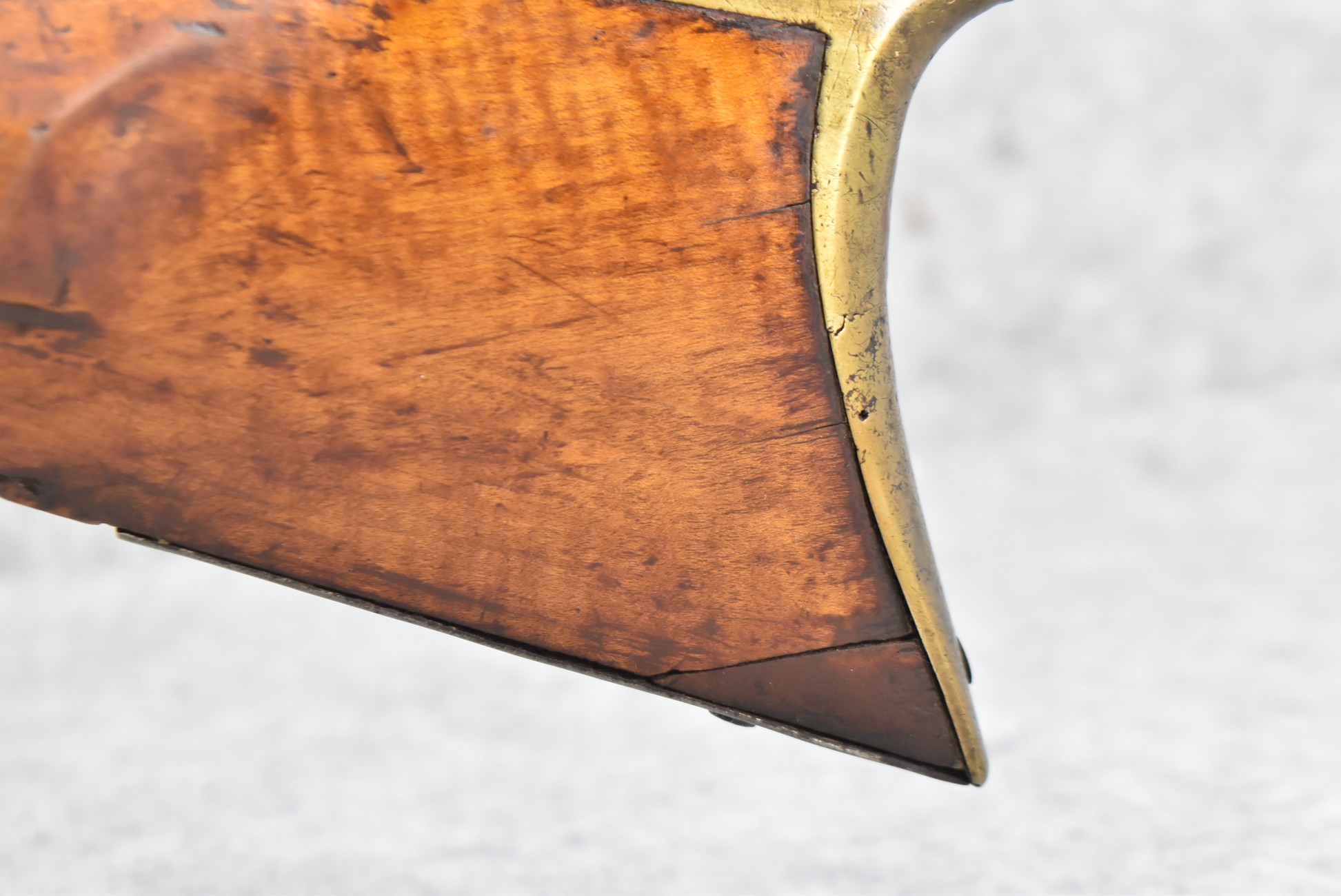 171. Full Stock Converted to Percussion 48 Cal. Kentucky Long Rifle – w/36 ½” Octagon Barrel w/Sights – Flintlock Converted to Percussion – w/Single Triggers – w/Replaced Trigger Guard, Toe Plate & Back Lock Plate – Note: Missing Wood & Crack on Fore Stock – Overall Length of 52”