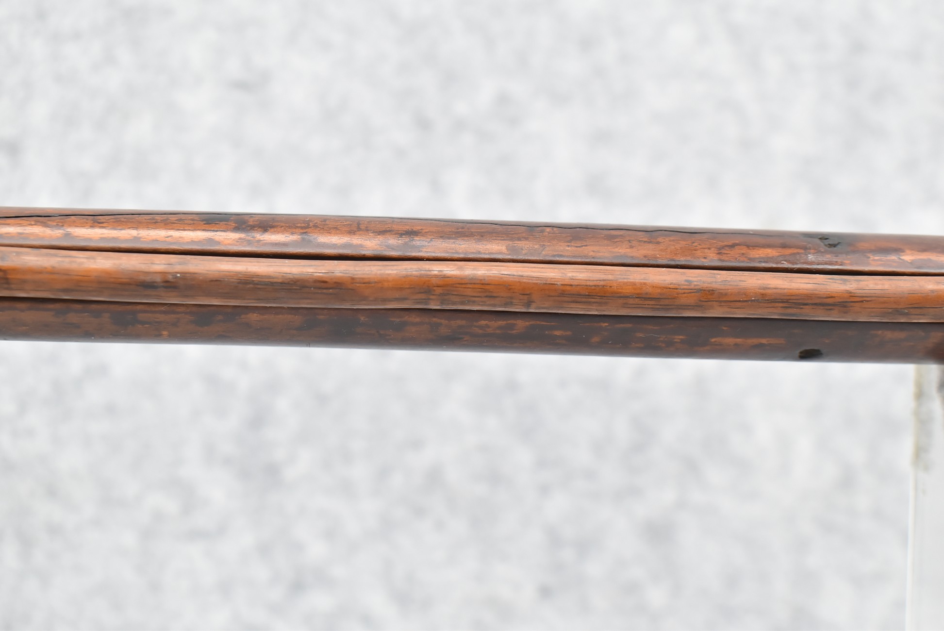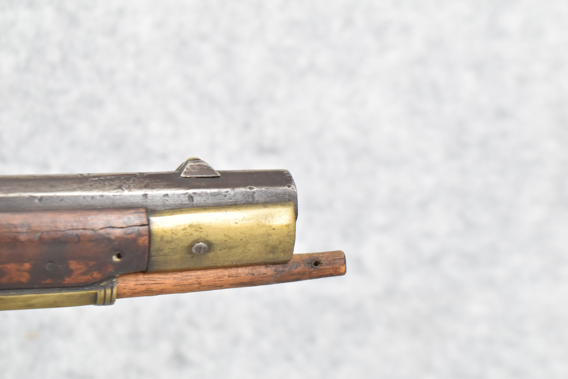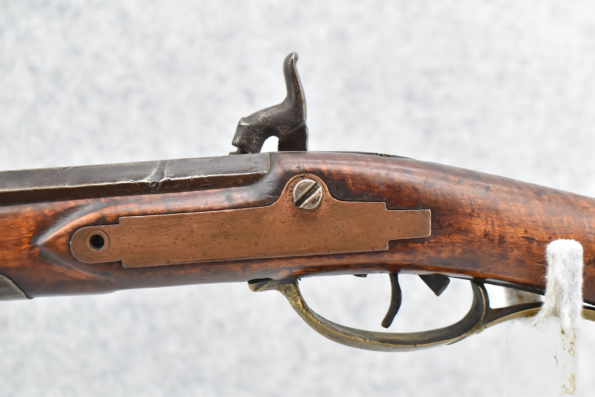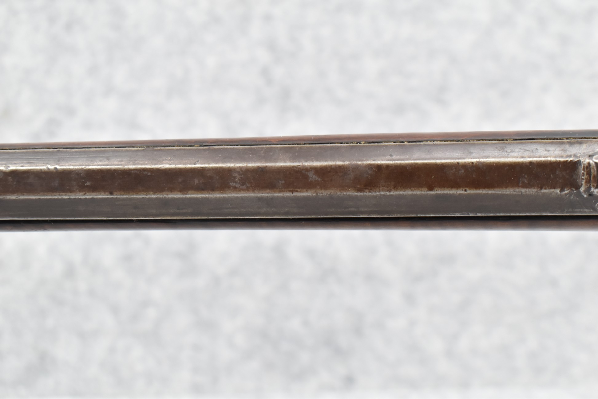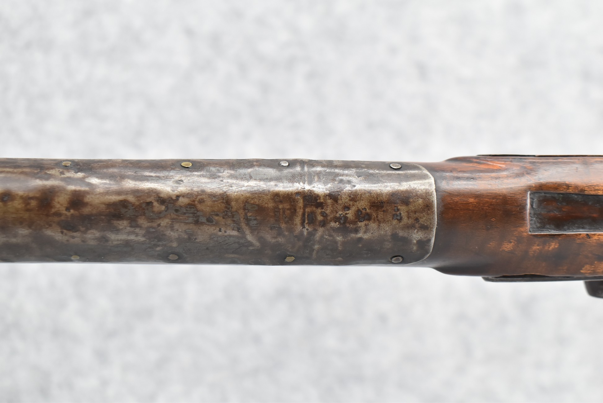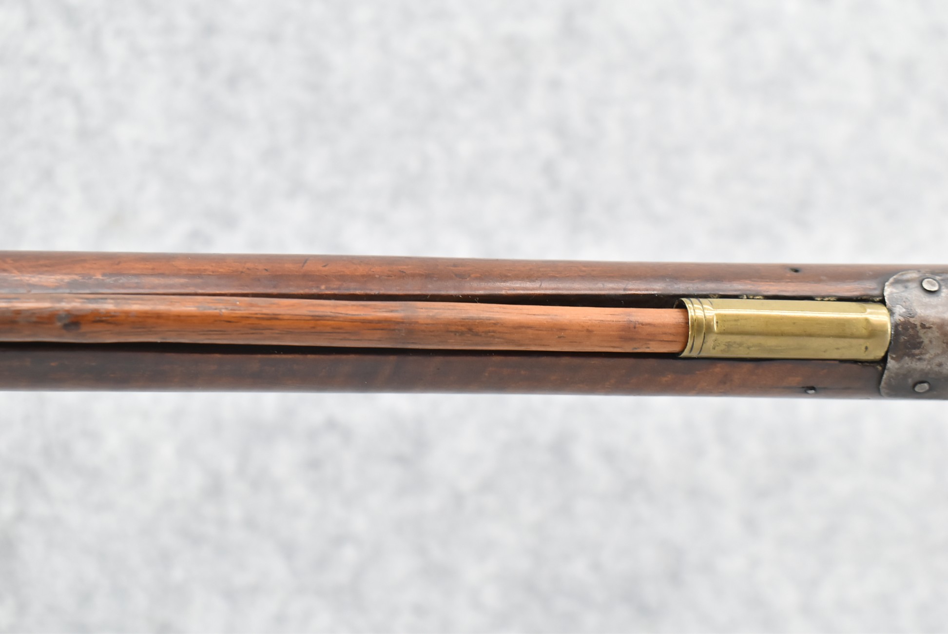 171. Full Stock Converted to Percussion 48 Cal. Kentucky Long Rifle – w/36 ½” Octagon Barrel w/Sights – Flintlock Converted to Percussion – w/Single Triggers – w/Replaced Trigger Guard, Toe Plate & Back Lock Plate – Note: Missing Wood & Crack on Fore Stock – Overall Length of 52”