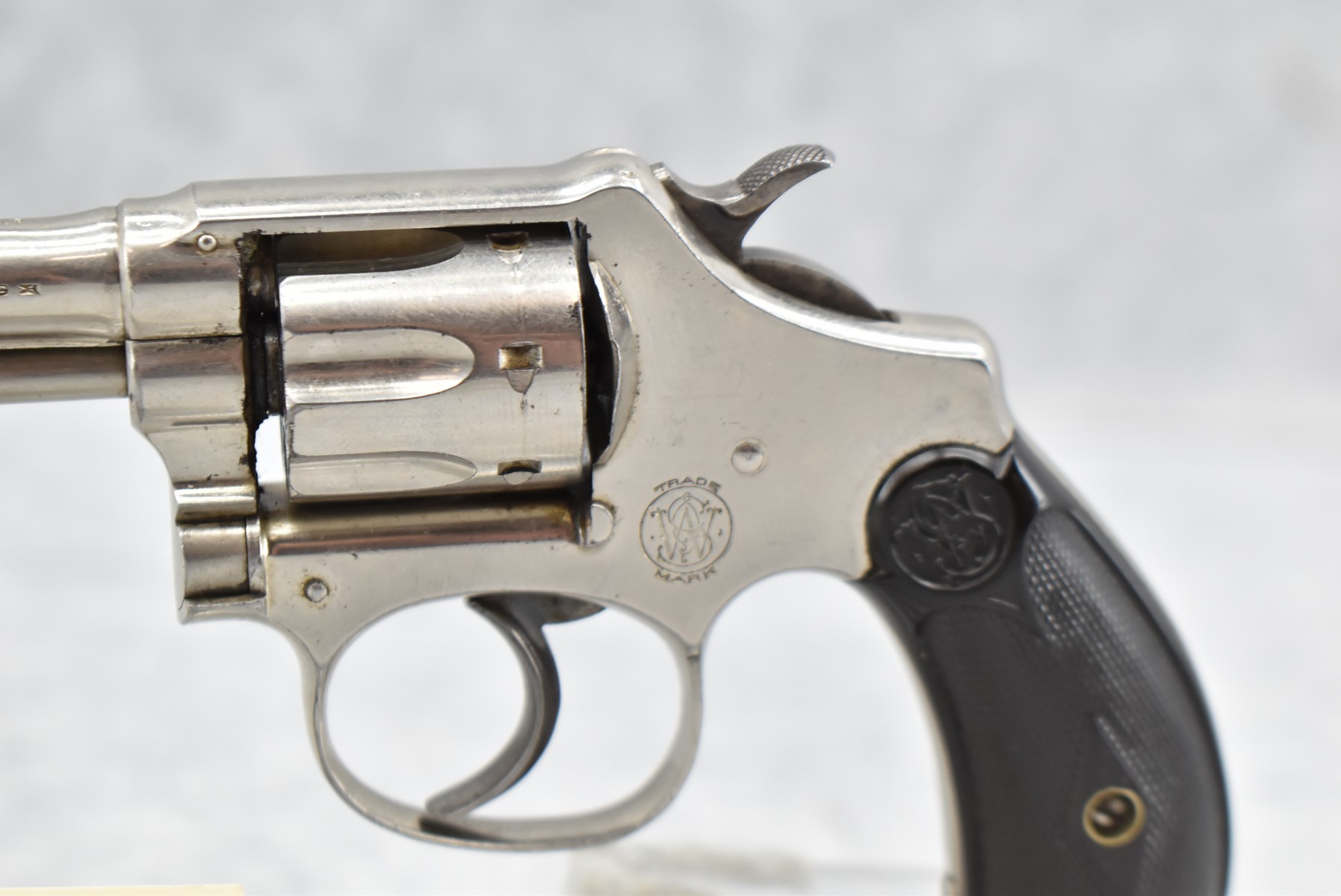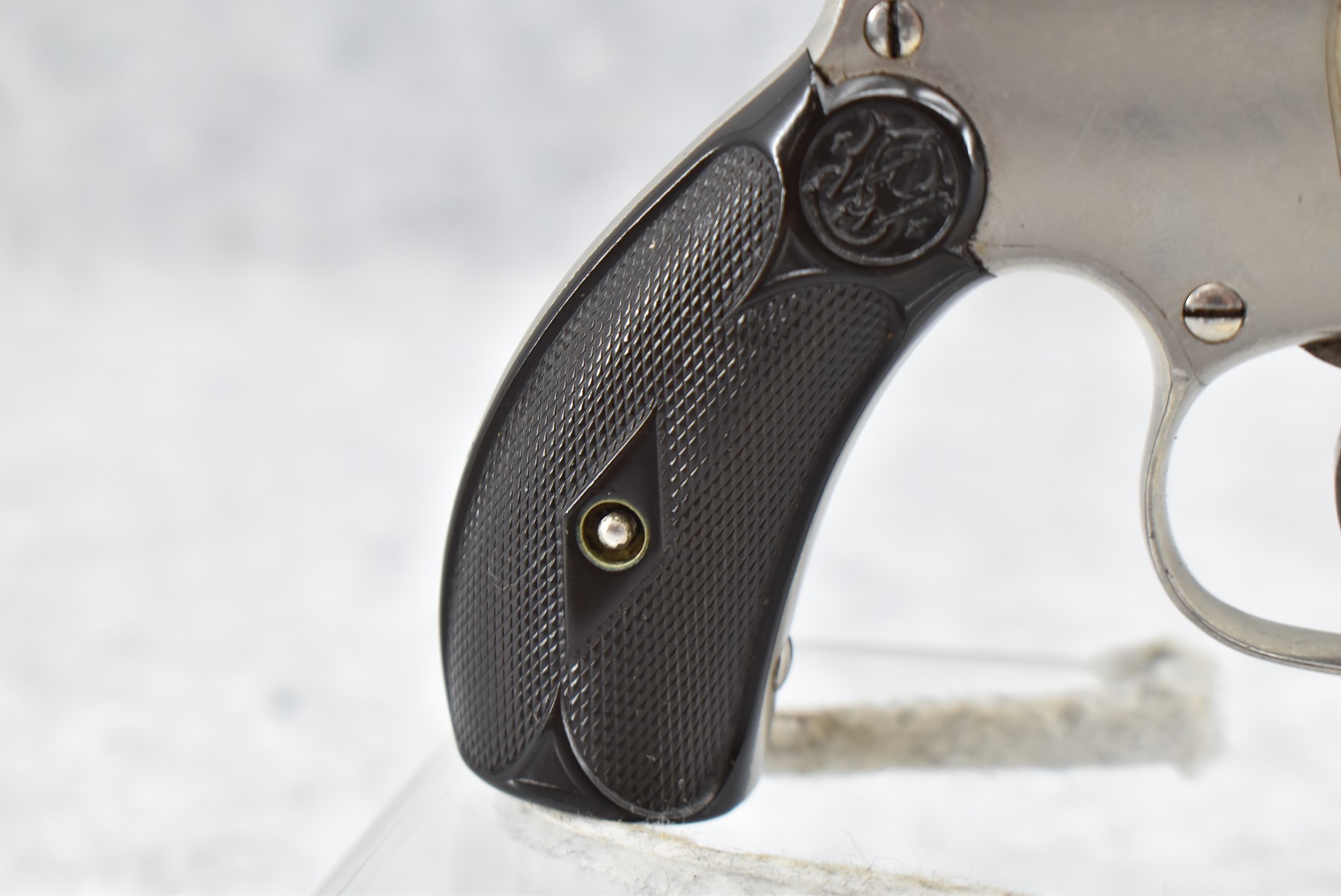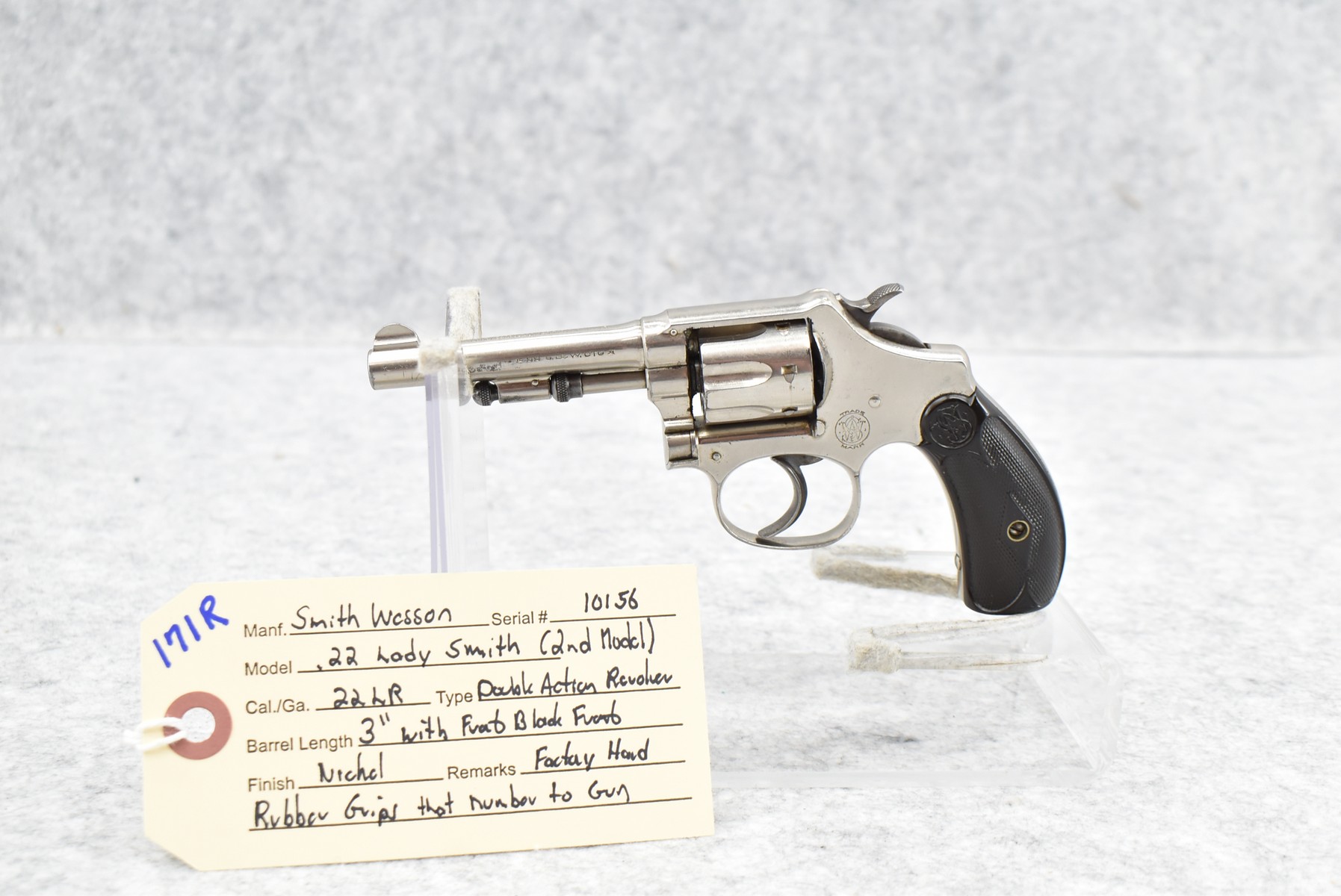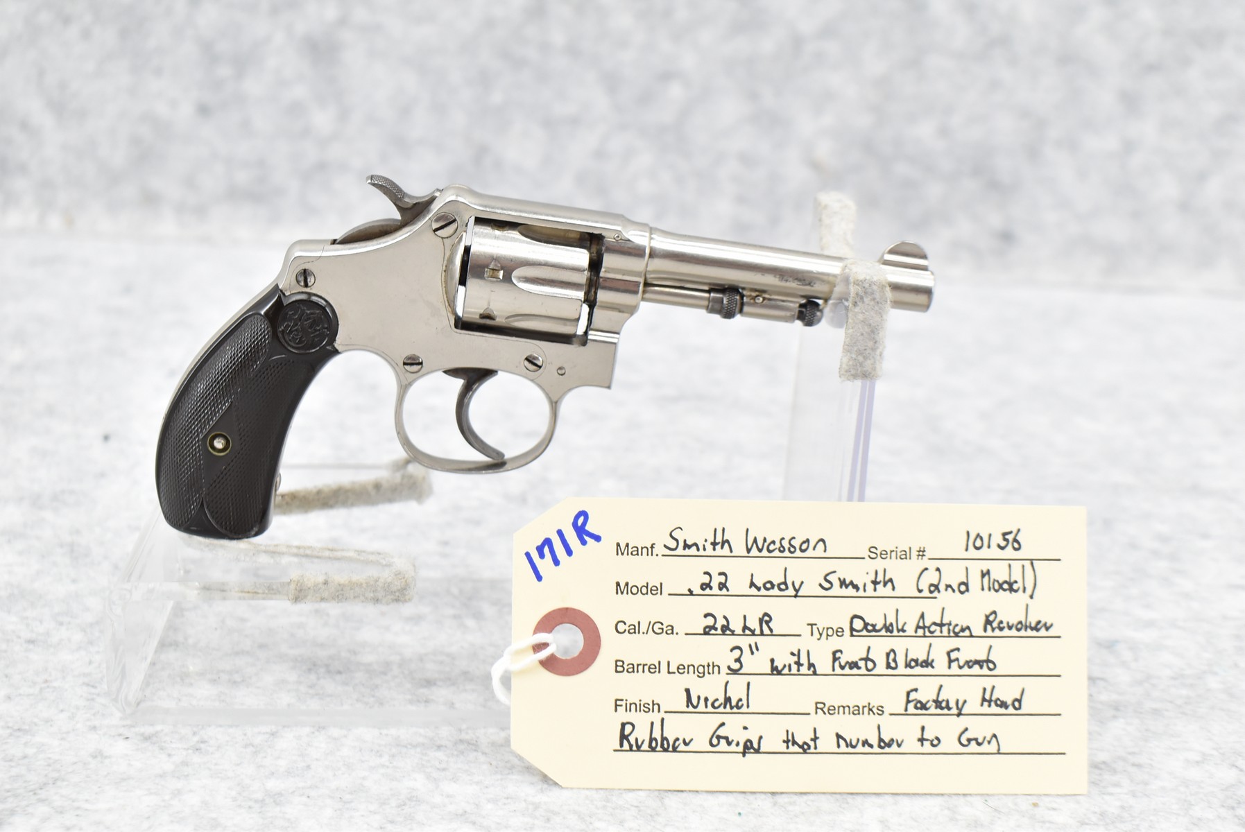 171R. Smith & Wesson – Mod. .22 Lady Smith (2nd Model) – 22LR Cal. Double Action Revolver – w/3” Barrel w/Front Blade Sight – Nickel Finish – w/Factory Hard Rubber Grips That Number to Gun