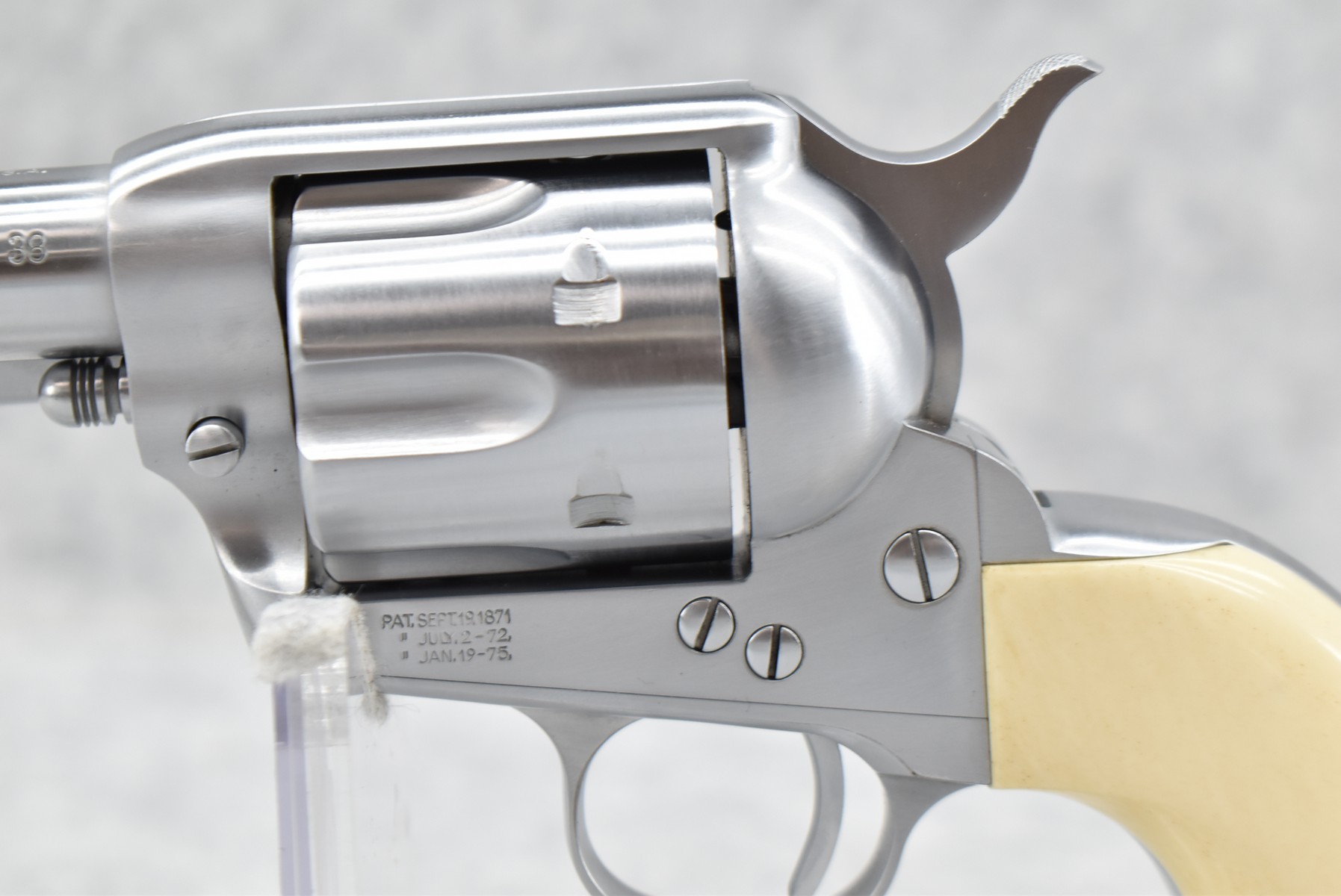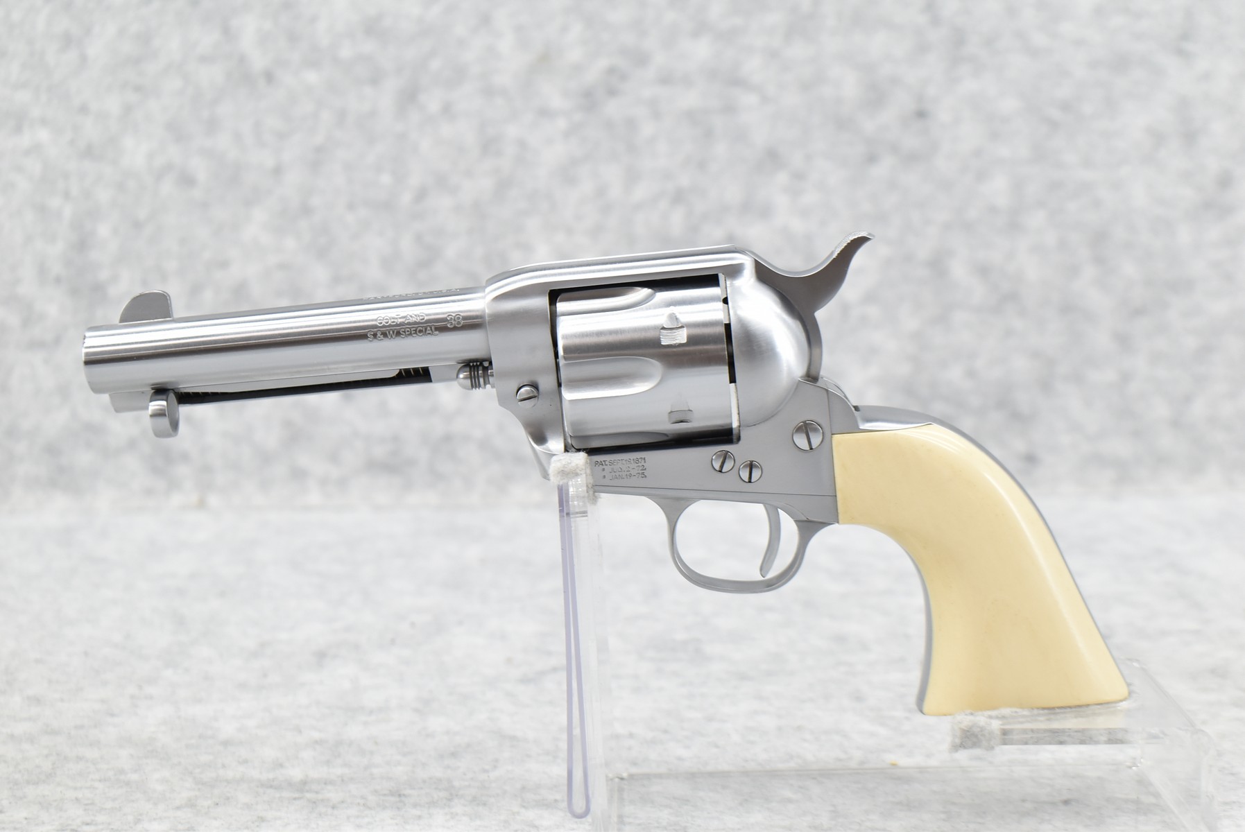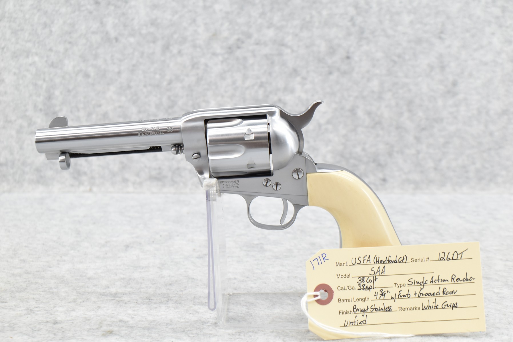 171R. USFA (Hartford, CT) – Mod. SAA – 38 Colt/38 Spl. Cal. Single Action Revolver – w/4 ¾” Barrel w/Front & Grooved Rear Sights – Bright Stainless Finish – w/White Grips – Unfired