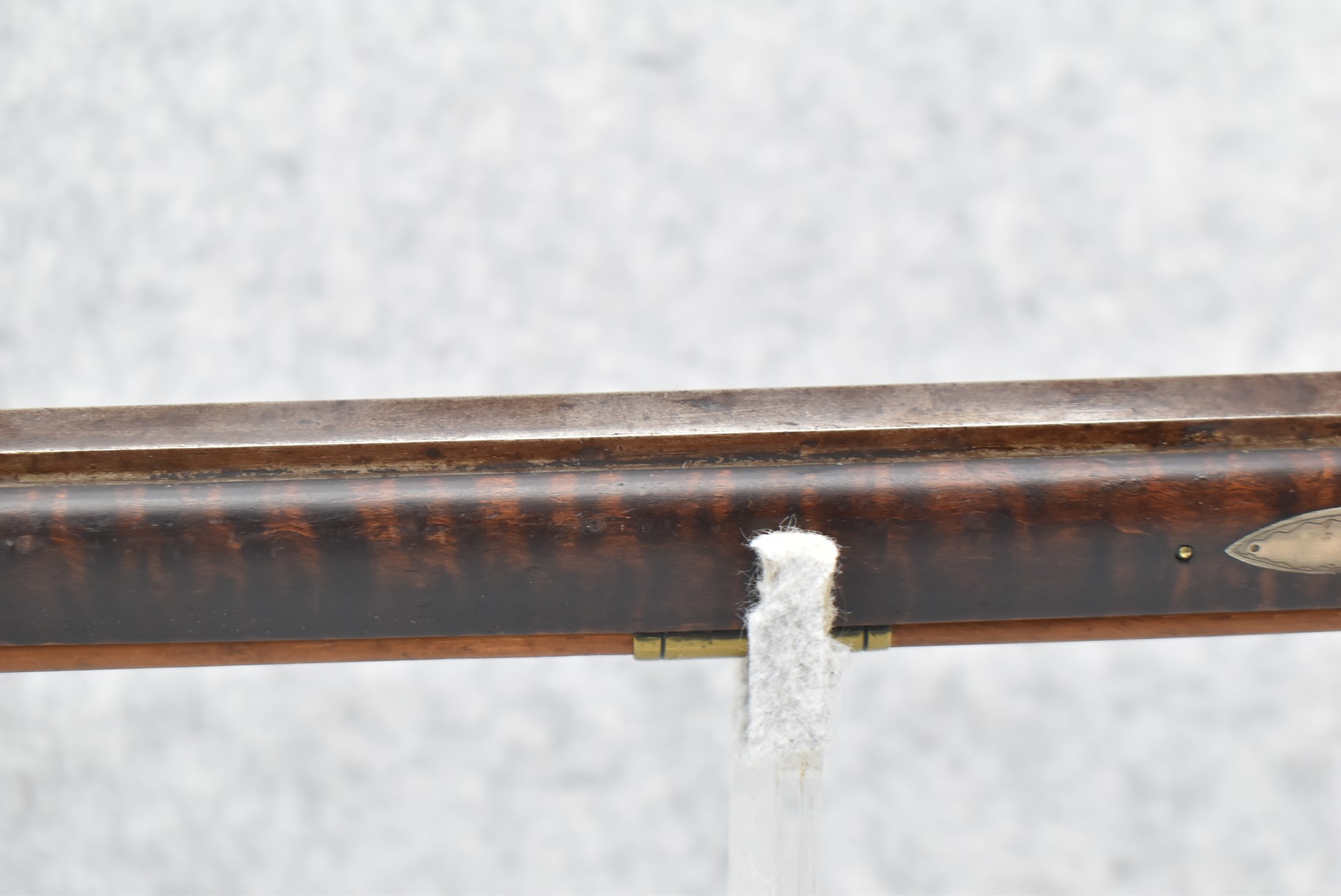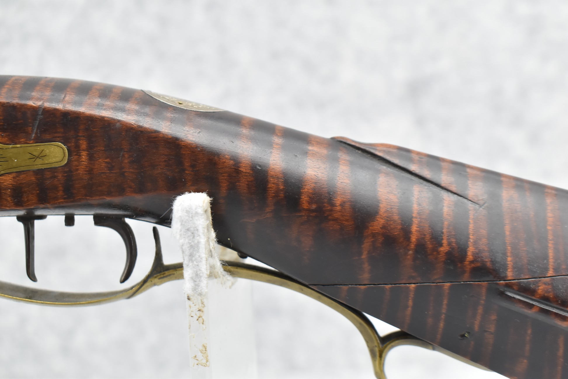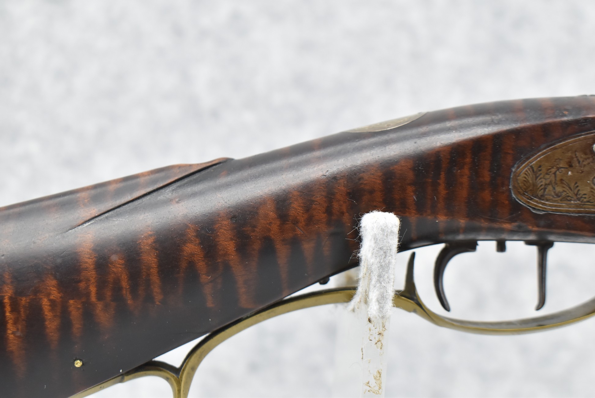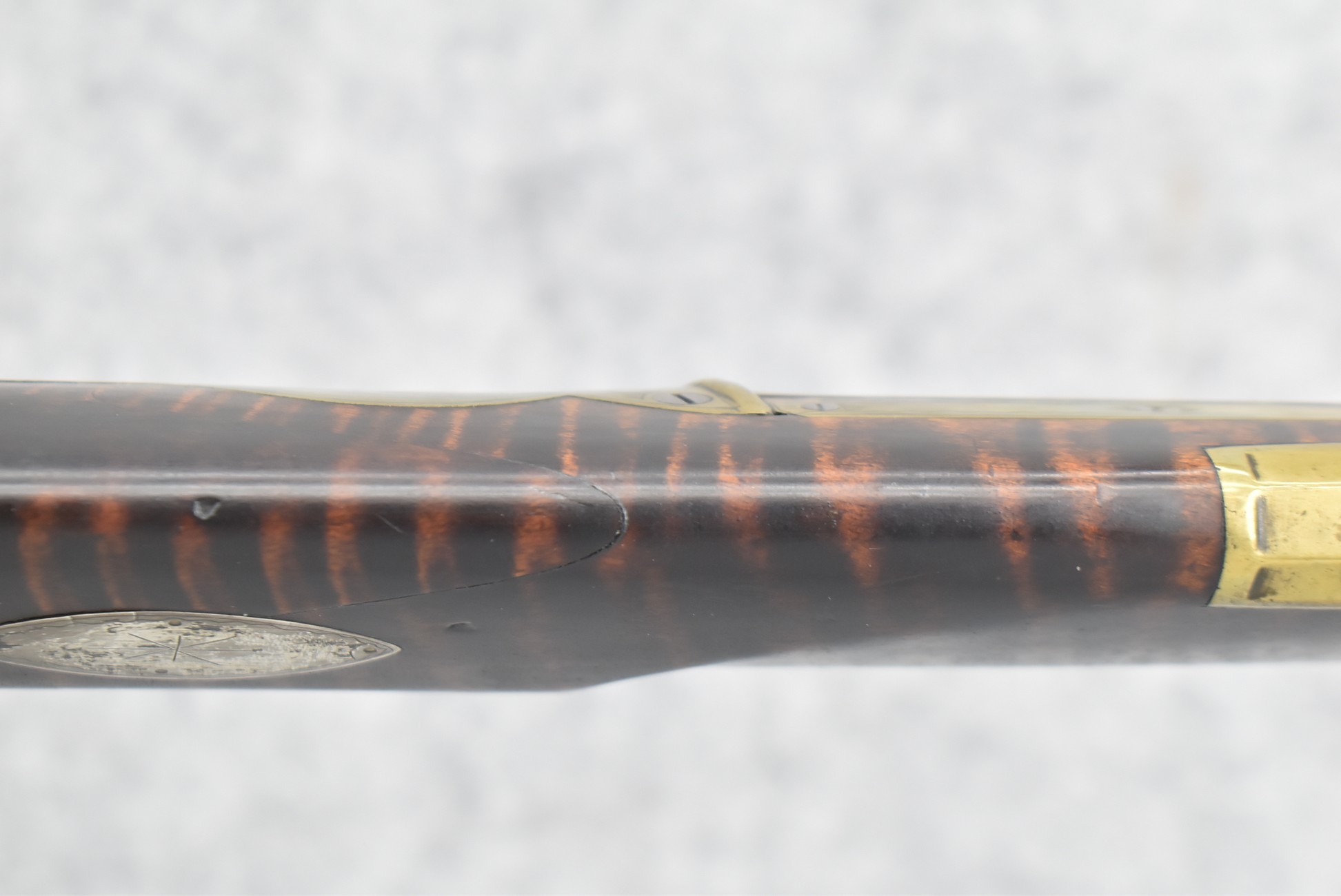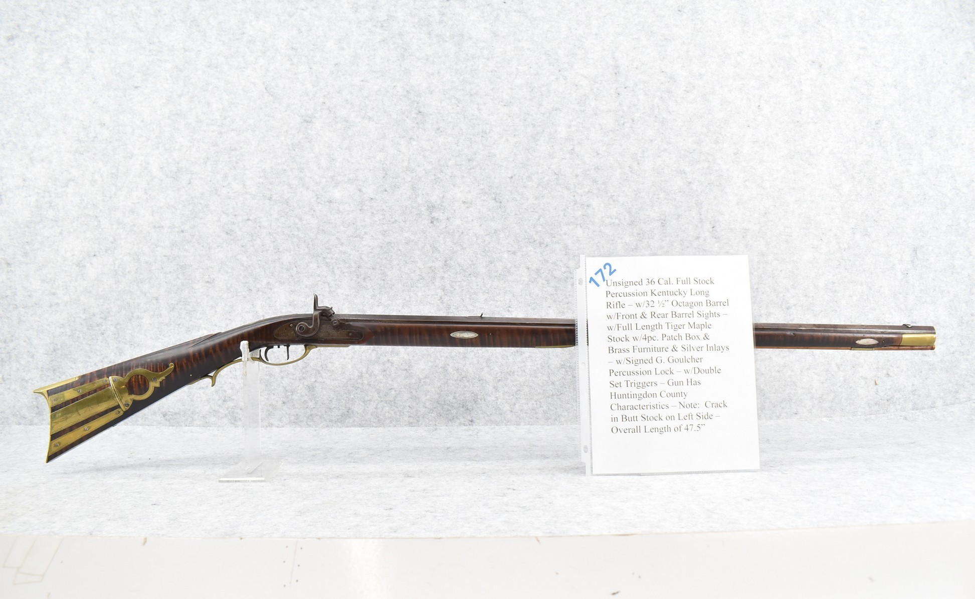 172. Unsigned 36 Cal. Full Stock Percussion Kentucky Long Rifle – w/32 ½” Octagon Barrel w/Front & Rear Barrel Sights – w/Full Length Tiger Maple Stock w/4pc. Patch Box & Brass Furniture & Silver Inlays – w/Signed G. Goulcher Percussion Lock – w/Double Set Triggers – Gun Has Huntingdon County Characteristics – Note: Crack in Butt Stock on Left Side – Overall Length of 47.5″