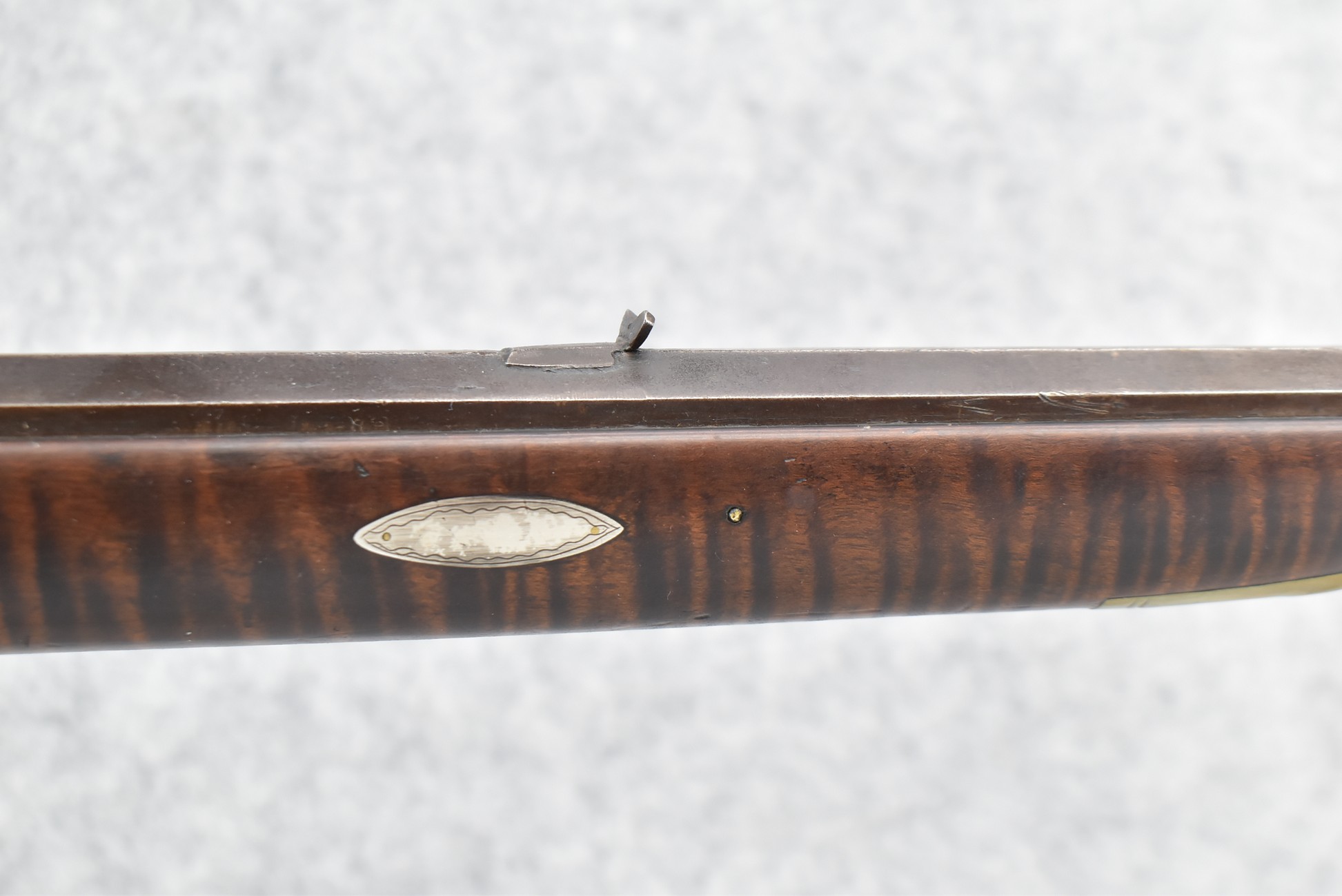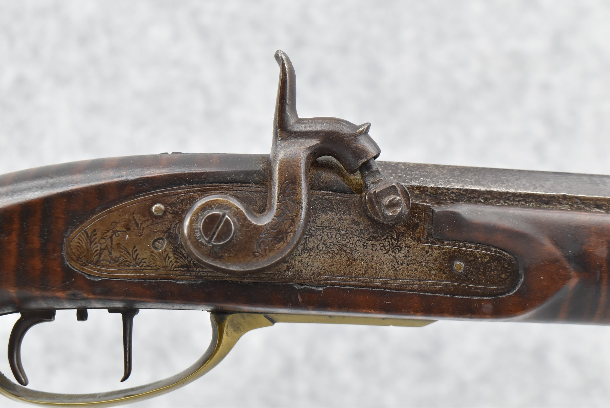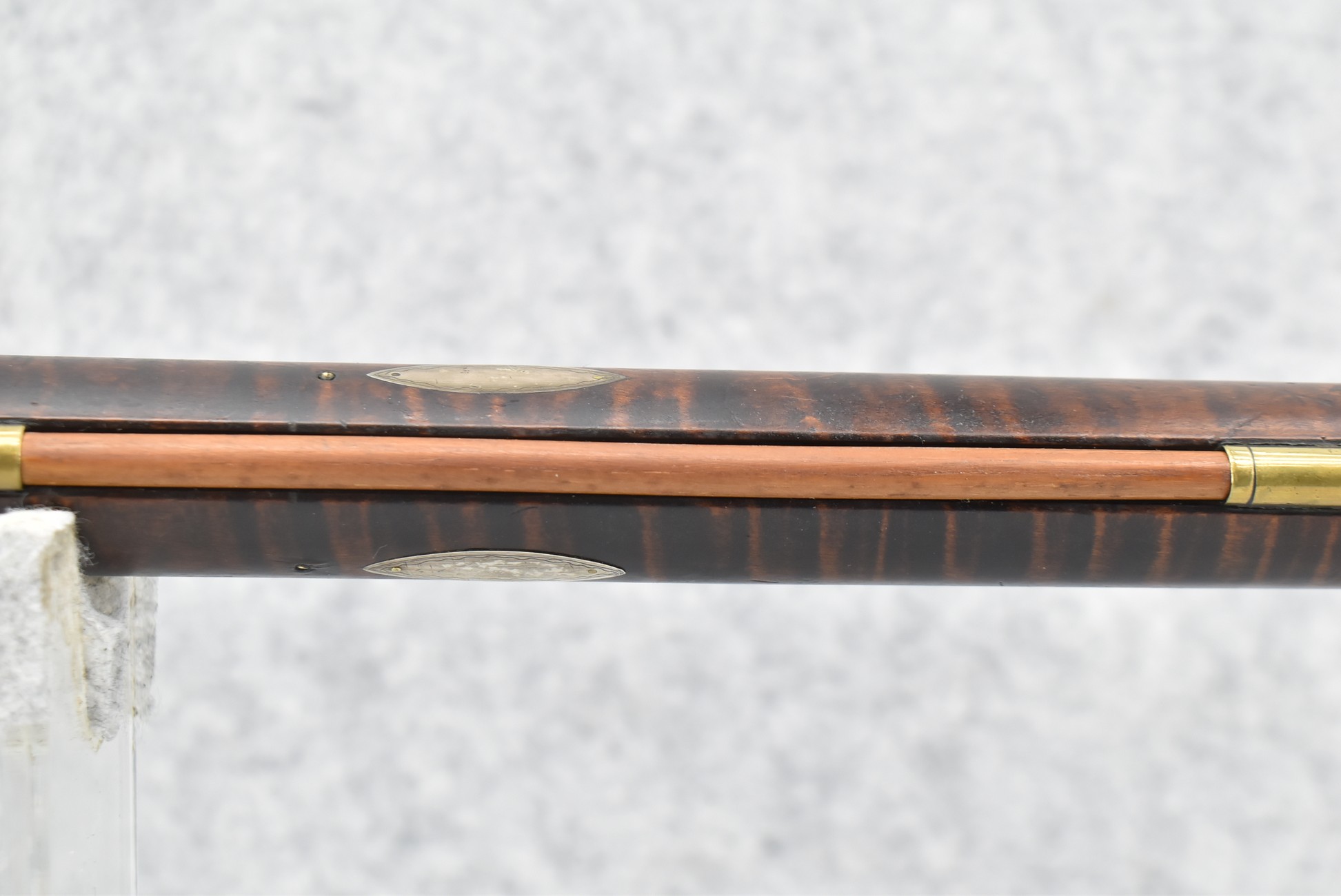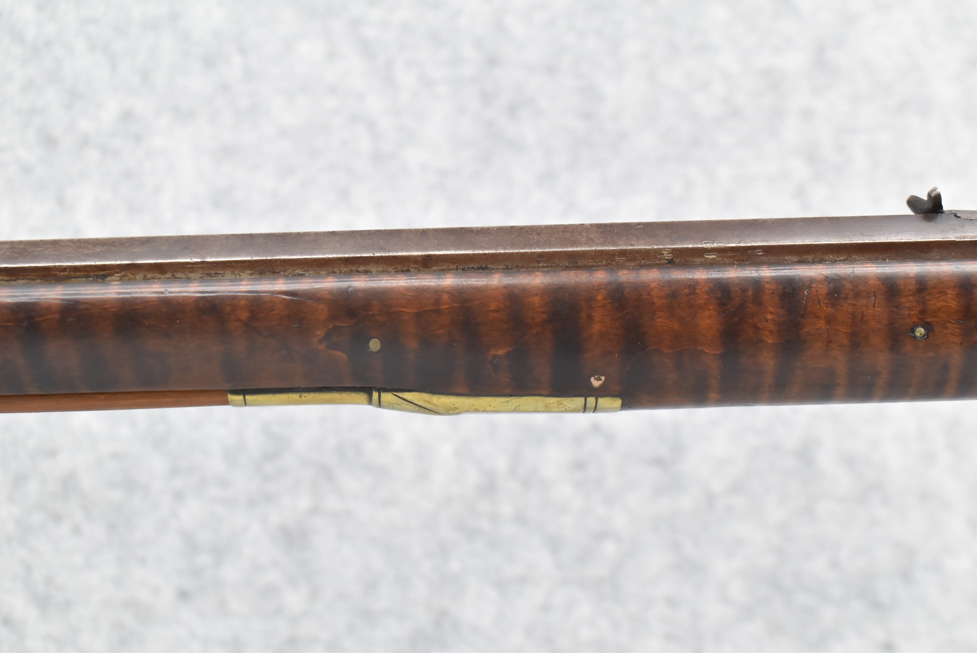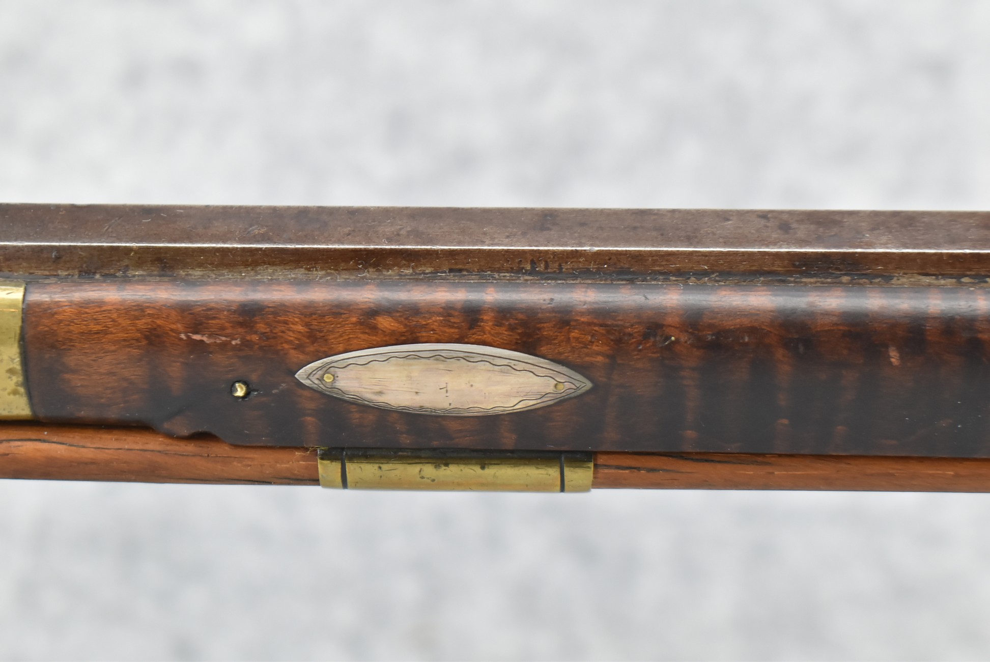 172. Unsigned 36 Cal. Full Stock Percussion Kentucky Long Rifle – w/32 ½” Octagon Barrel w/Front & Rear Barrel Sights – w/Full Length Tiger Maple Stock w/4pc. Patch Box & Brass Furniture & Silver Inlays – w/Signed G. Goulcher Percussion Lock – w/Double Set Triggers – Gun Has Huntingdon County Characteristics – Note: Crack in Butt Stock on Left Side – Overall Length of 47.5″