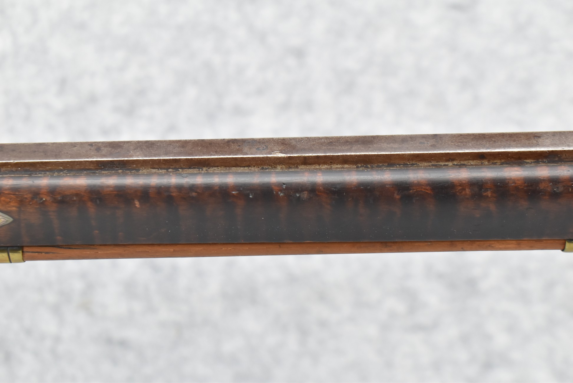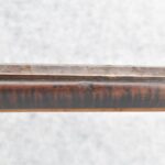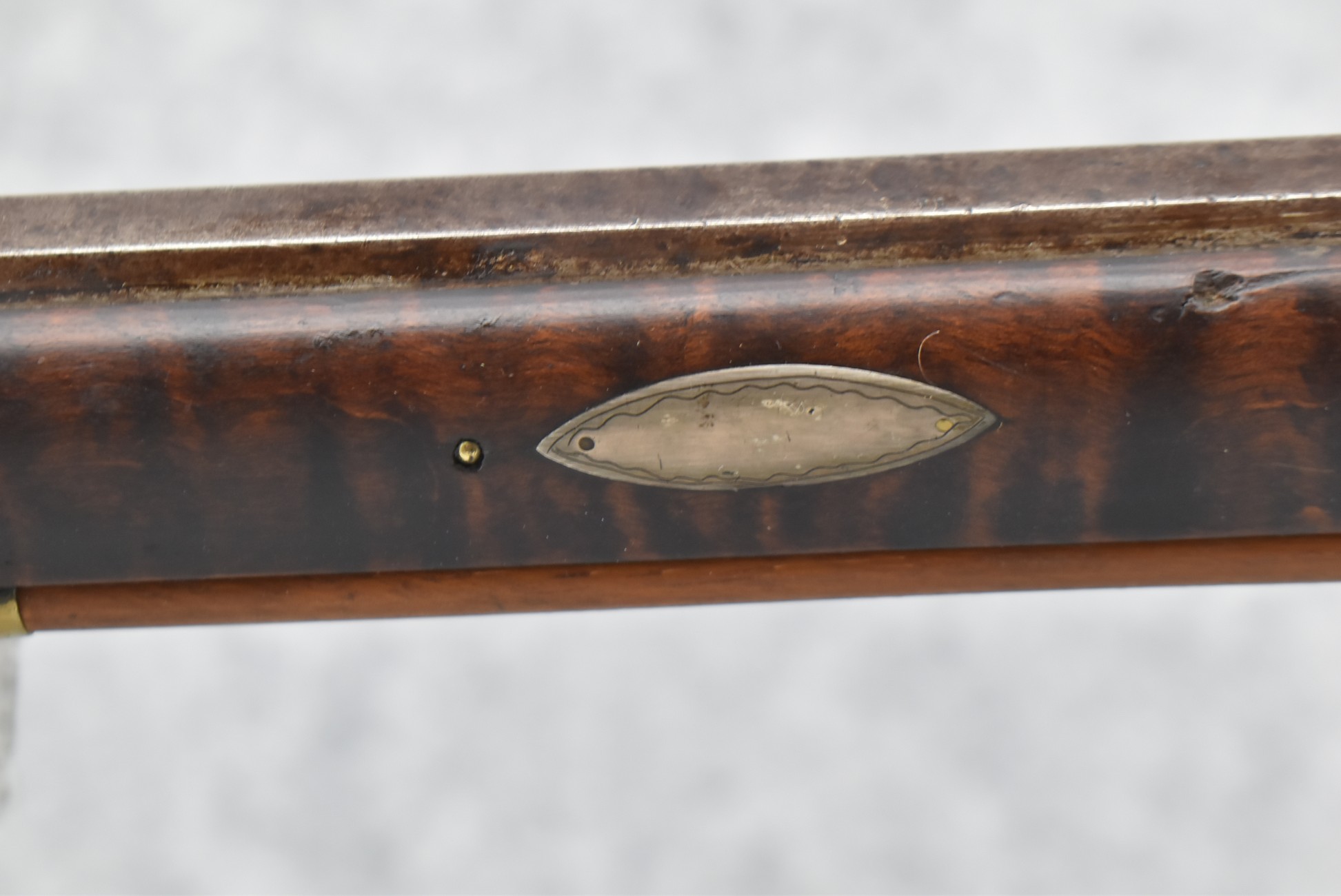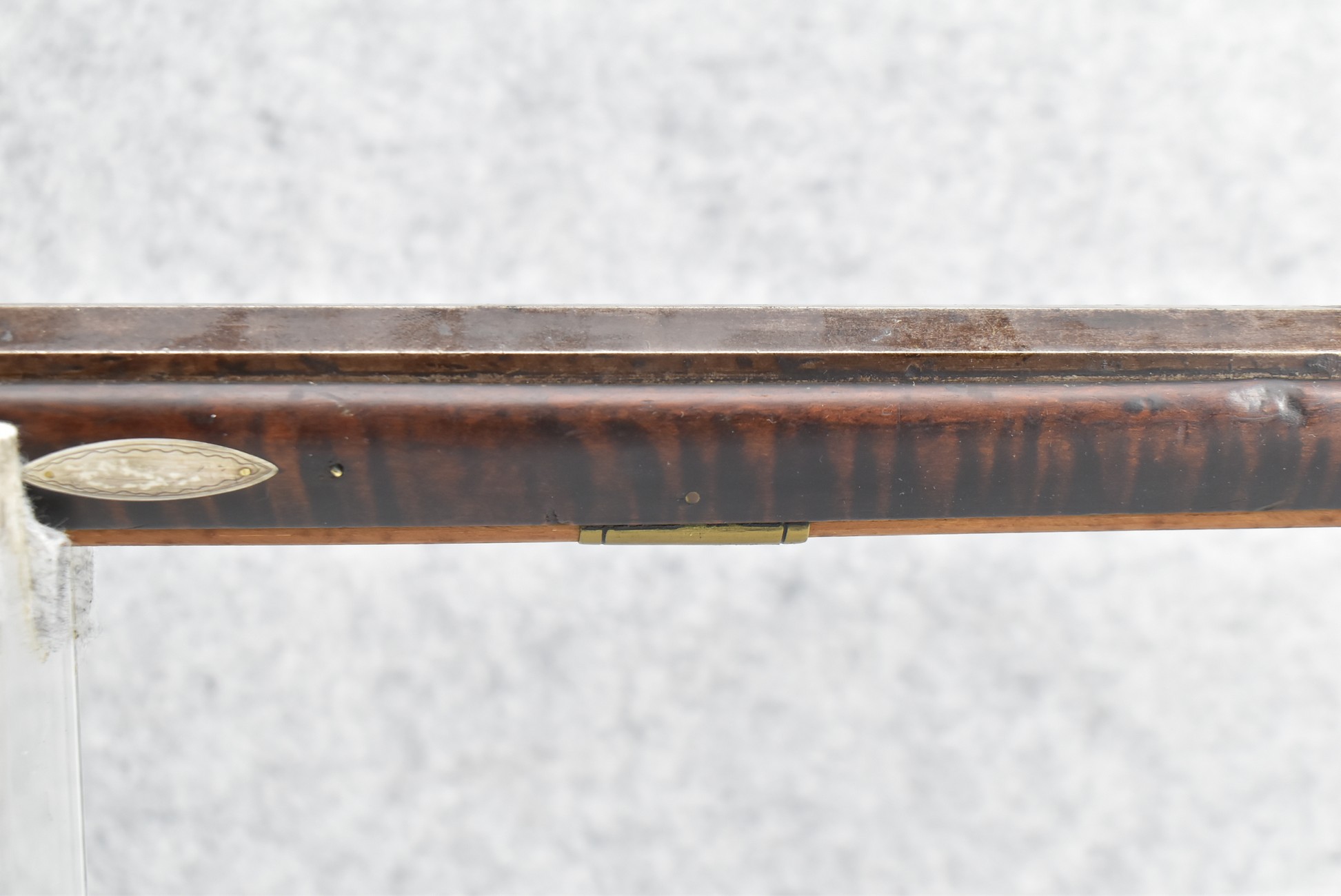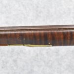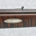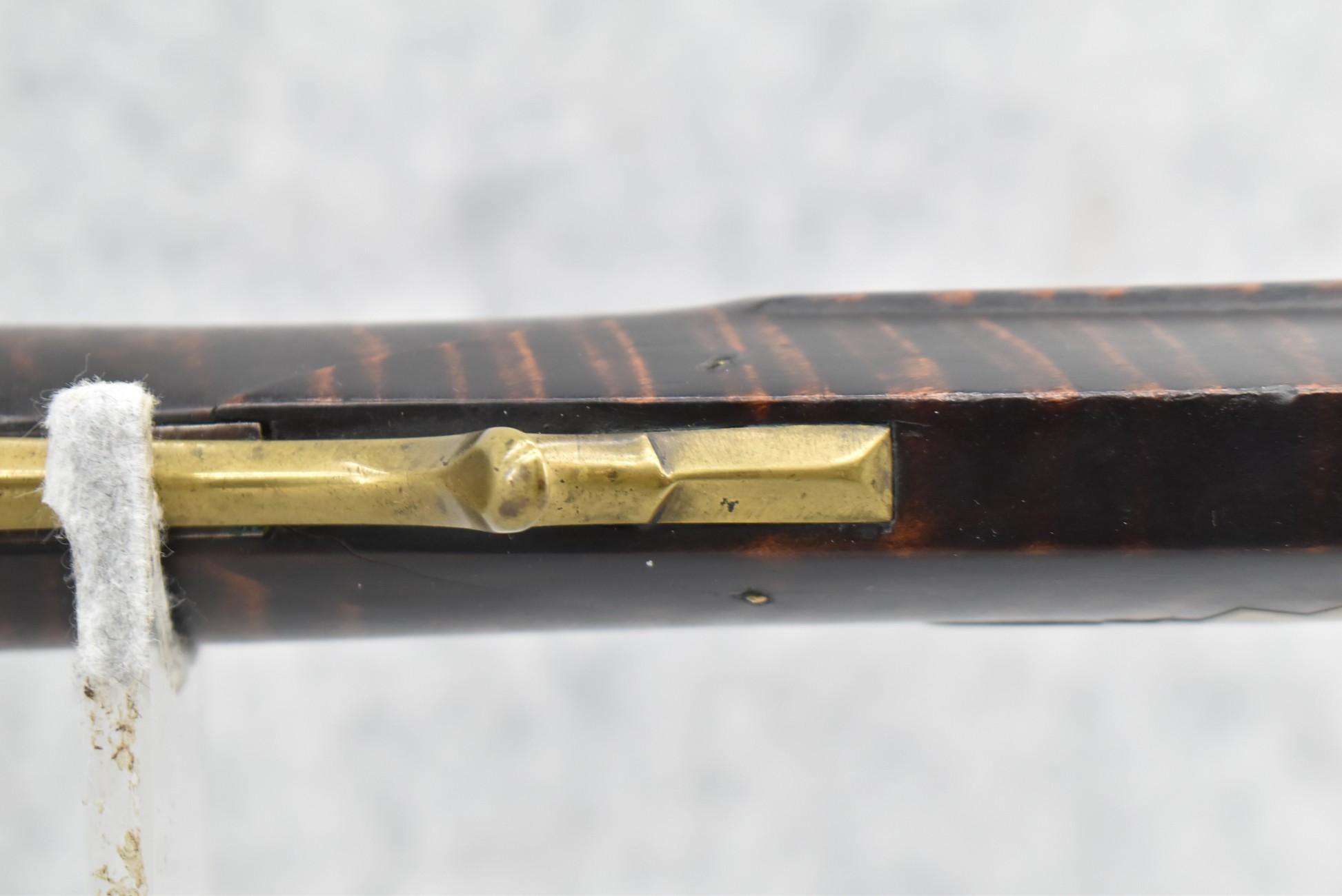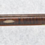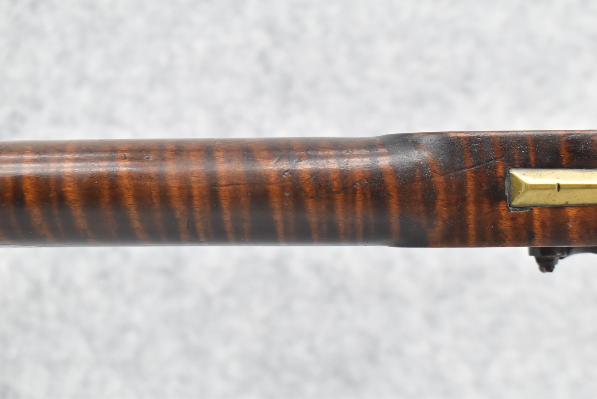 172. Unsigned 36 Cal. Full Stock Percussion Kentucky Long Rifle – w/32 ½” Octagon Barrel w/Front & Rear Barrel Sights – w/Full Length Tiger Maple Stock w/4pc. Patch Box & Brass Furniture & Silver Inlays – w/Signed G. Goulcher Percussion Lock – w/Double Set Triggers – Gun Has Huntingdon County Characteristics – Note: Crack in Butt Stock on Left Side – Overall Length of 47.5″