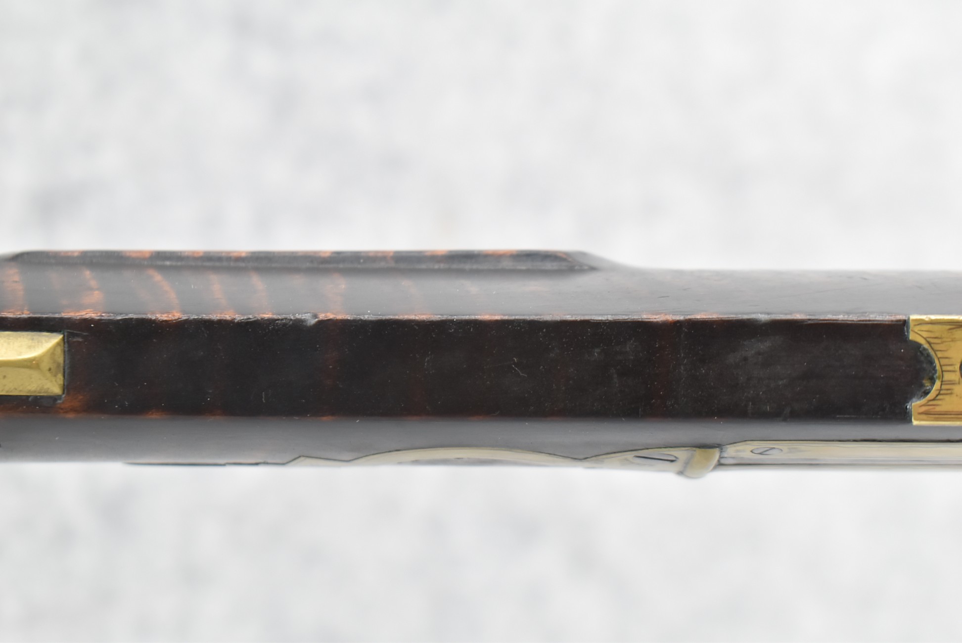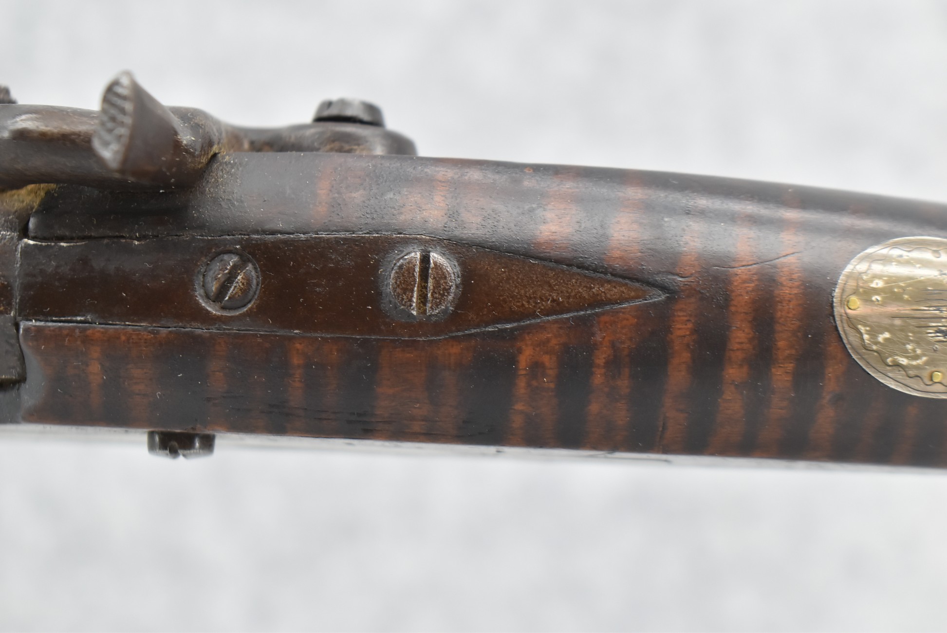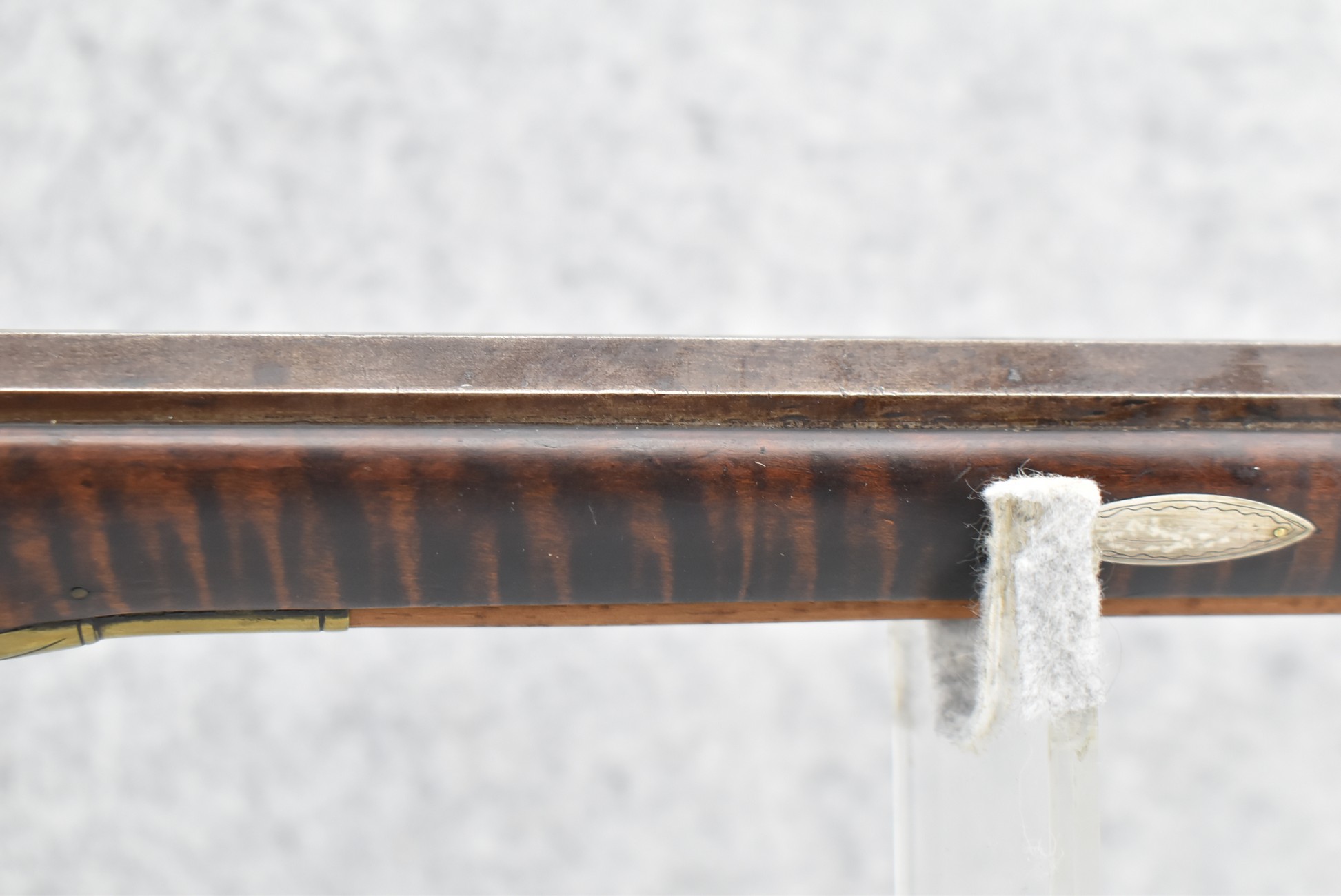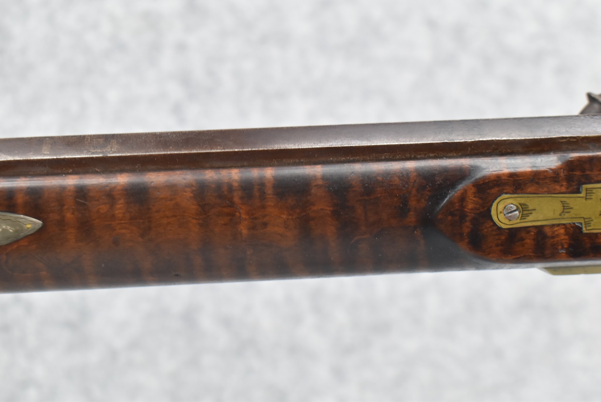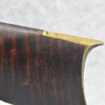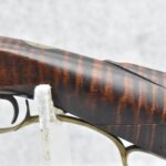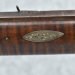 172. Unsigned 36 Cal. Full Stock Percussion Kentucky Long Rifle – w/32 ½” Octagon Barrel w/Front & Rear Barrel Sights – w/Full Length Tiger Maple Stock w/4pc. Patch Box & Brass Furniture & Silver Inlays – w/Signed G. Goulcher Percussion Lock – w/Double Set Triggers – Gun Has Huntingdon County Characteristics – Note: Crack in Butt Stock on Left Side – Overall Length of 47.5″