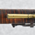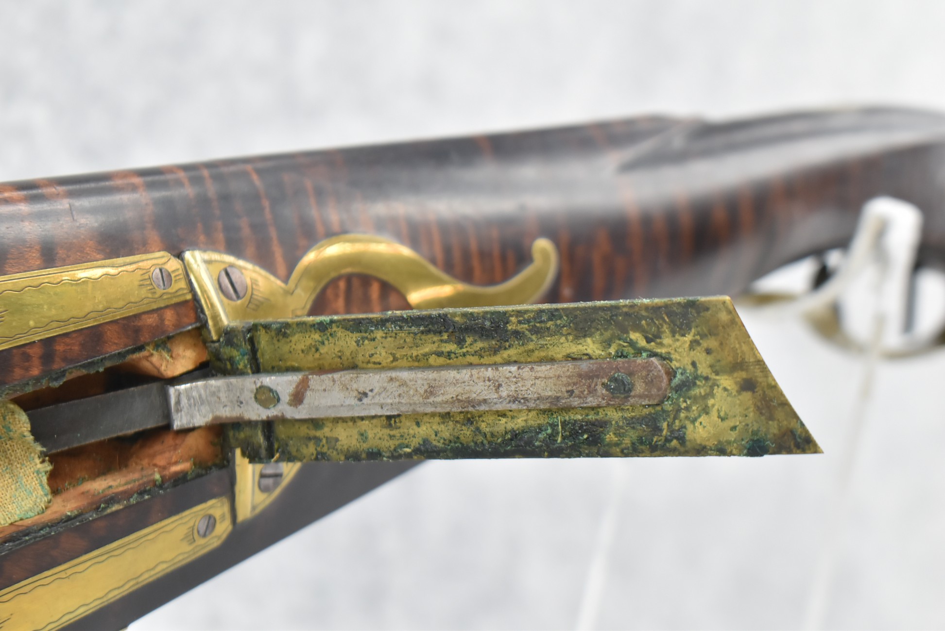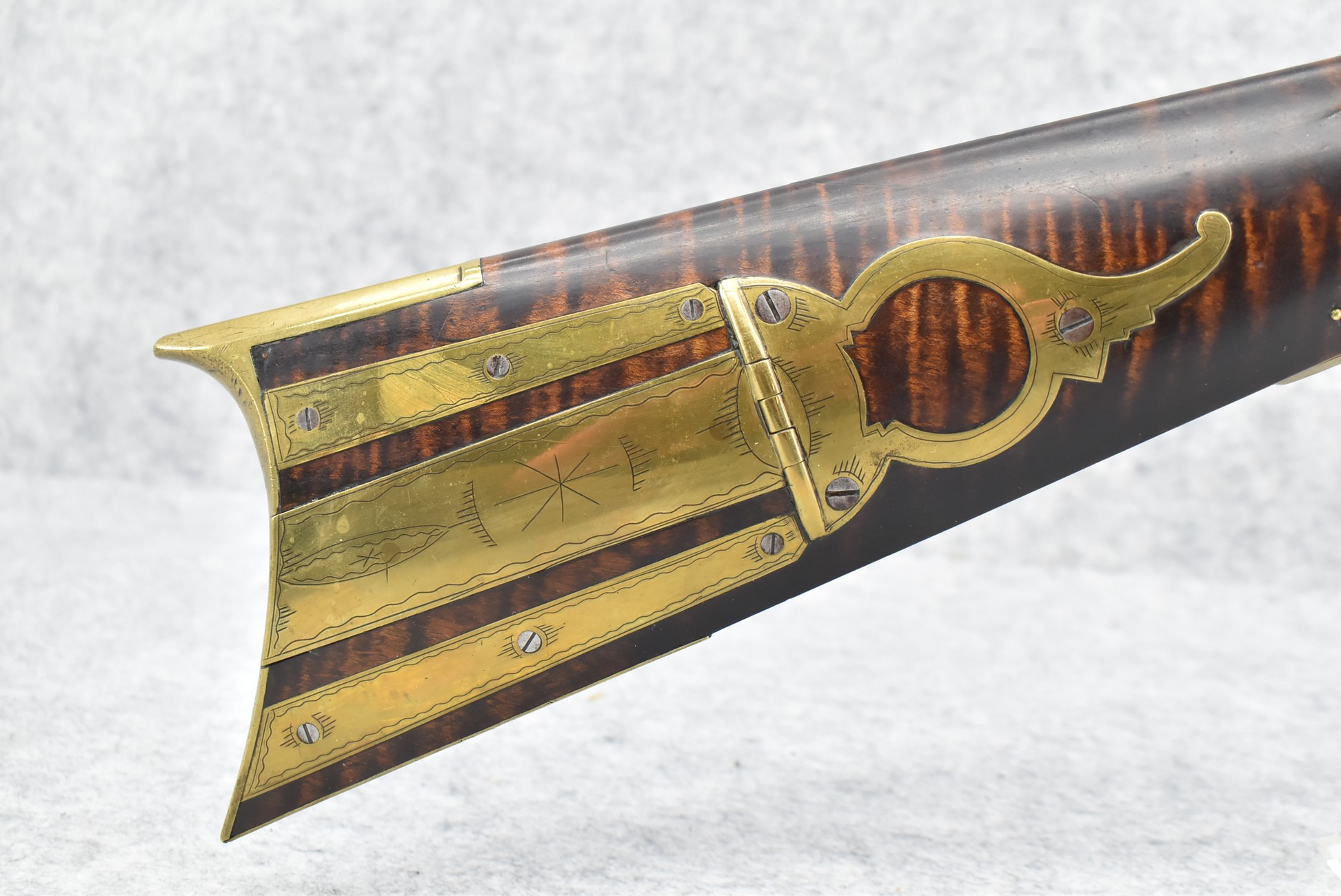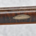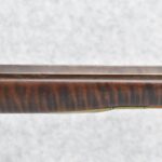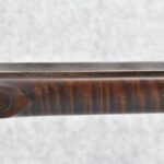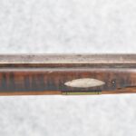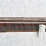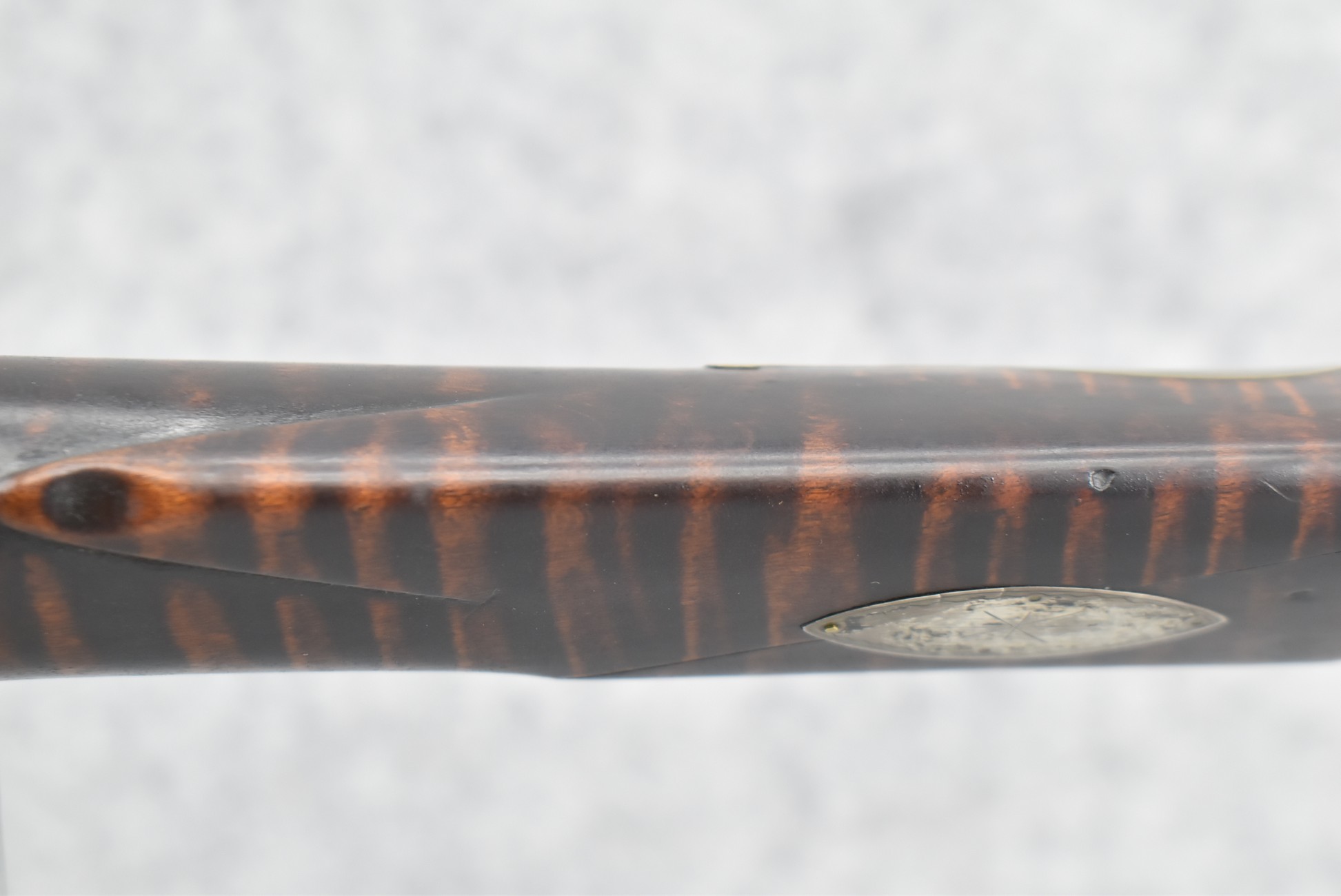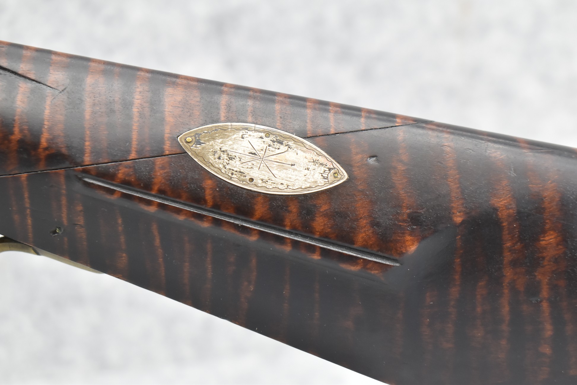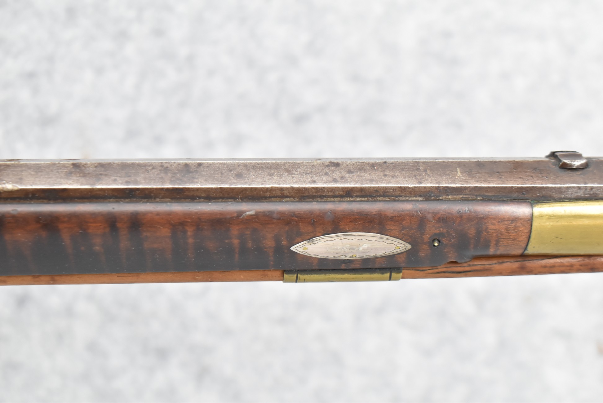172. Unsigned 36 Cal. Full Stock Percussion Kentucky Long Rifle – w/32 ½” Octagon Barrel w/Front & Rear Barrel Sights – w/Full Length Tiger Maple Stock w/4pc. Patch Box & Brass Furniture & Silver Inlays – w/Signed G. Goulcher Percussion Lock – w/Double Set Triggers – Gun Has Huntingdon County Characteristics – Note: Crack in Butt Stock on Left Side – Overall Length of 47.5″