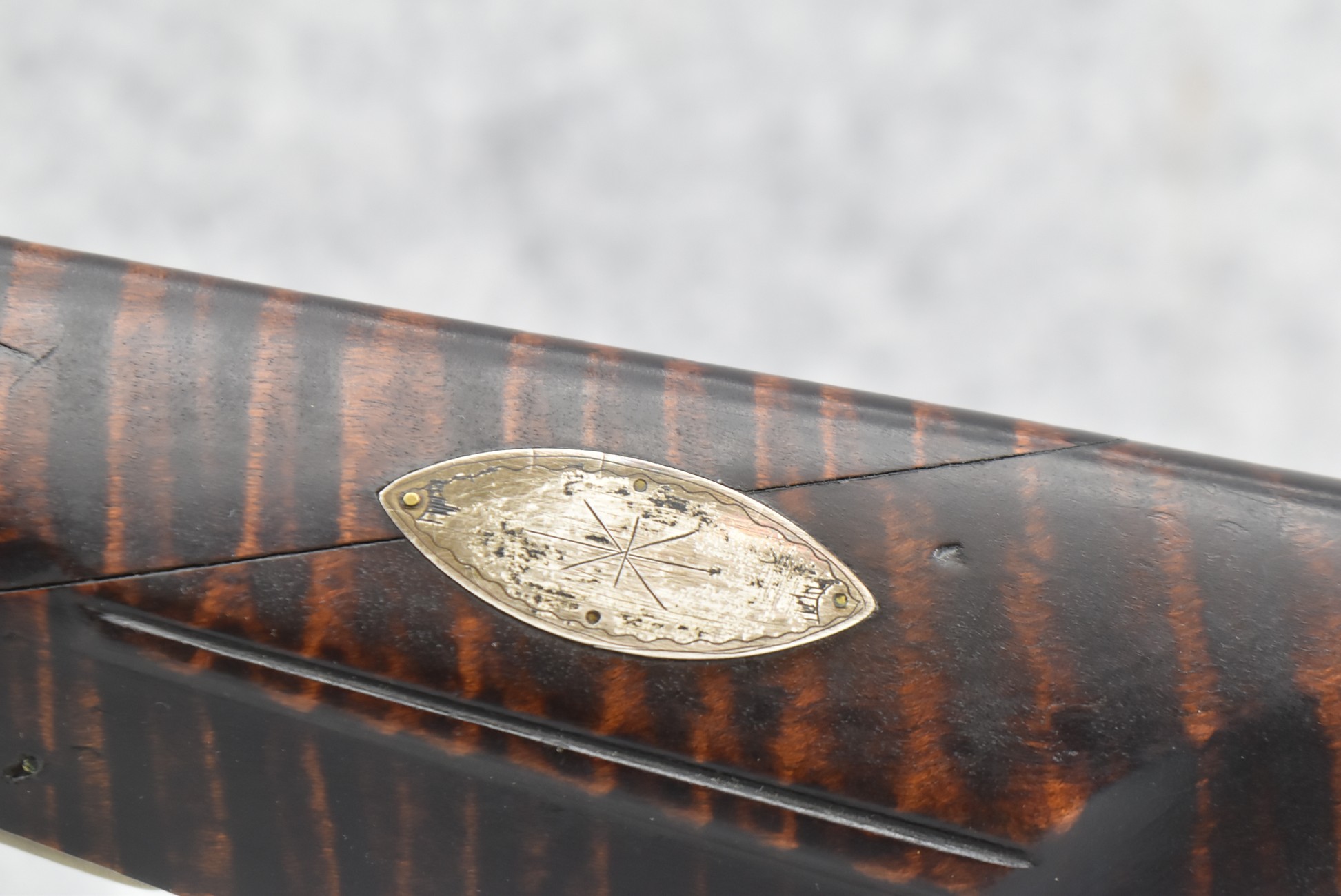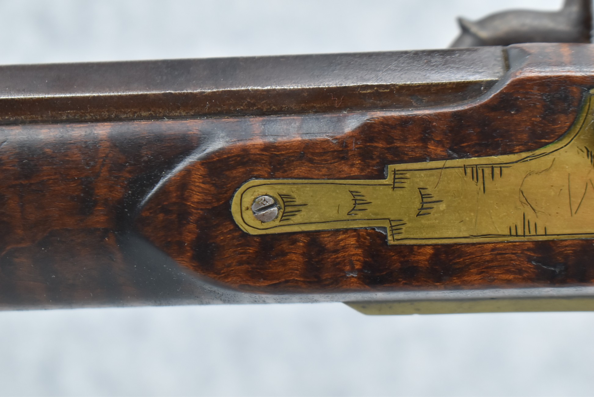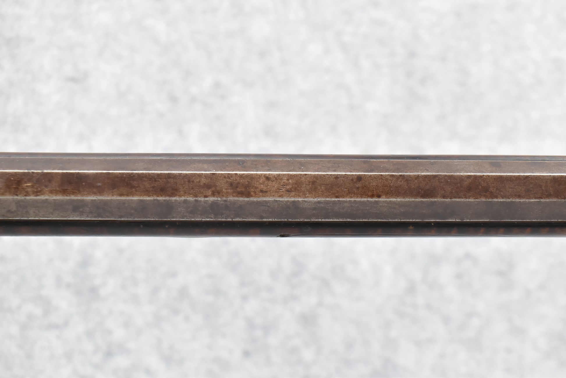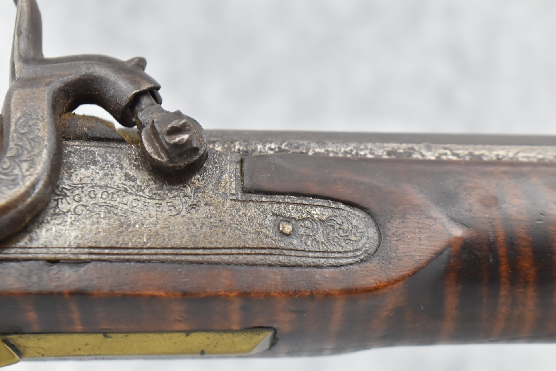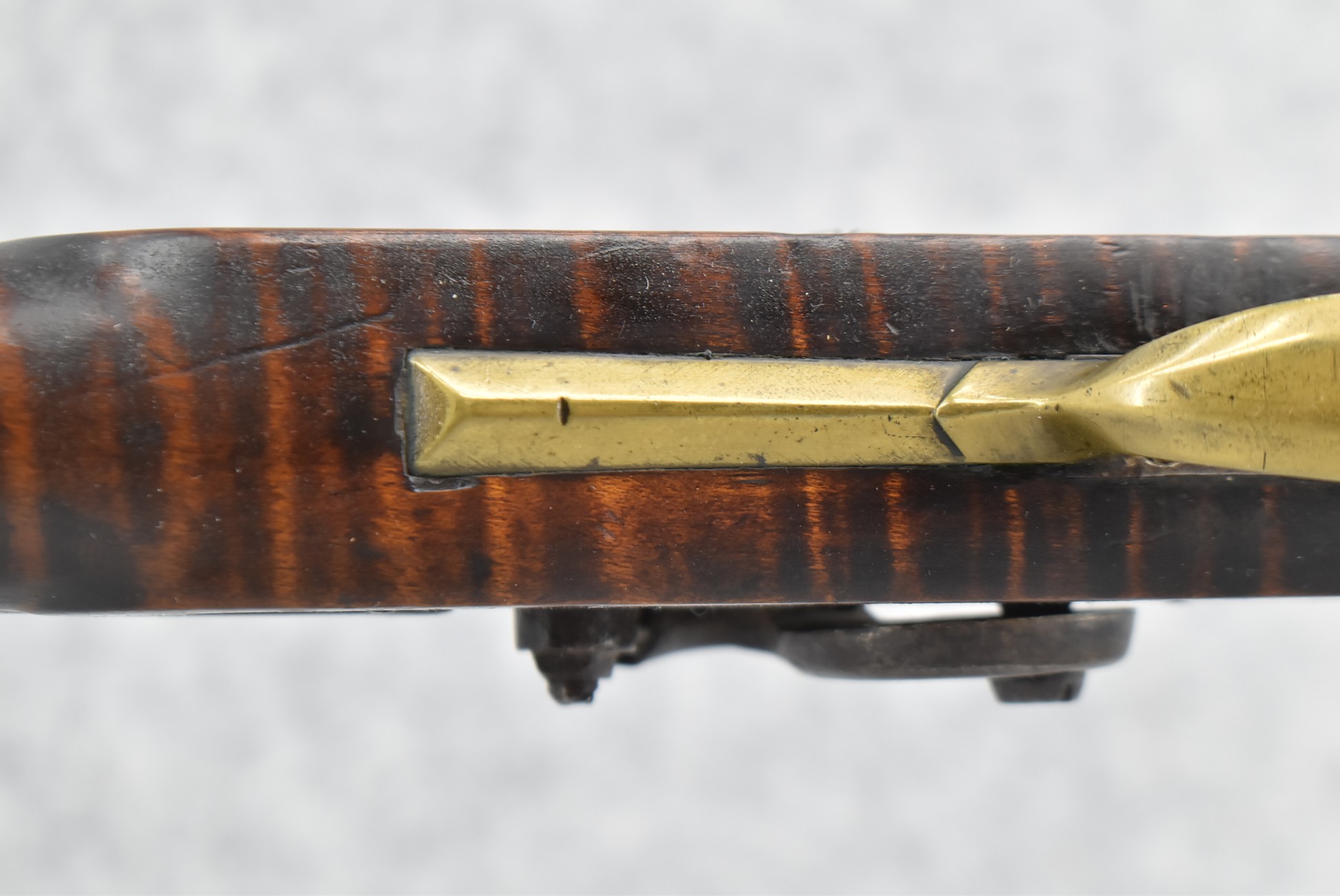 172. Unsigned 36 Cal. Full Stock Percussion Kentucky Long Rifle – w/32 ½” Octagon Barrel w/Front & Rear Barrel Sights – w/Full Length Tiger Maple Stock w/4pc. Patch Box & Brass Furniture & Silver Inlays – w/Signed G. Goulcher Percussion Lock – w/Double Set Triggers – Gun Has Huntingdon County Characteristics – Note: Crack in Butt Stock on Left Side – Overall Length of 47.5″