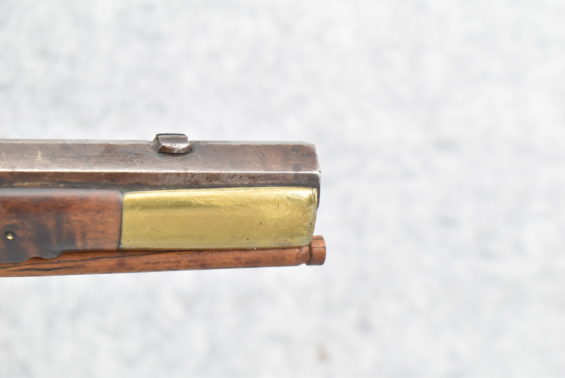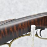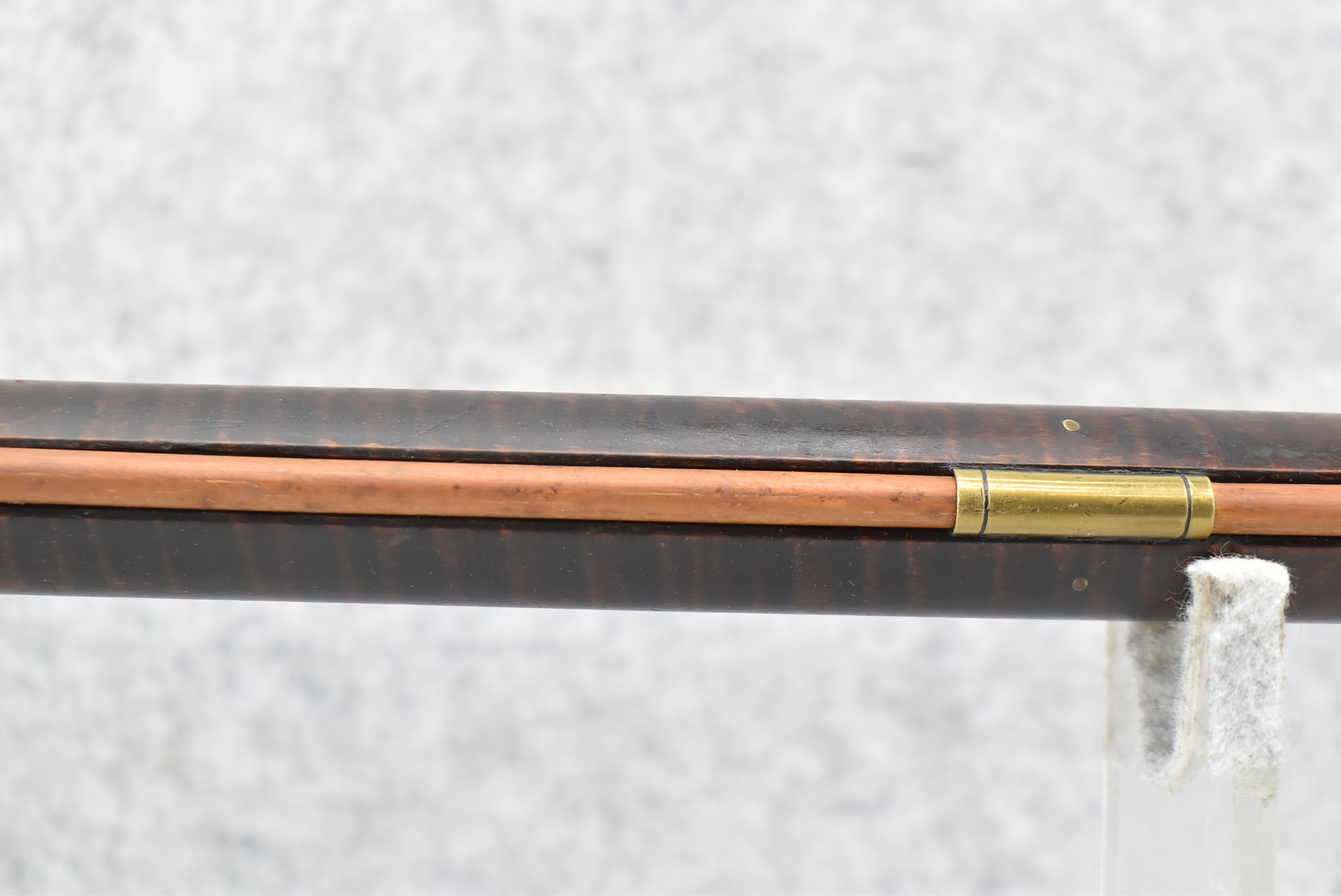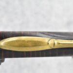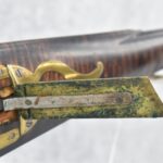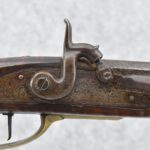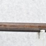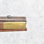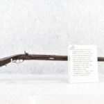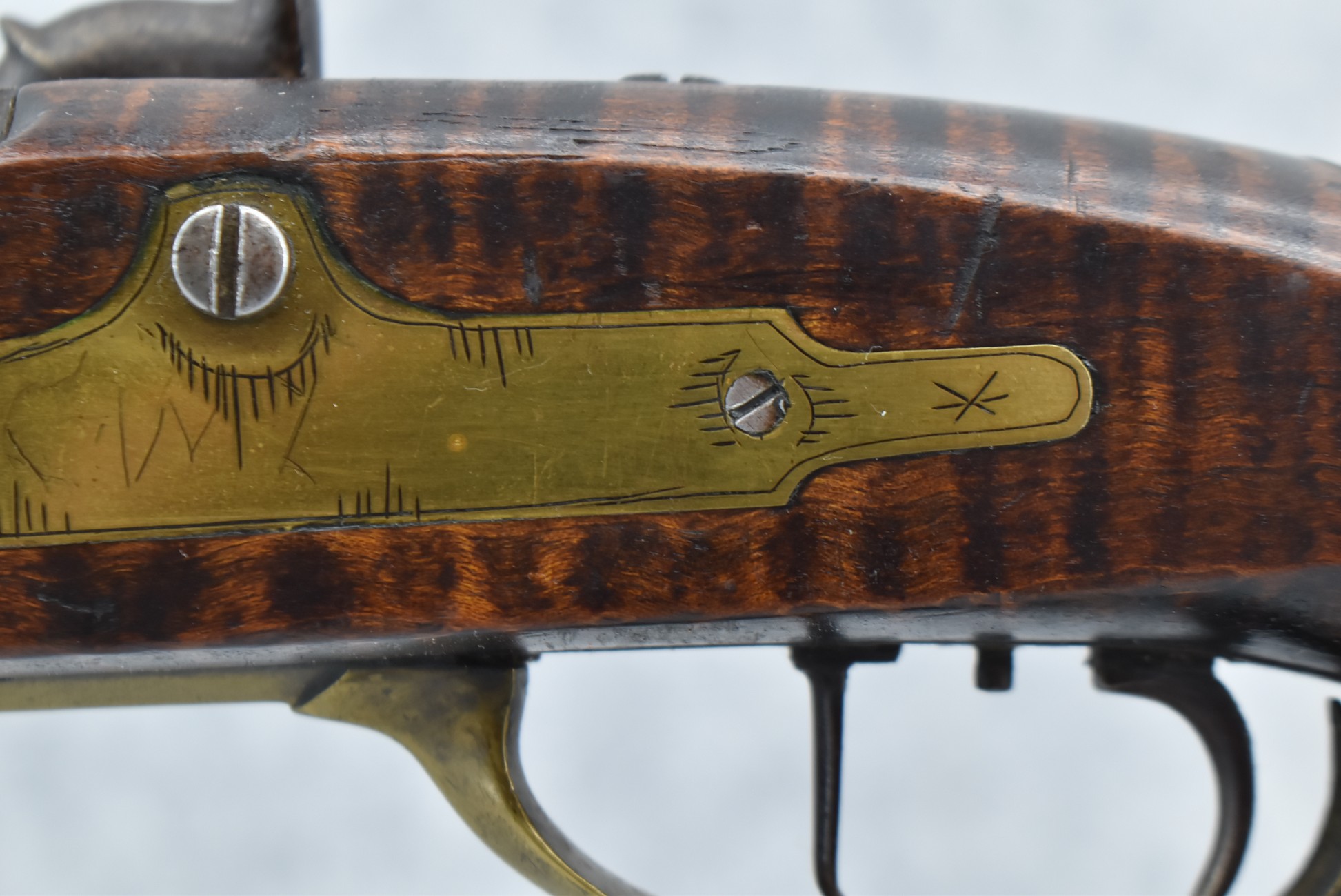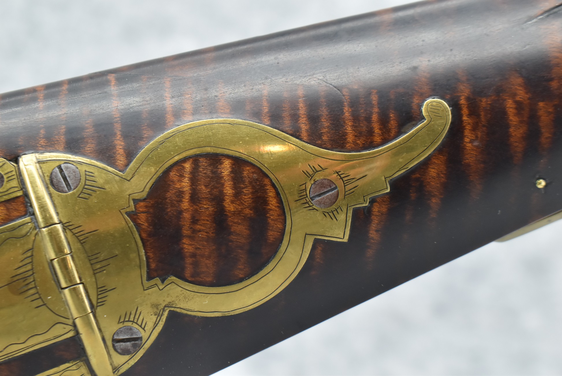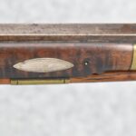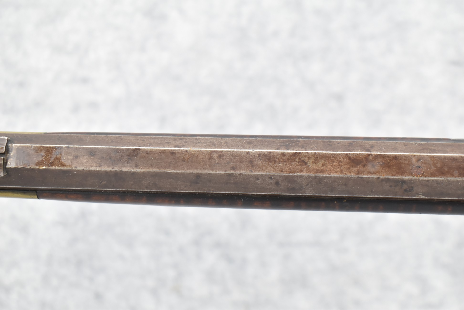 172. Unsigned 36 Cal. Full Stock Percussion Kentucky Long Rifle – w/32 ½” Octagon Barrel w/Front & Rear Barrel Sights – w/Full Length Tiger Maple Stock w/4pc. Patch Box & Brass Furniture & Silver Inlays – w/Signed G. Goulcher Percussion Lock – w/Double Set Triggers – Gun Has Huntingdon County Characteristics – Note: Crack in Butt Stock on Left Side – Overall Length of 47.5″