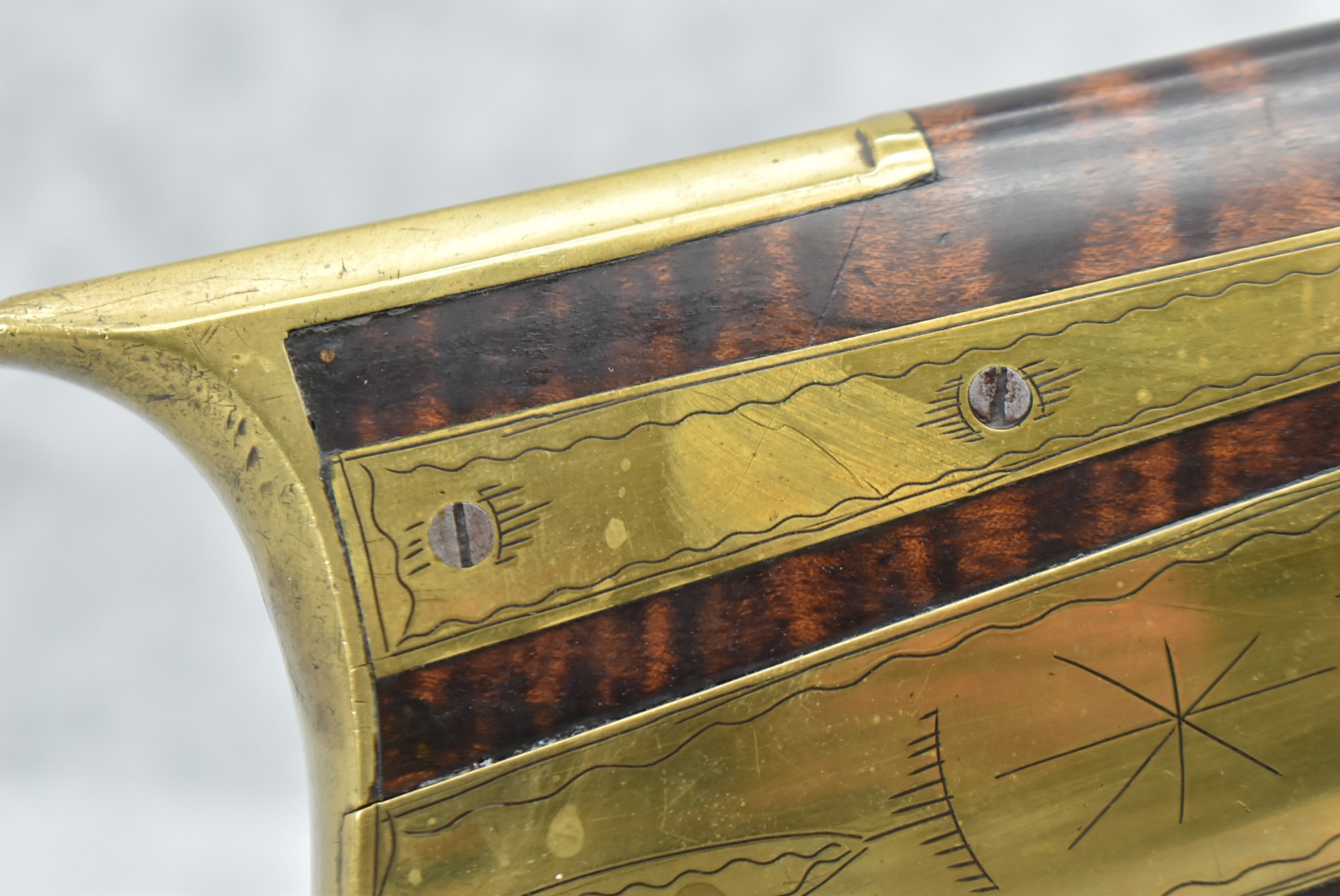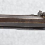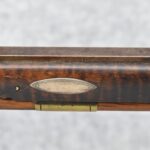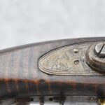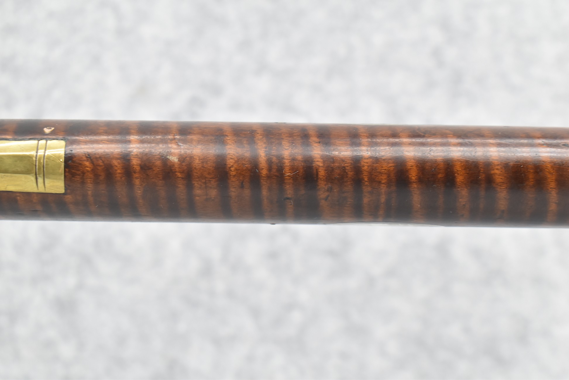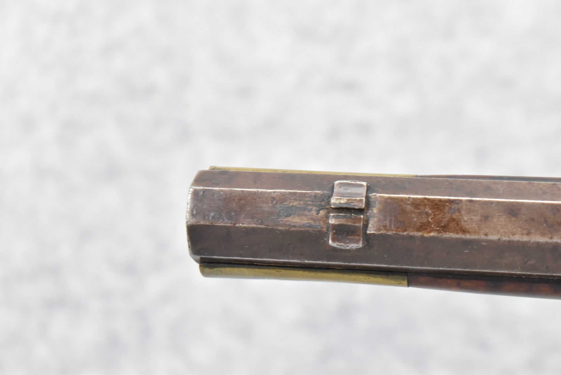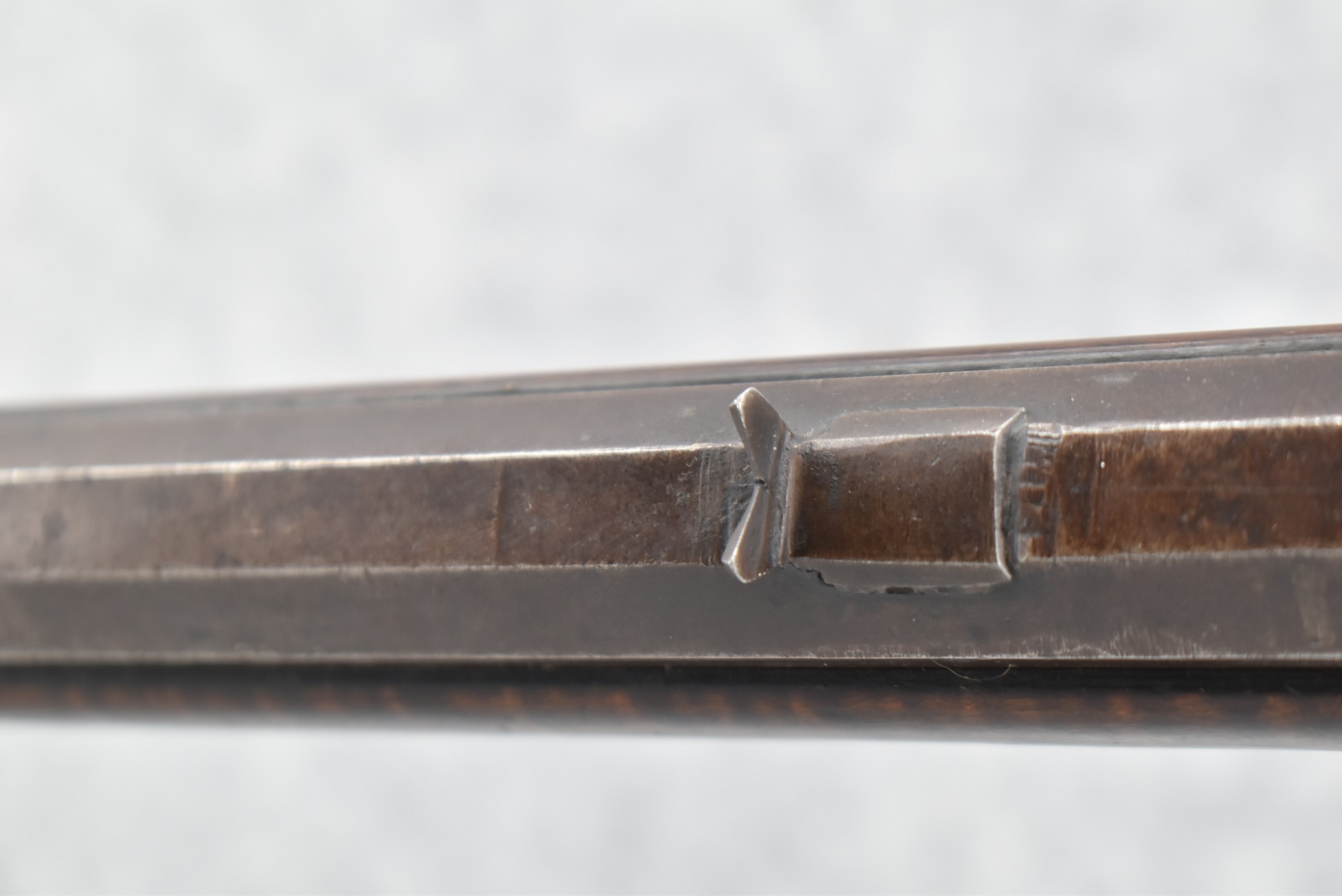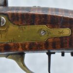 172. Unsigned 36 Cal. Full Stock Percussion Kentucky Long Rifle – w/32 ½” Octagon Barrel w/Front & Rear Barrel Sights – w/Full Length Tiger Maple Stock w/4pc. Patch Box & Brass Furniture & Silver Inlays – w/Signed G. Goulcher Percussion Lock – w/Double Set Triggers – Gun Has Huntingdon County Characteristics – Note: Crack in Butt Stock on Left Side – Overall Length of 47.5″