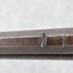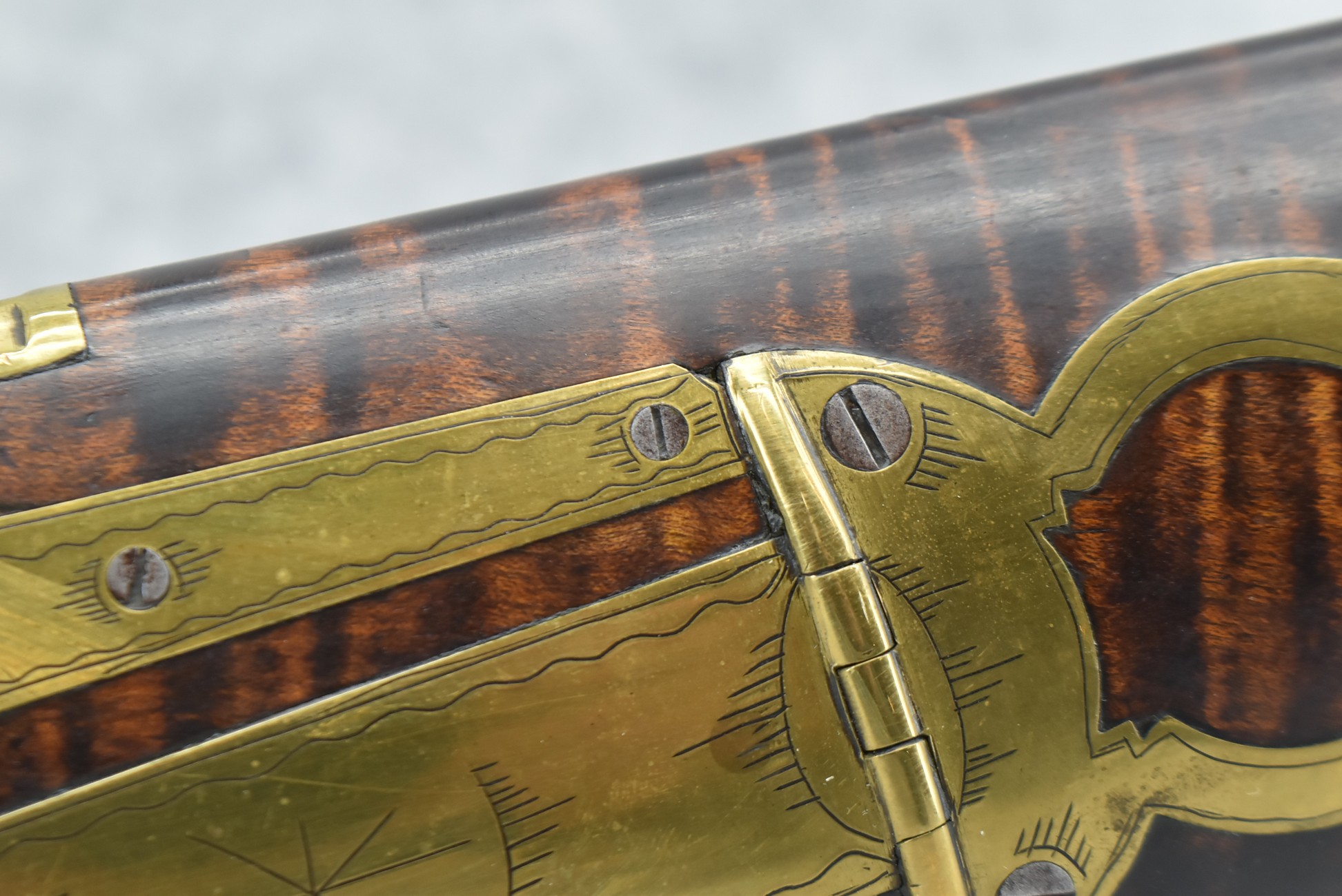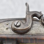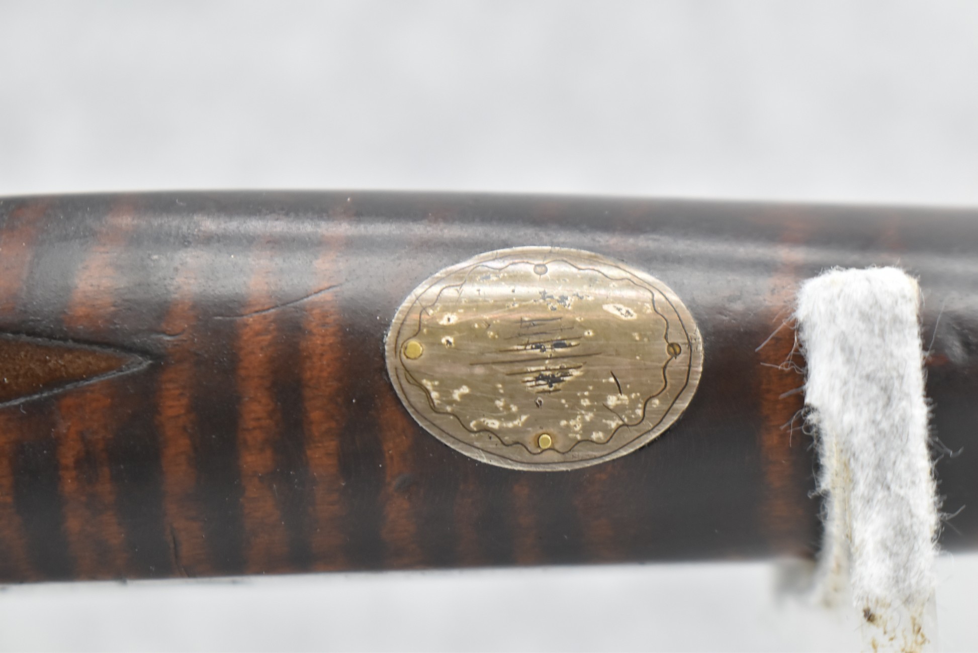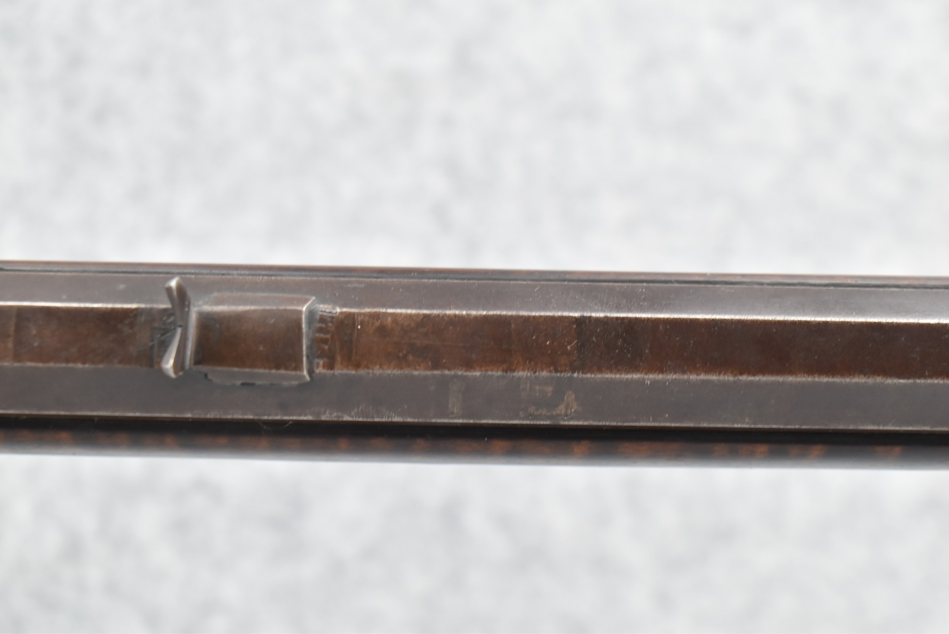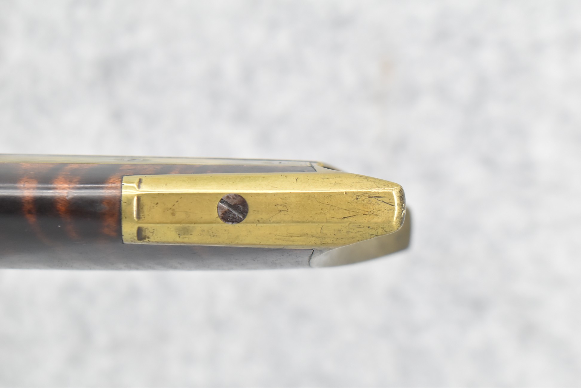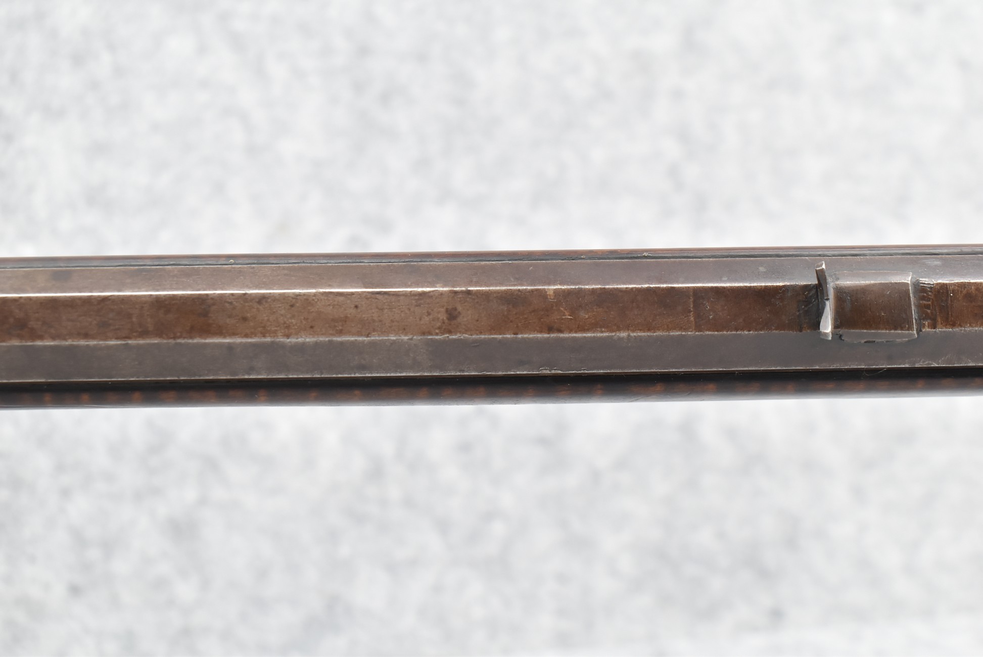 172. Unsigned 36 Cal. Full Stock Percussion Kentucky Long Rifle – w/32 ½” Octagon Barrel w/Front & Rear Barrel Sights – w/Full Length Tiger Maple Stock w/4pc. Patch Box & Brass Furniture & Silver Inlays – w/Signed G. Goulcher Percussion Lock – w/Double Set Triggers – Gun Has Huntingdon County Characteristics – Note: Crack in Butt Stock on Left Side – Overall Length of 47.5″
