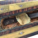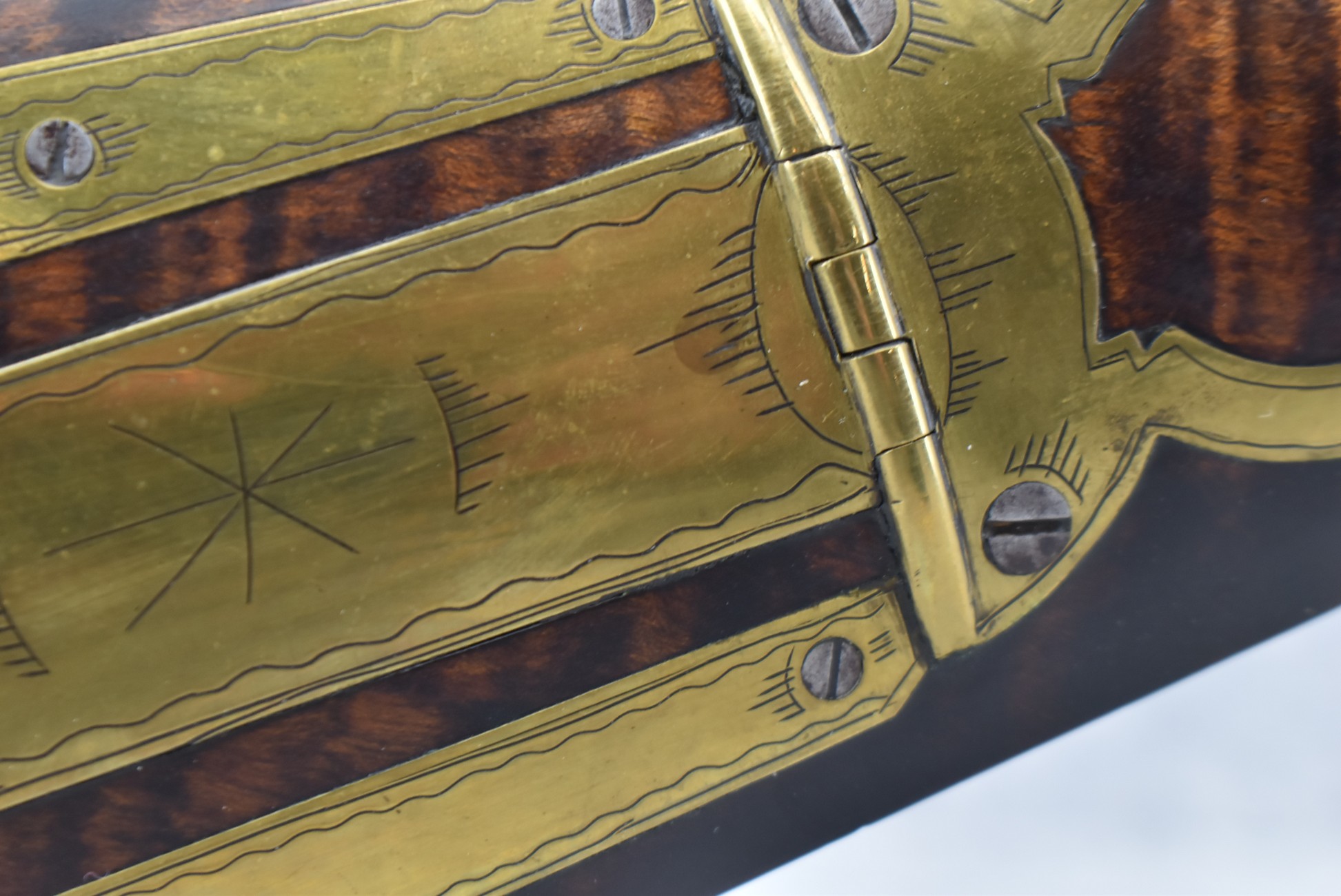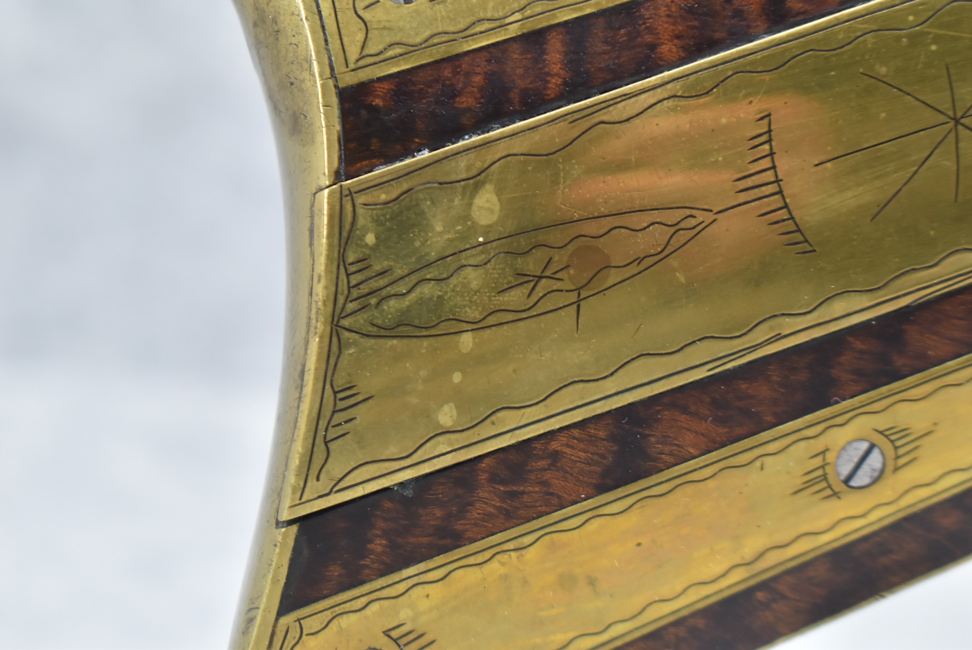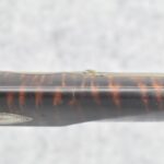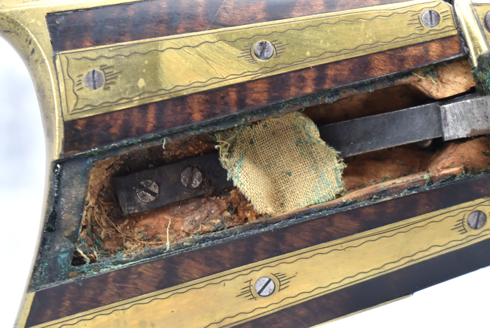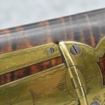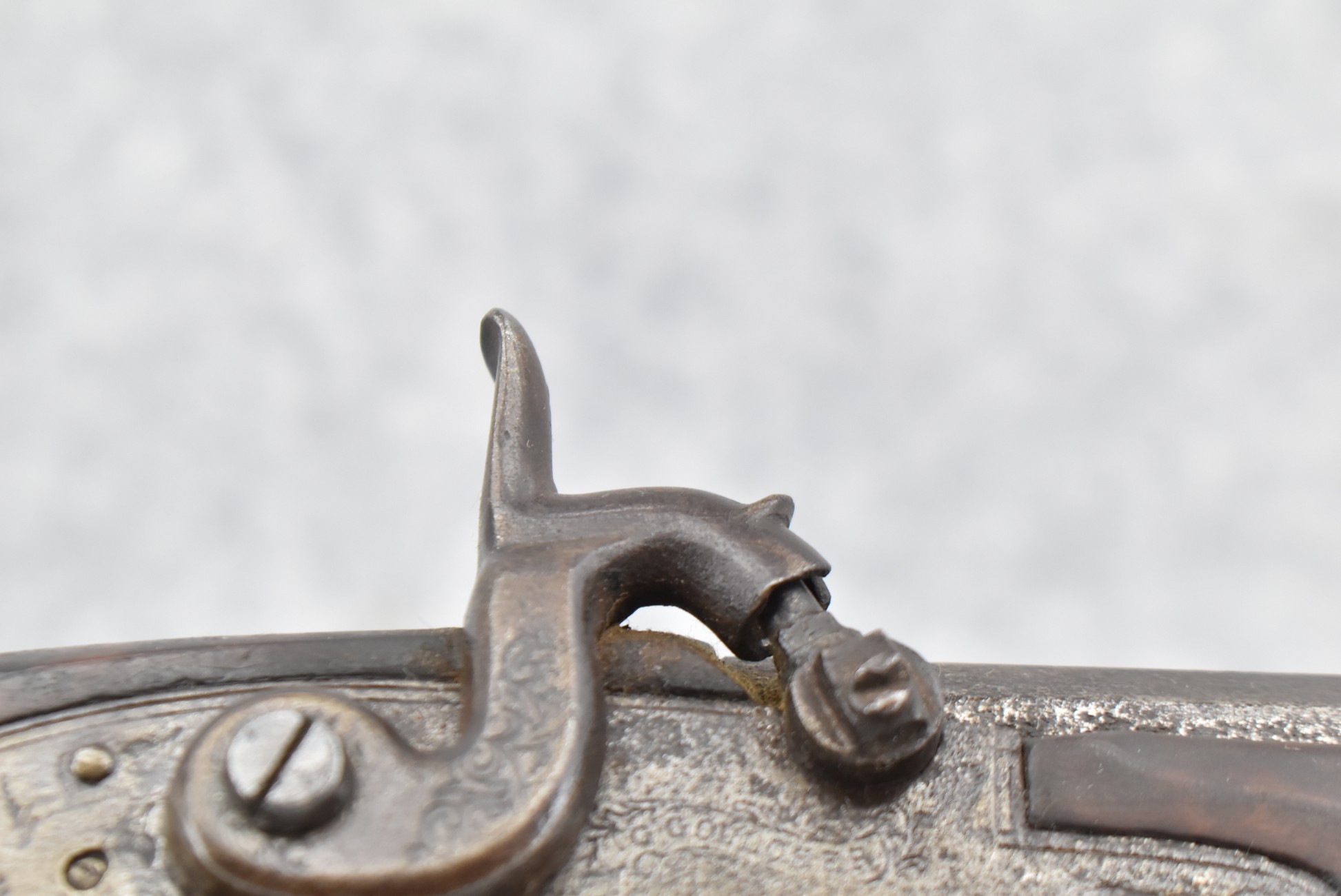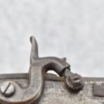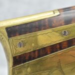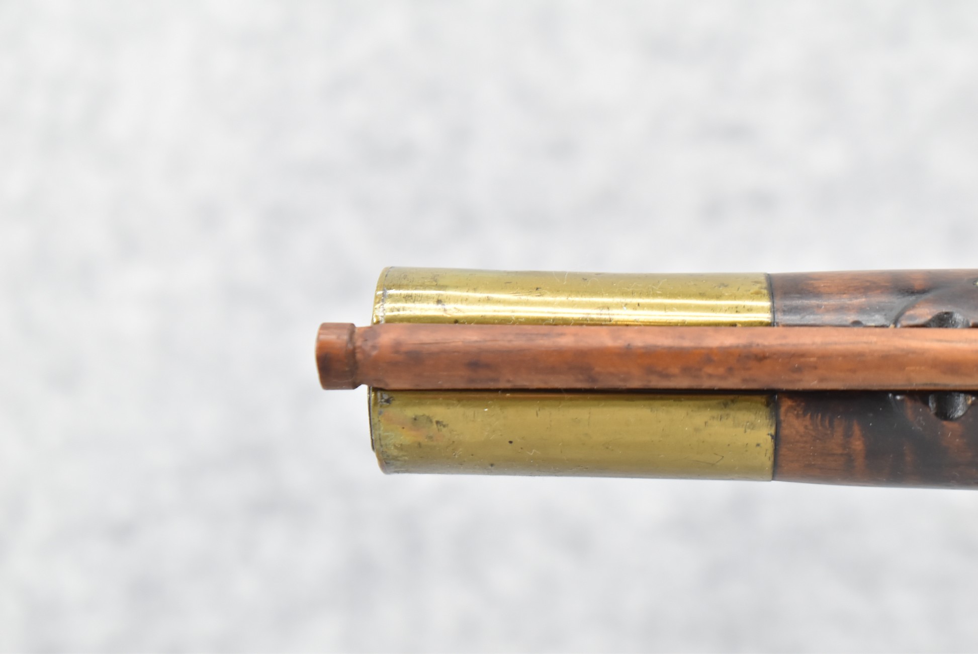 172. Unsigned 36 Cal. Full Stock Percussion Kentucky Long Rifle – w/32 ½” Octagon Barrel w/Front & Rear Barrel Sights – w/Full Length Tiger Maple Stock w/4pc. Patch Box & Brass Furniture & Silver Inlays – w/Signed G. Goulcher Percussion Lock – w/Double Set Triggers – Gun Has Huntingdon County Characteristics – Note: Crack in Butt Stock on Left Side – Overall Length of 47.5″