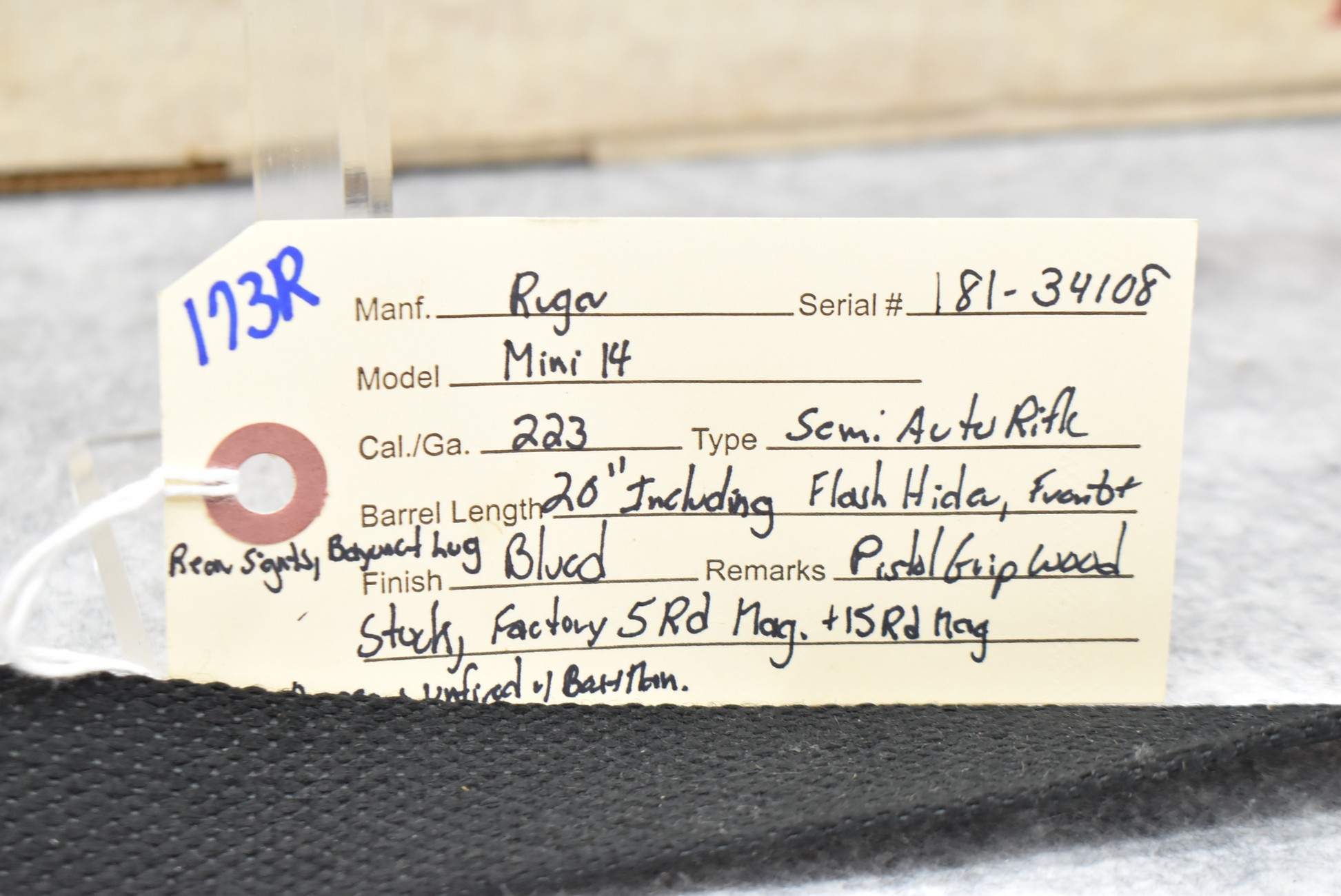 173R. Ruger – Mod. Mini 14 – 223 Cal. Semi-Auto Rifle – w/20” Barrel Including Flash Hider, Front & Rear Sights w/Bayonet Lug – Blued Finish – w/Pistol Grip Wood Stock – w/Factory 5Rd Mag & 15Rd Mag – Appears Unfired w/Box & Manual