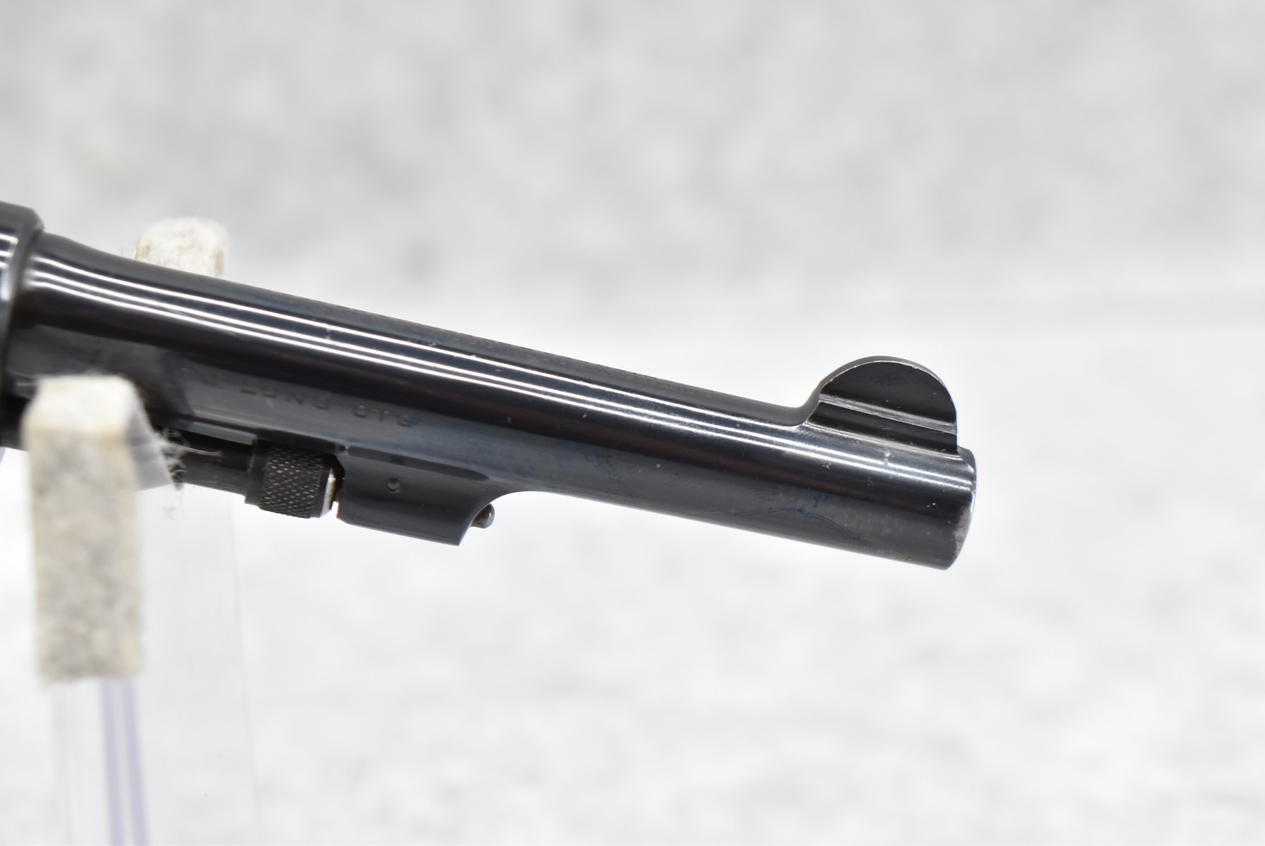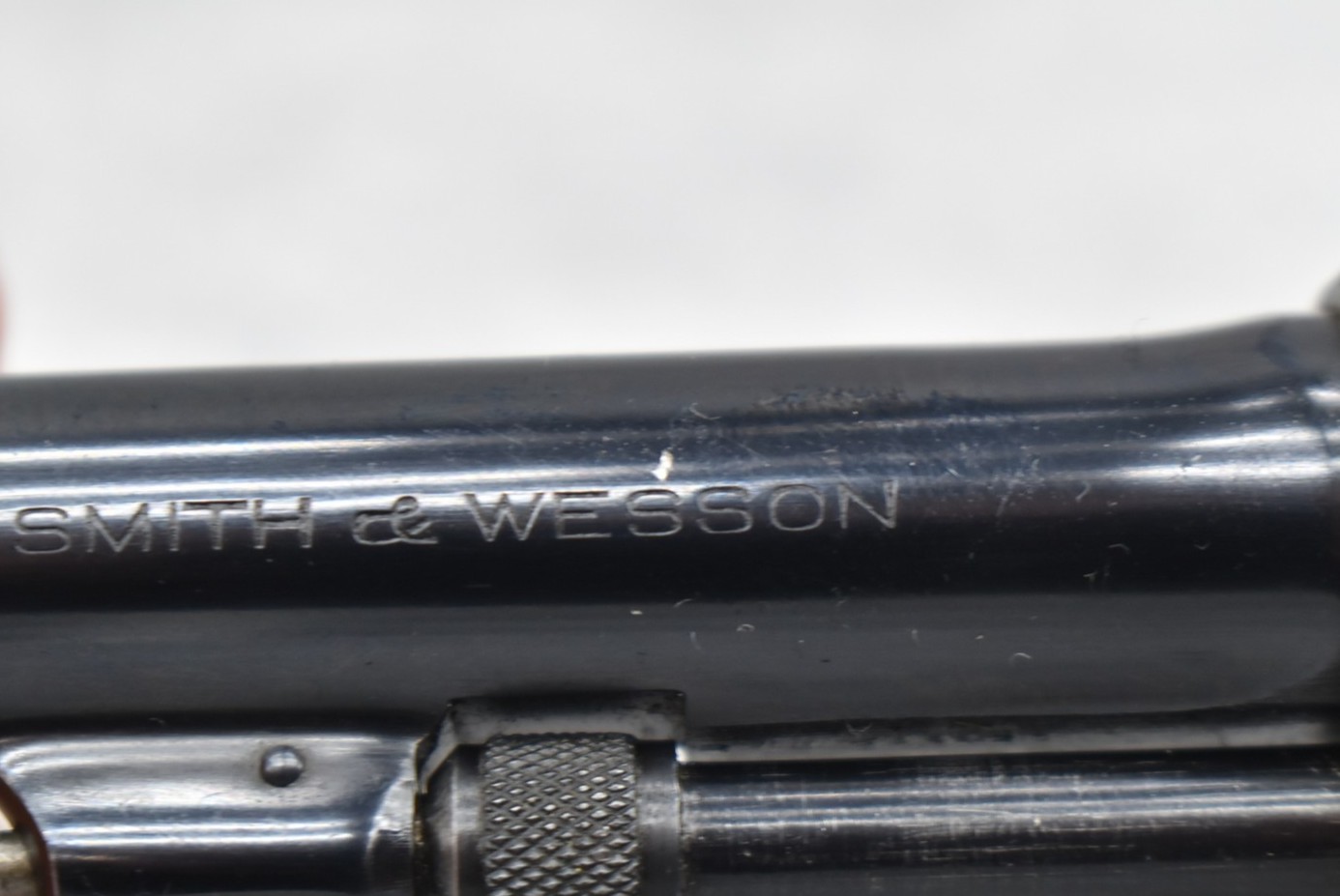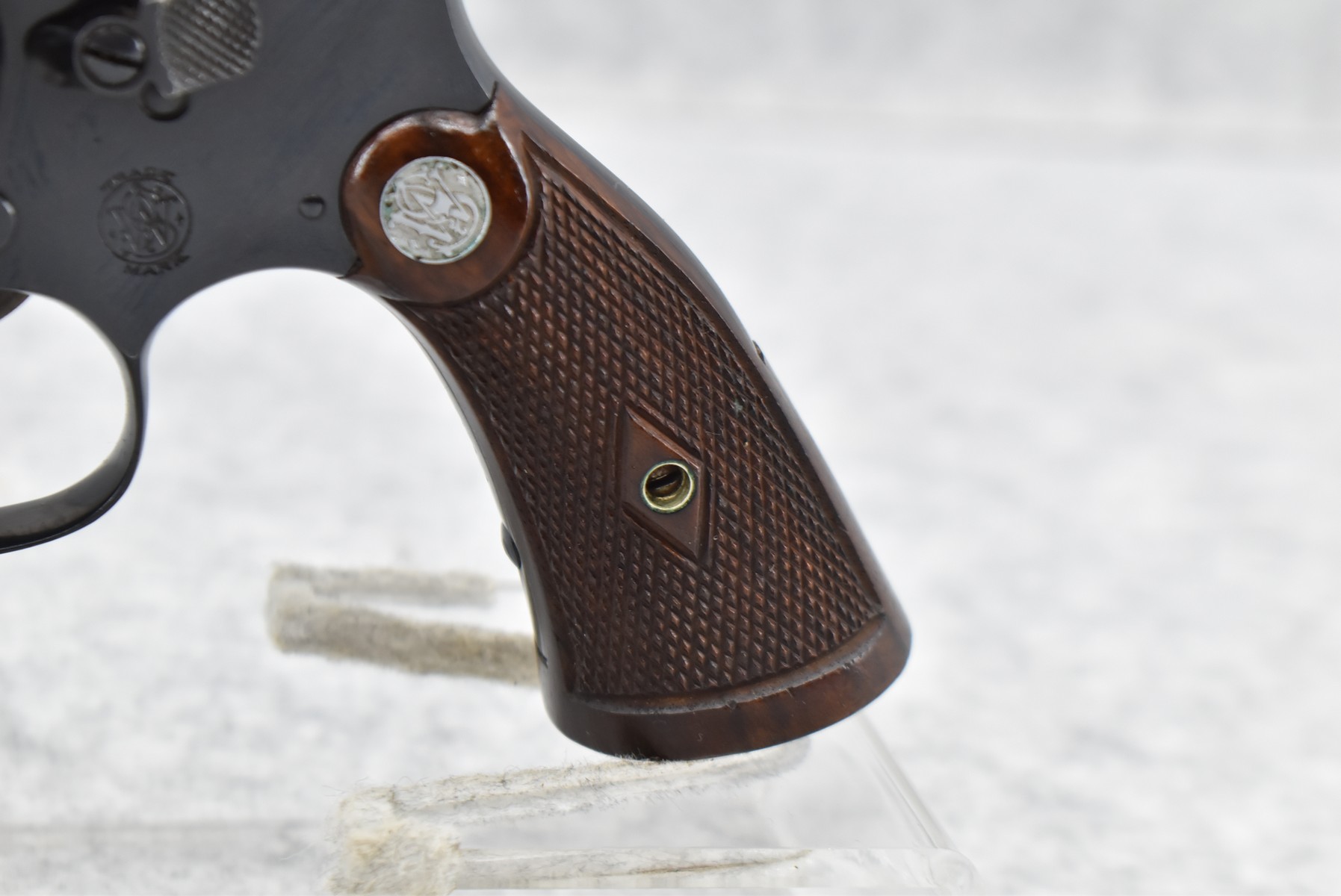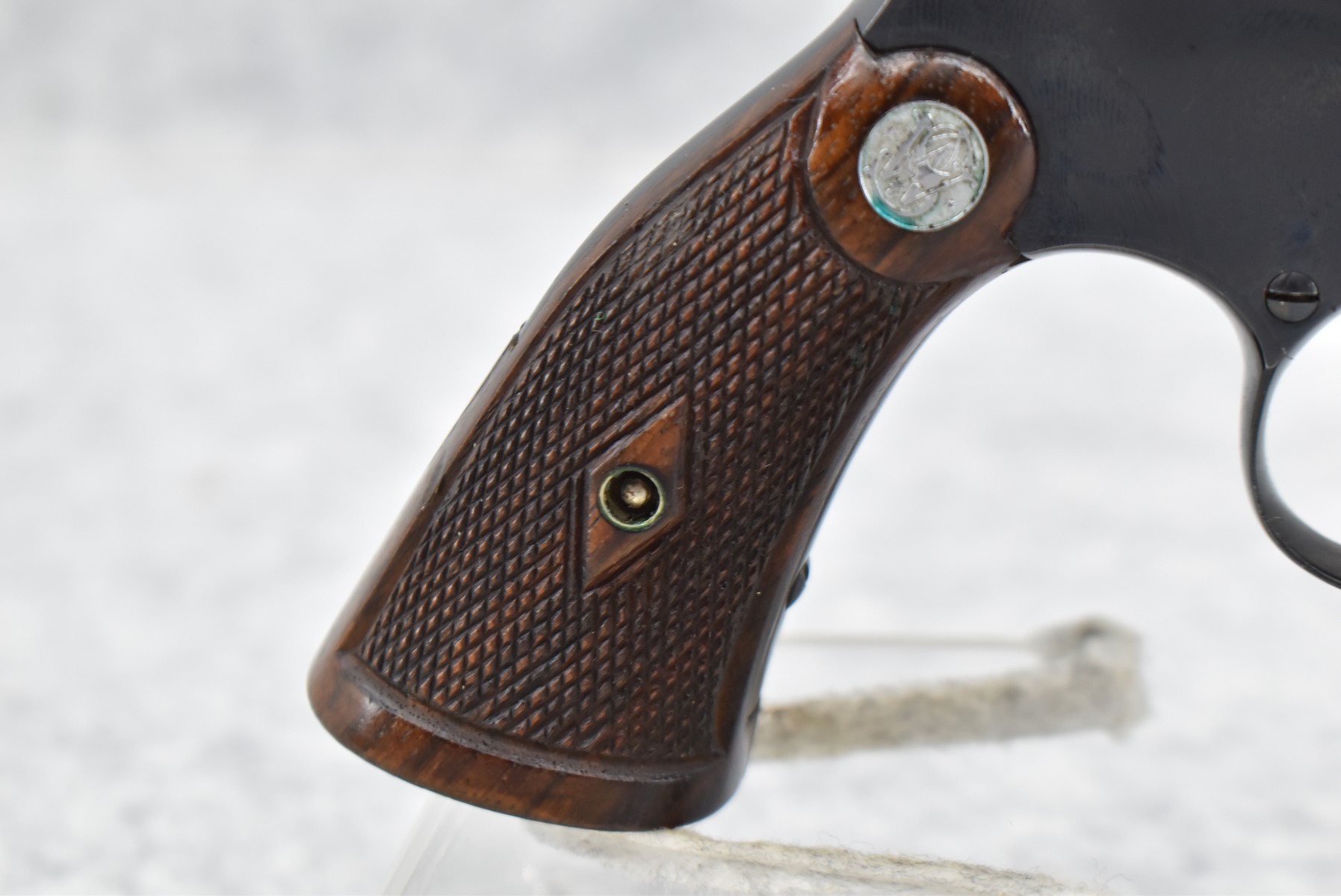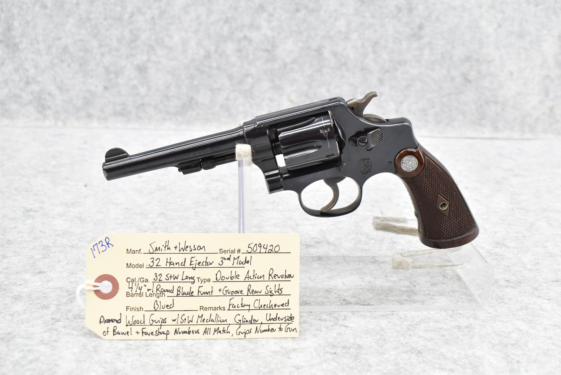 173R. Smith & Wesson – Mod. .32 Hand Ejector 3rd Model – 32 S&W Long Cal. Double Action Revolver – w/4 ¼” Barrel w/Round Blade Front & Groove Rear Sights – Blued Finish – w/Factory Checkered Diamond Wood Grips w/S&W Medallion – Cylinder, Underside of Barrel & Forestrap Numbers All Match – Grips Number to Gun