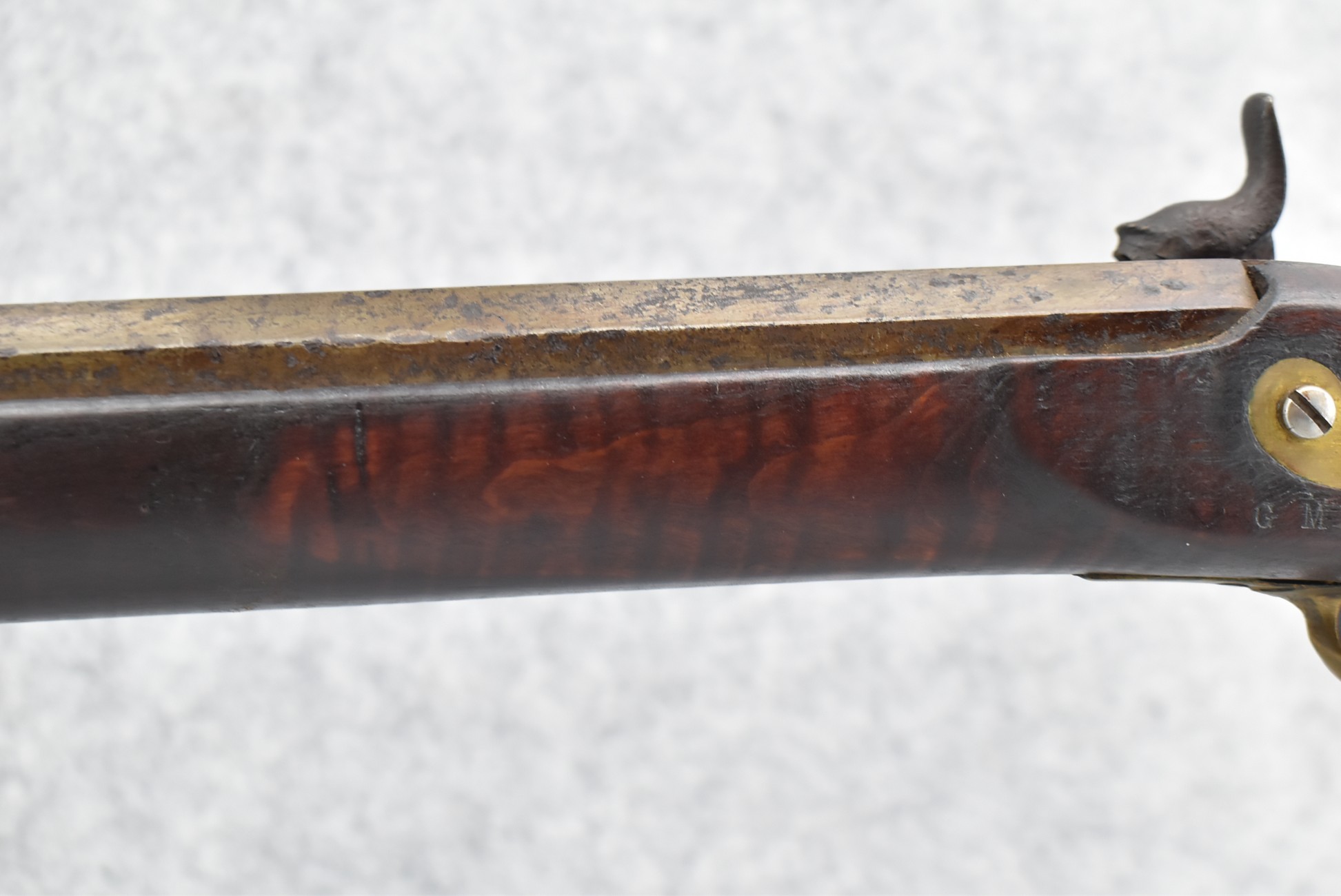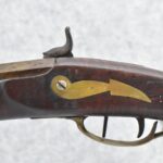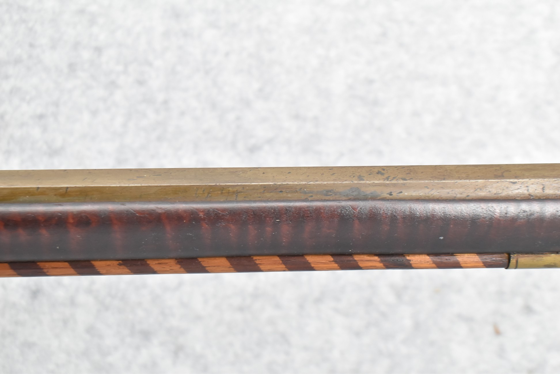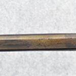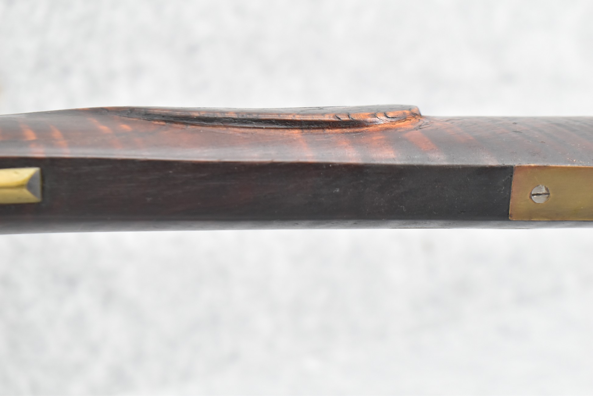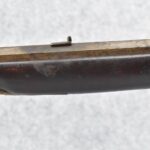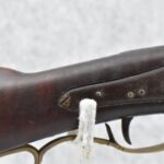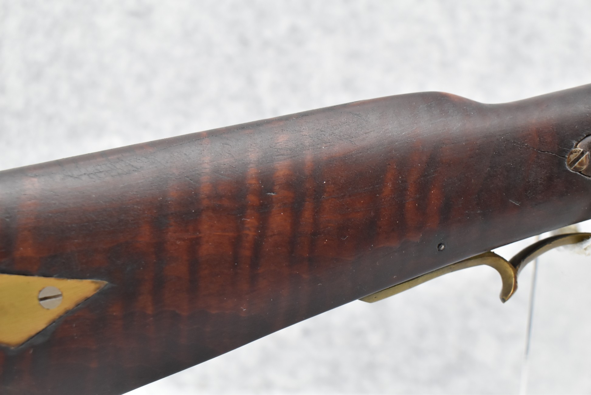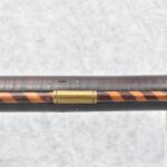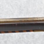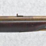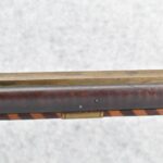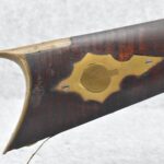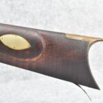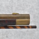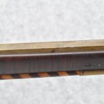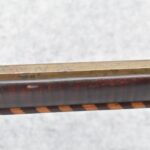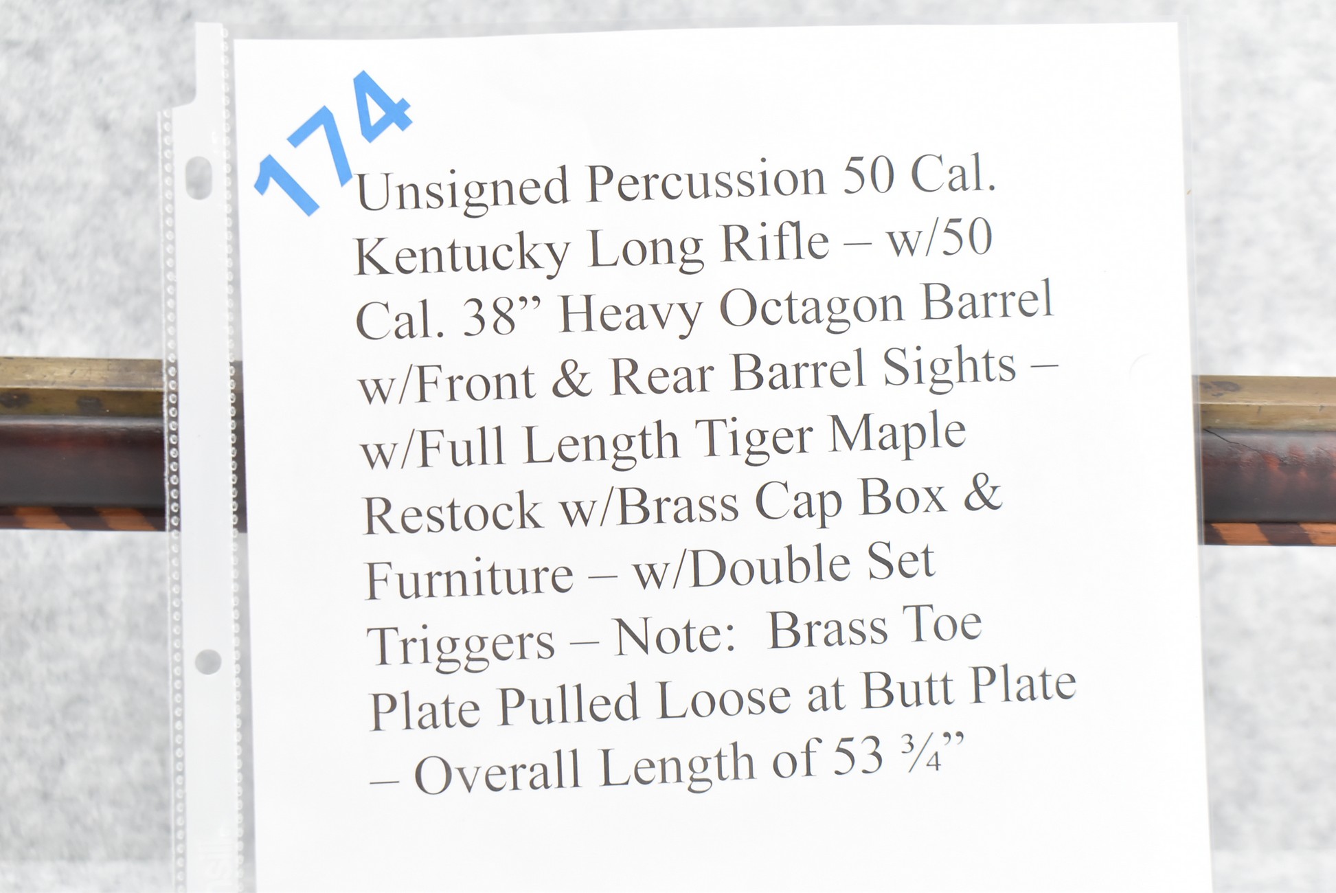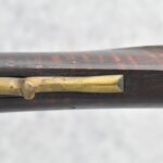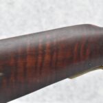174. Unsigned Percussion 50 Cal. Kentucky Long Rifle – w/50 Cal. 38” Heavy Octagon Barrel w/Front & Rear Barrel Sights – w/Full Length Tiger Maple Restock w/Brass Cap Box & Furniture – w/Double Set Triggers – Note: Brass Toe Plate Pulled Loose at Butt Plate – Overall Length of 53 ¾”