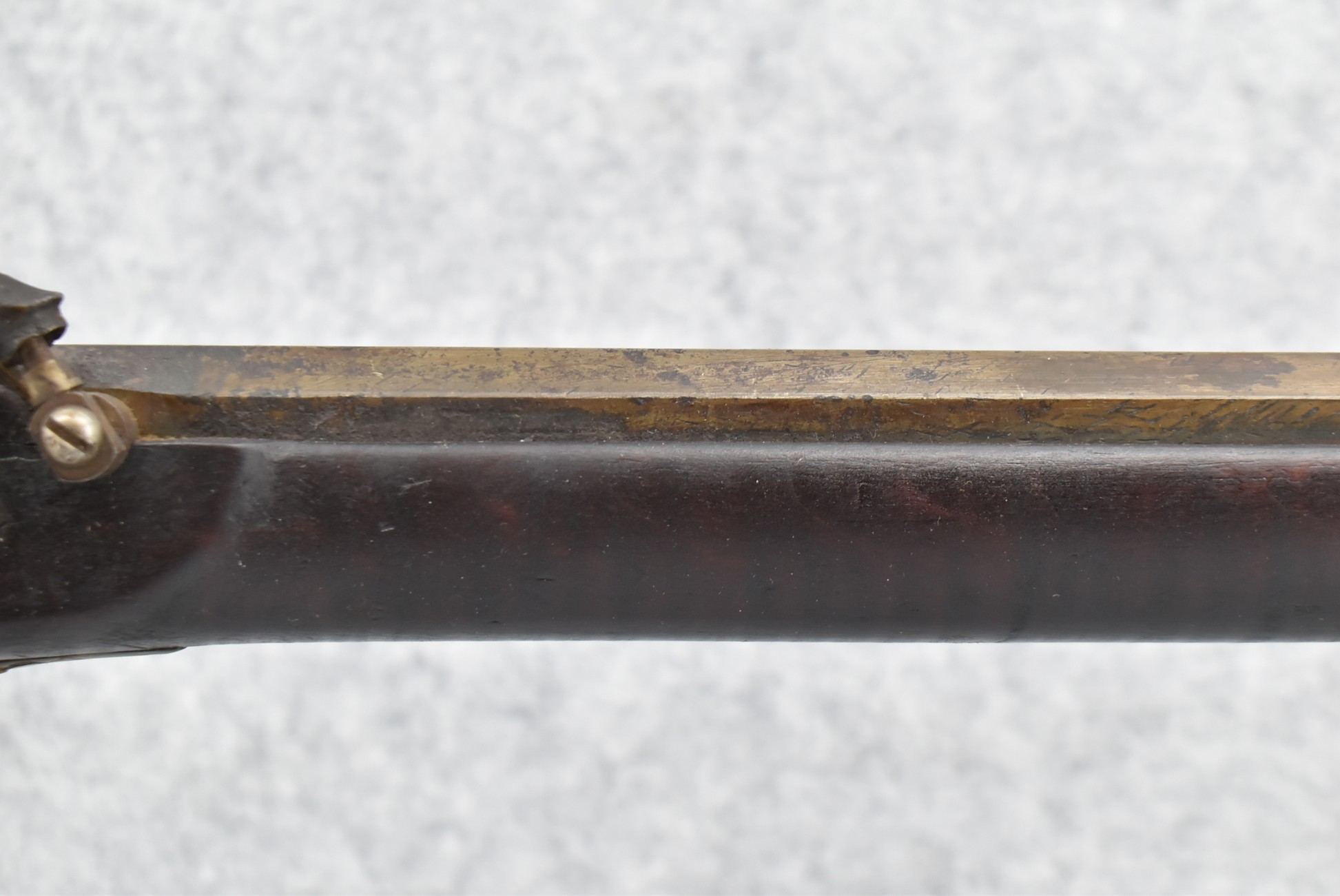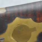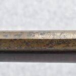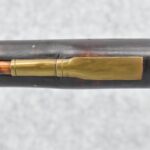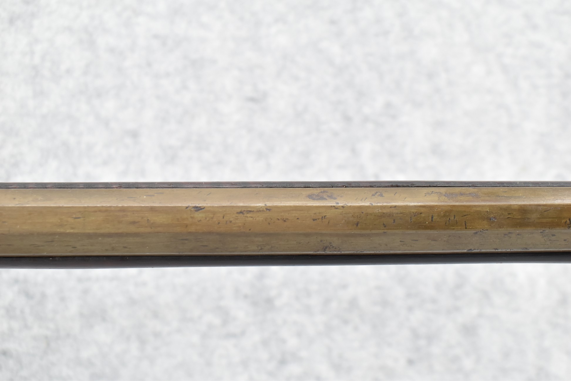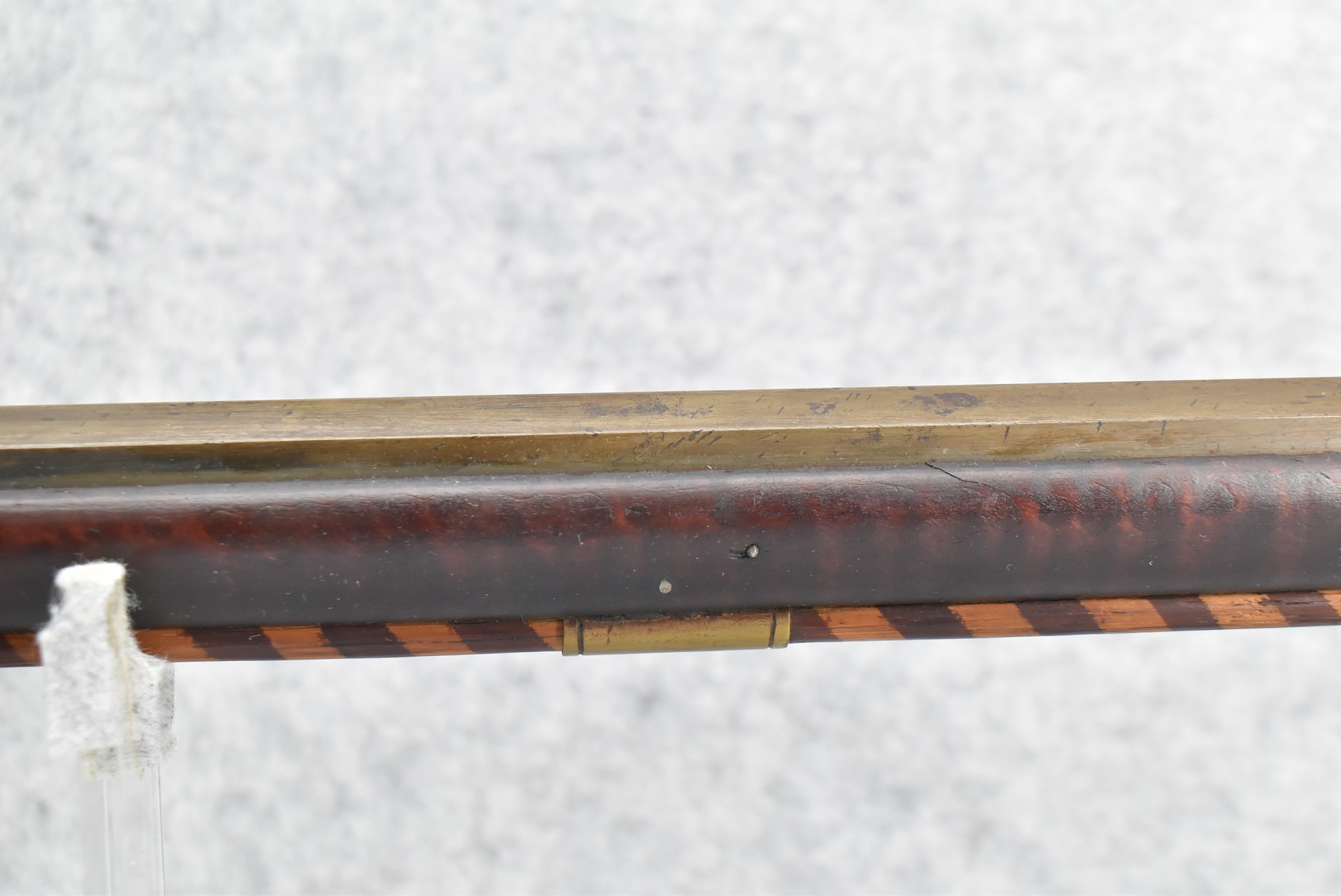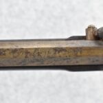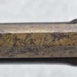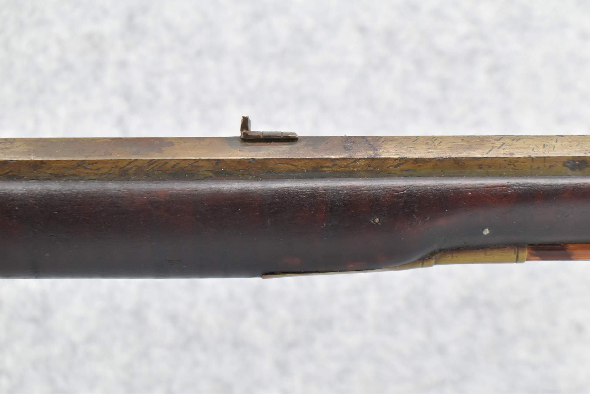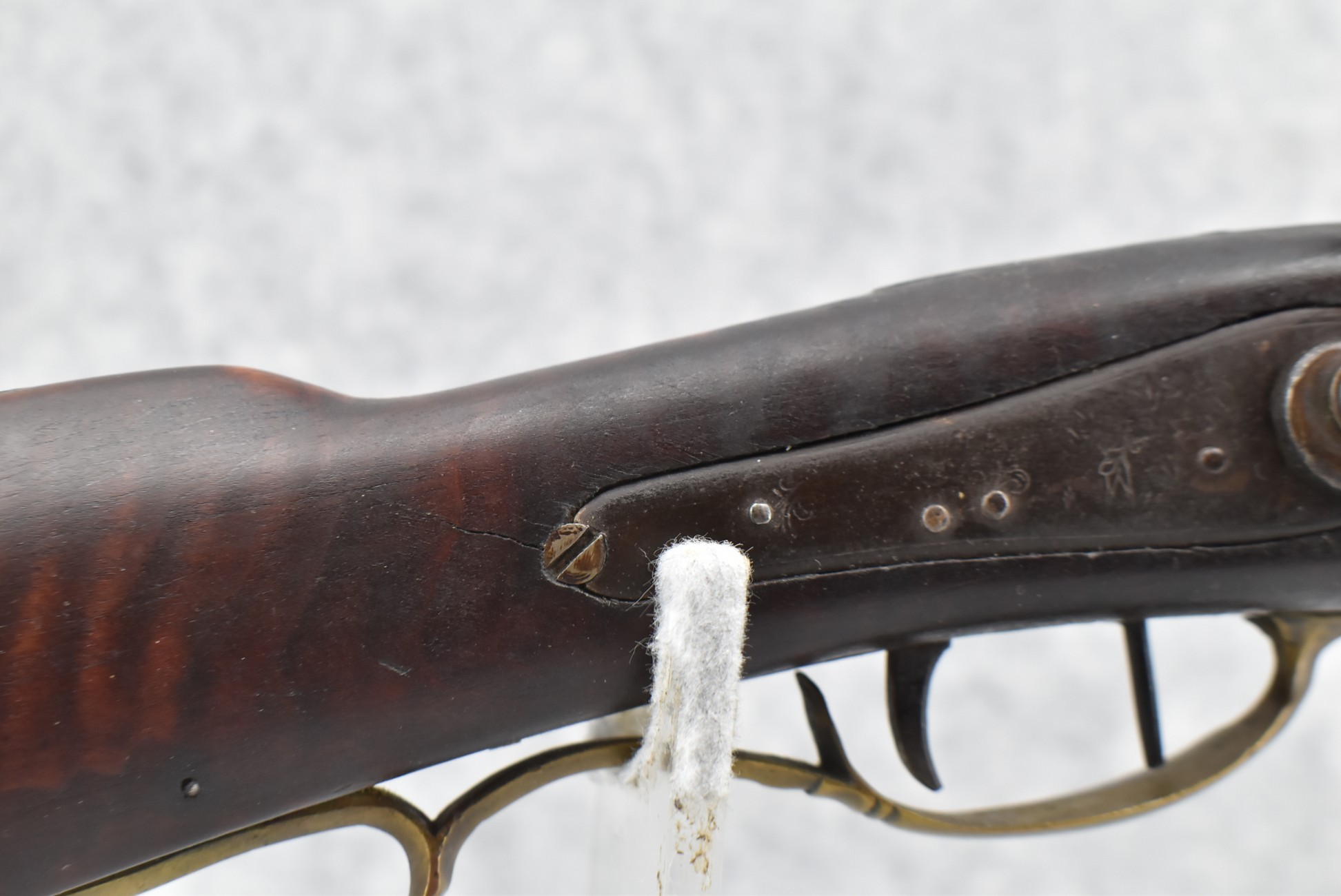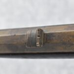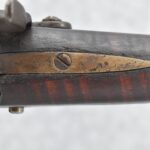 174. Unsigned Percussion 50 Cal. Kentucky Long Rifle – w/50 Cal. 38” Heavy Octagon Barrel w/Front & Rear Barrel Sights – w/Full Length Tiger Maple Restock w/Brass Cap Box & Furniture – w/Double Set Triggers – Note: Brass Toe Plate Pulled Loose at Butt Plate – Overall Length of 53 ¾”