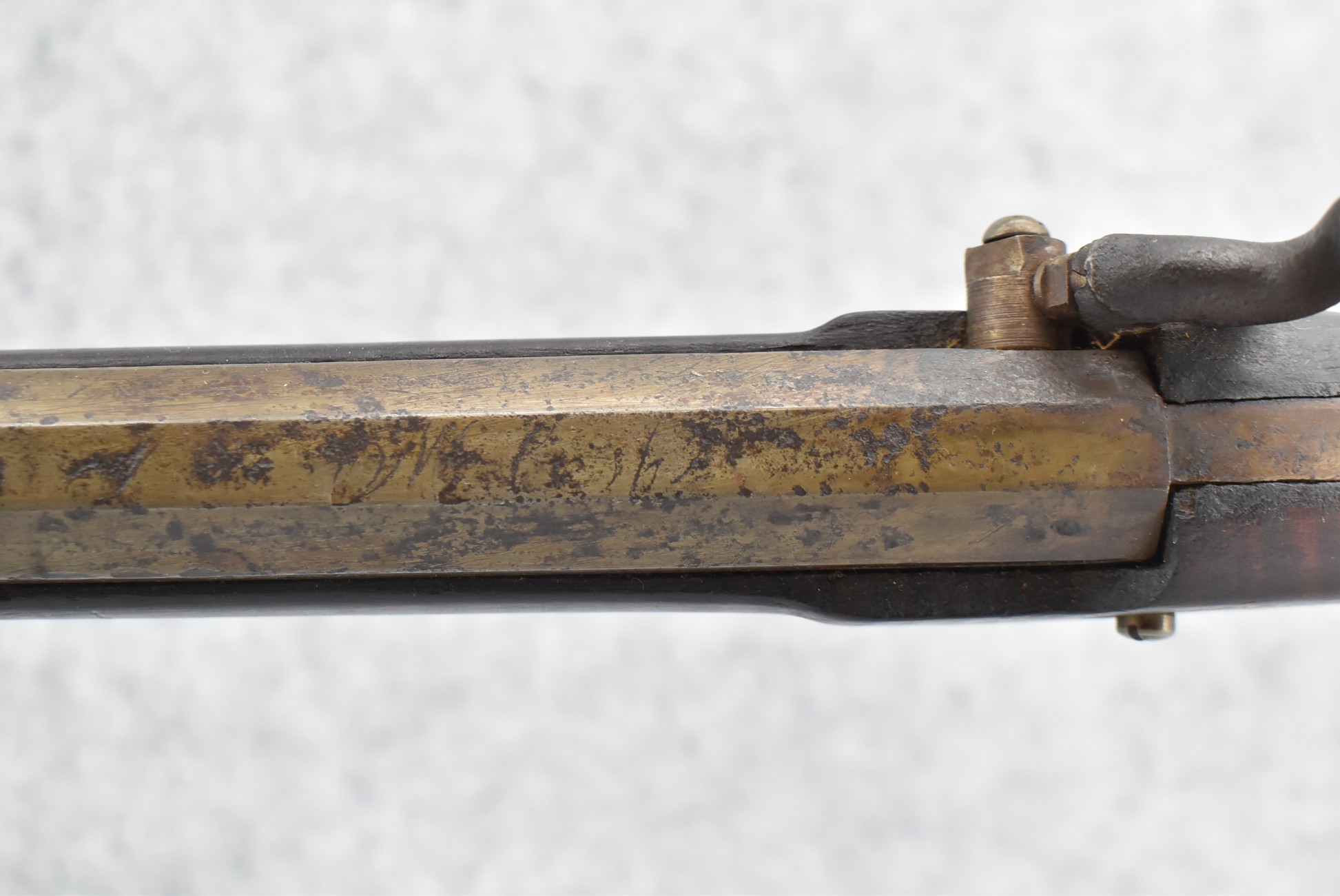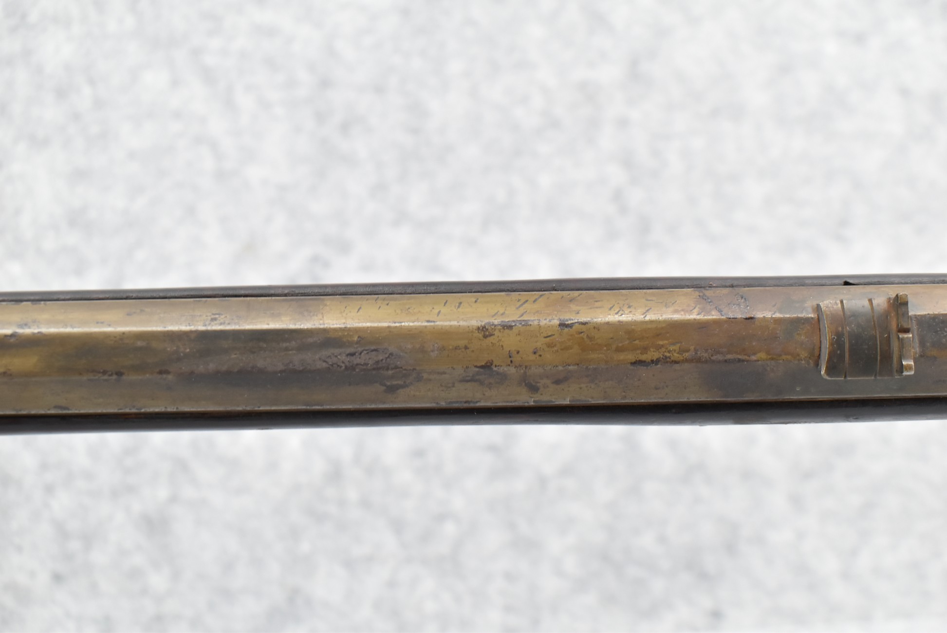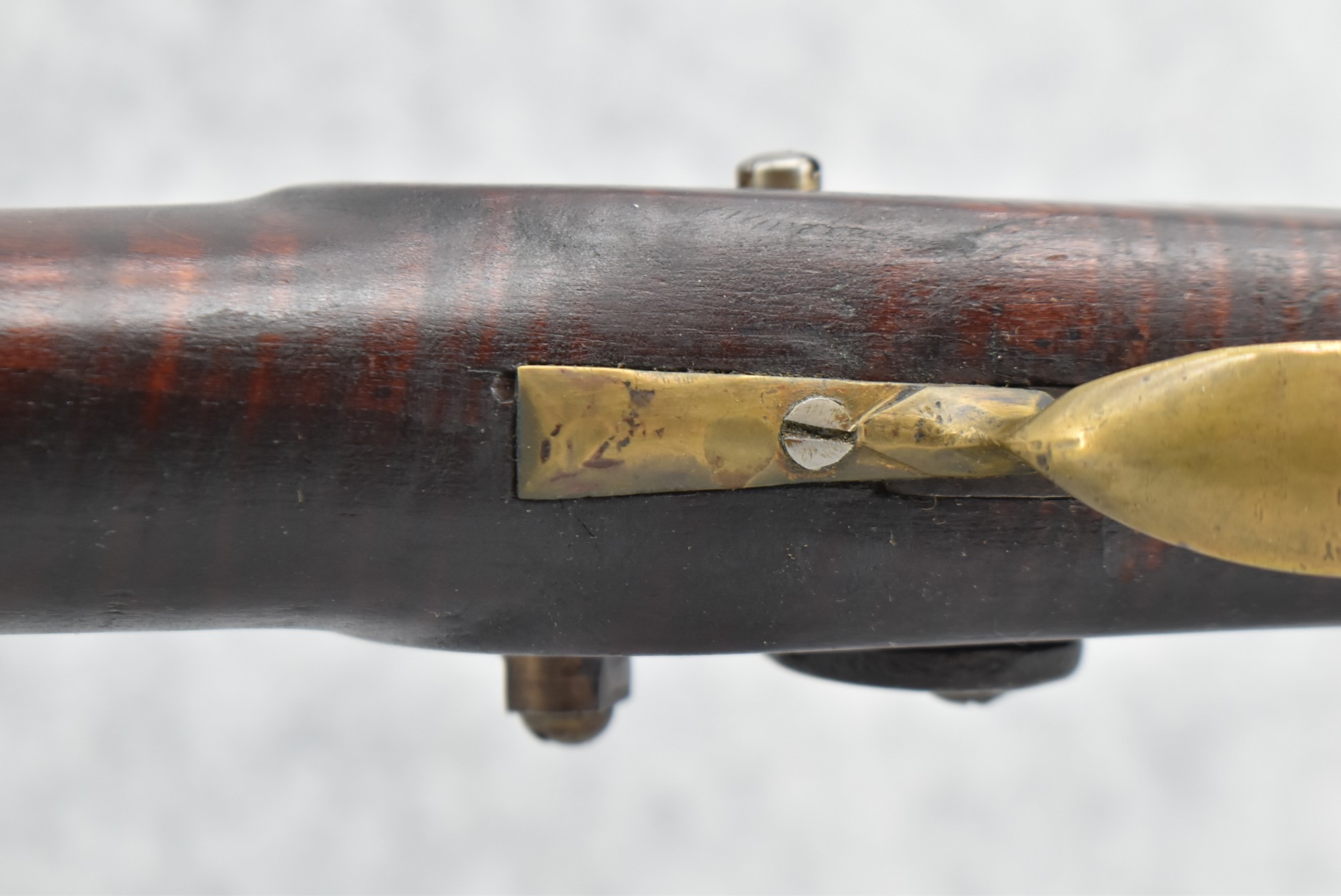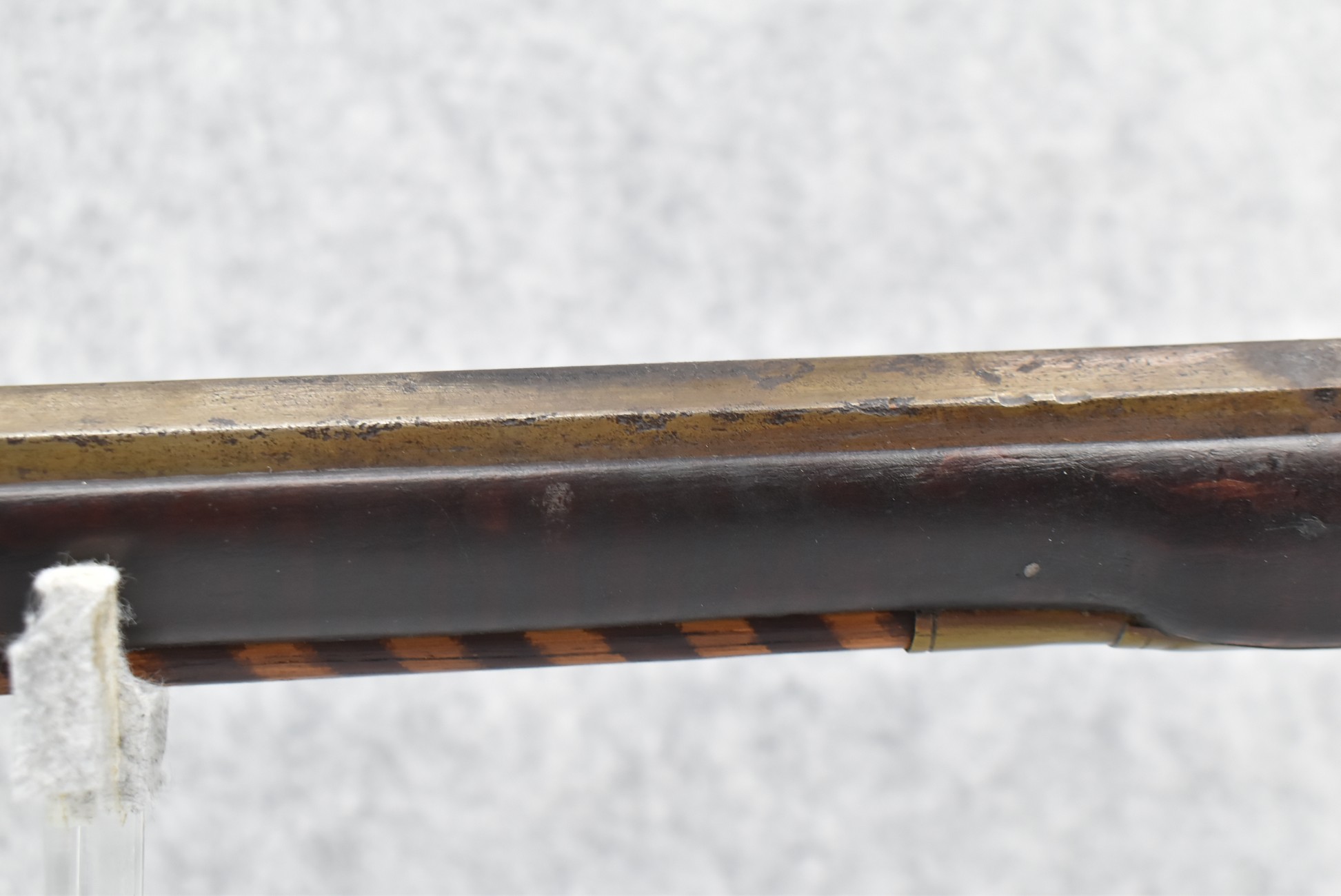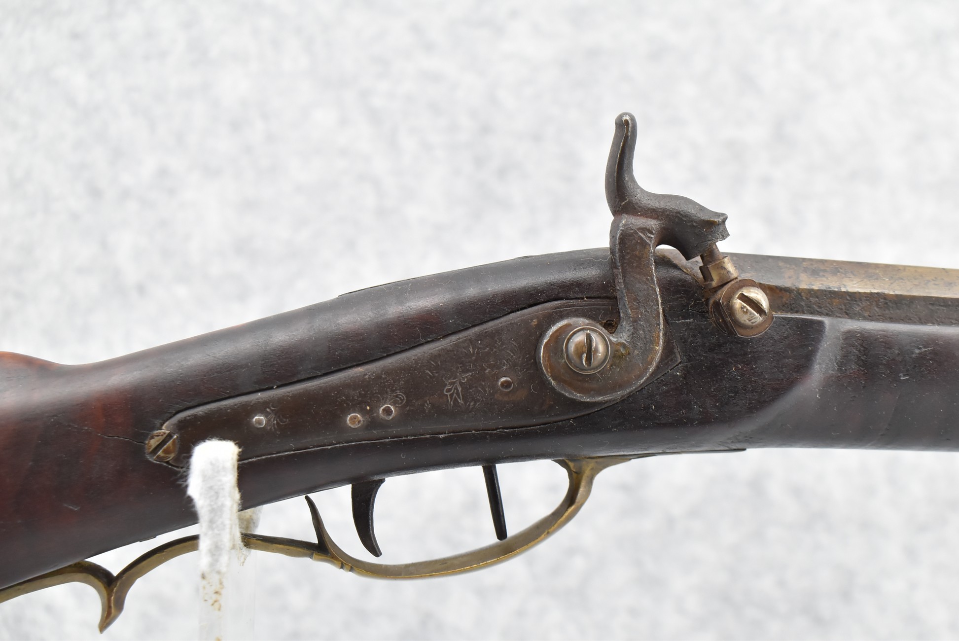 174. Unsigned Percussion 50 Cal. Kentucky Long Rifle – w/50 Cal. 38” Heavy Octagon Barrel w/Front & Rear Barrel Sights – w/Full Length Tiger Maple Restock w/Brass Cap Box & Furniture – w/Double Set Triggers – Note: Brass Toe Plate Pulled Loose at Butt Plate – Overall Length of 53 ¾”