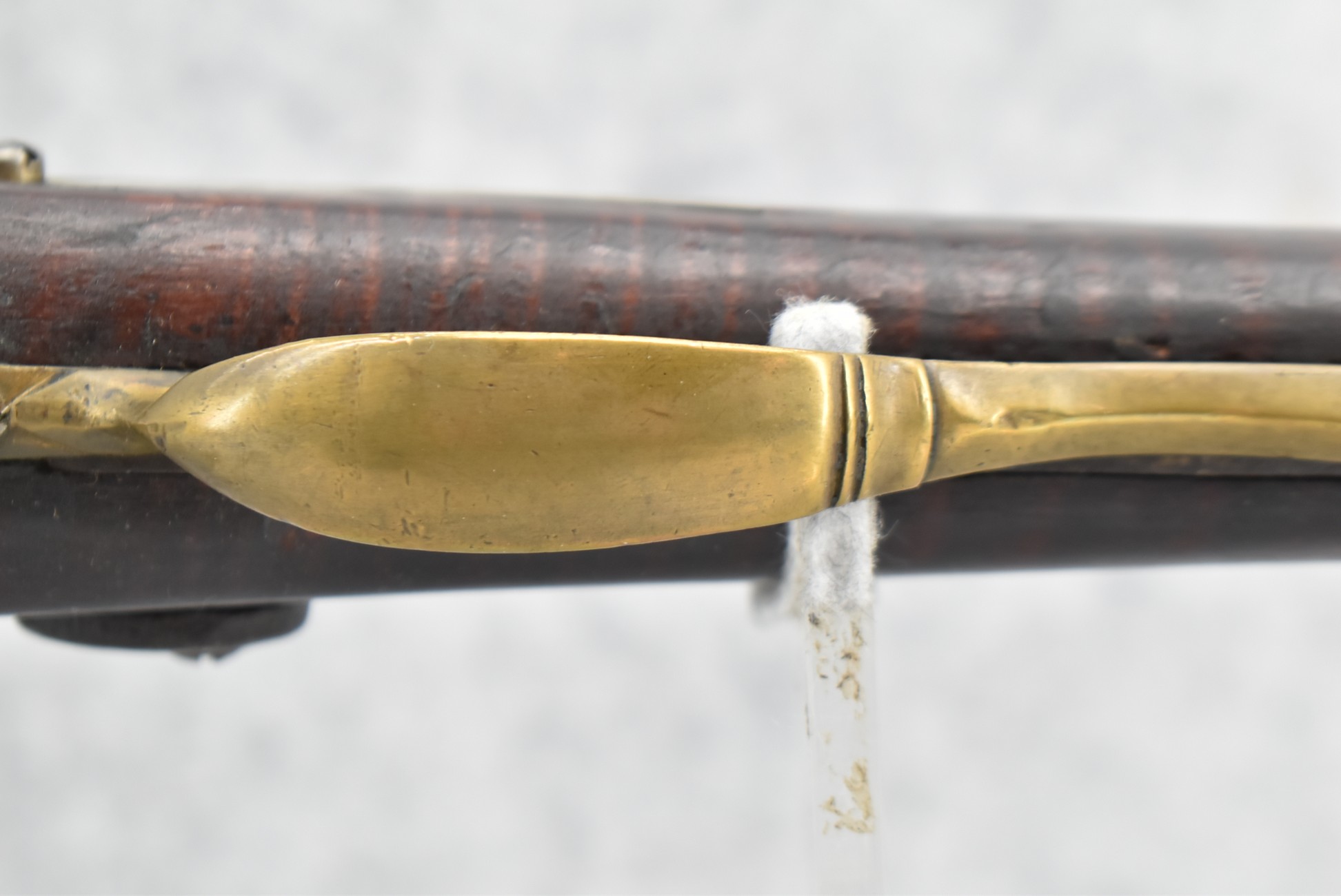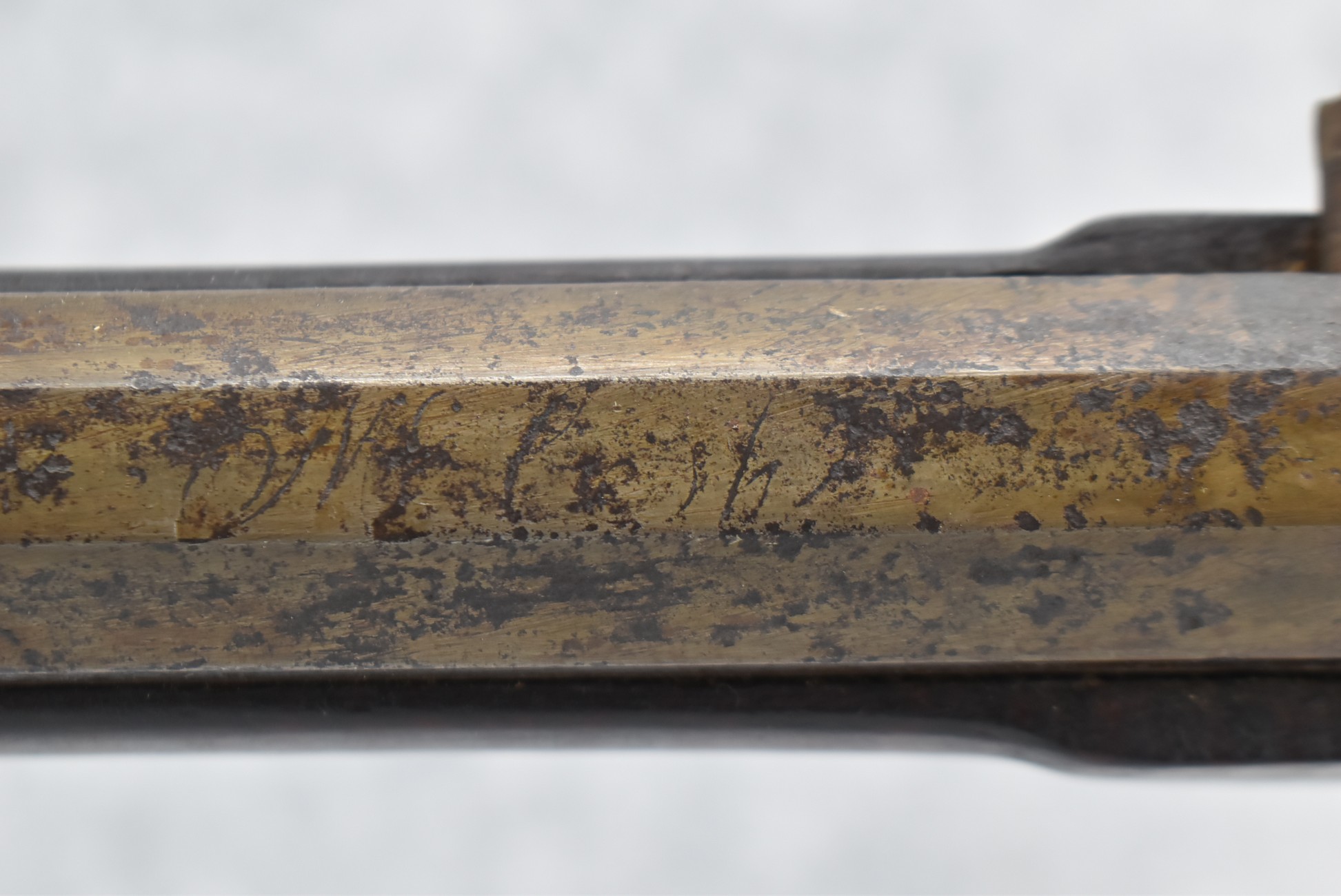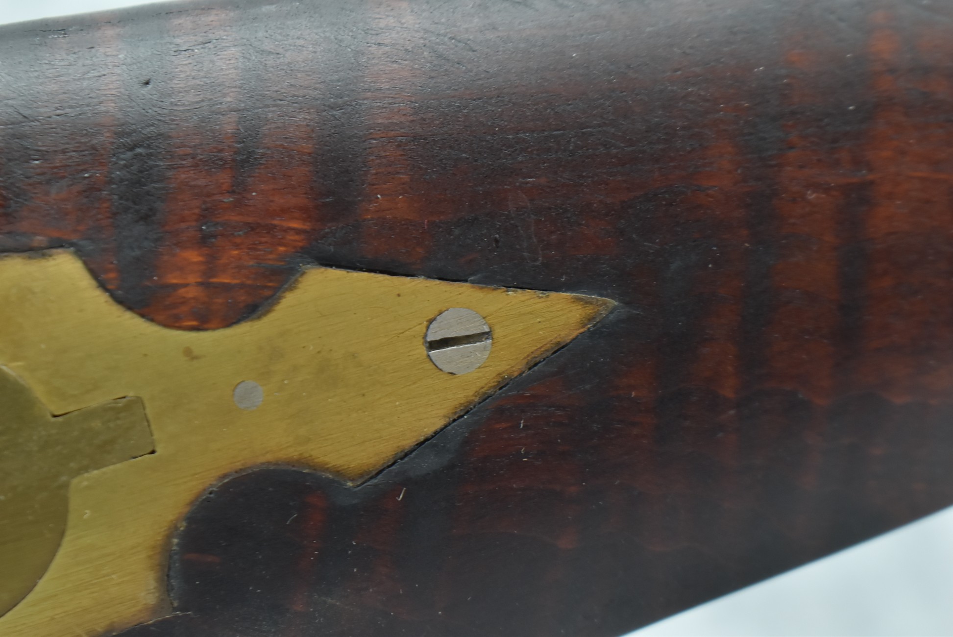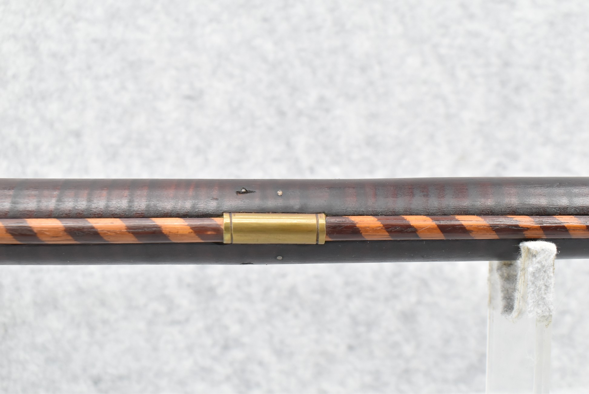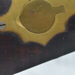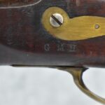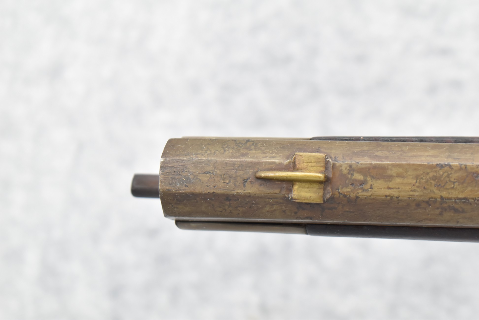 174. Unsigned Percussion 50 Cal. Kentucky Long Rifle – w/50 Cal. 38” Heavy Octagon Barrel w/Front & Rear Barrel Sights – w/Full Length Tiger Maple Restock w/Brass Cap Box & Furniture – w/Double Set Triggers – Note: Brass Toe Plate Pulled Loose at Butt Plate – Overall Length of 53 ¾”