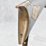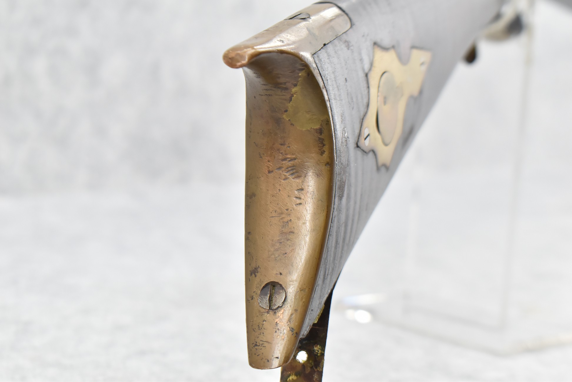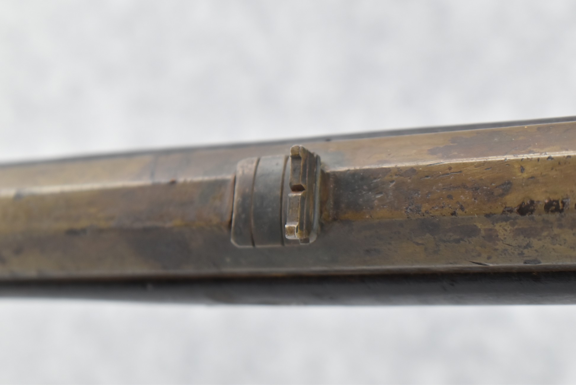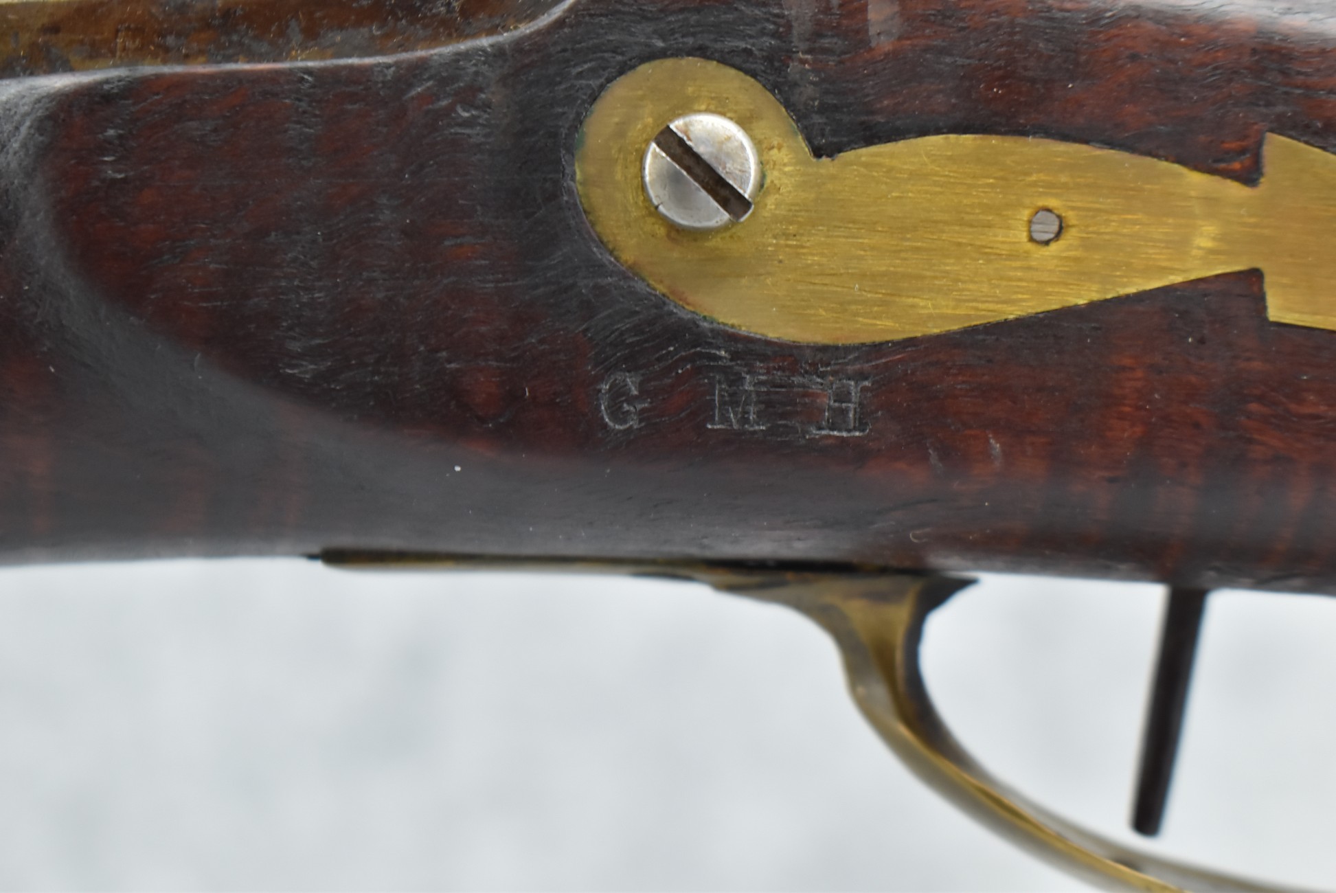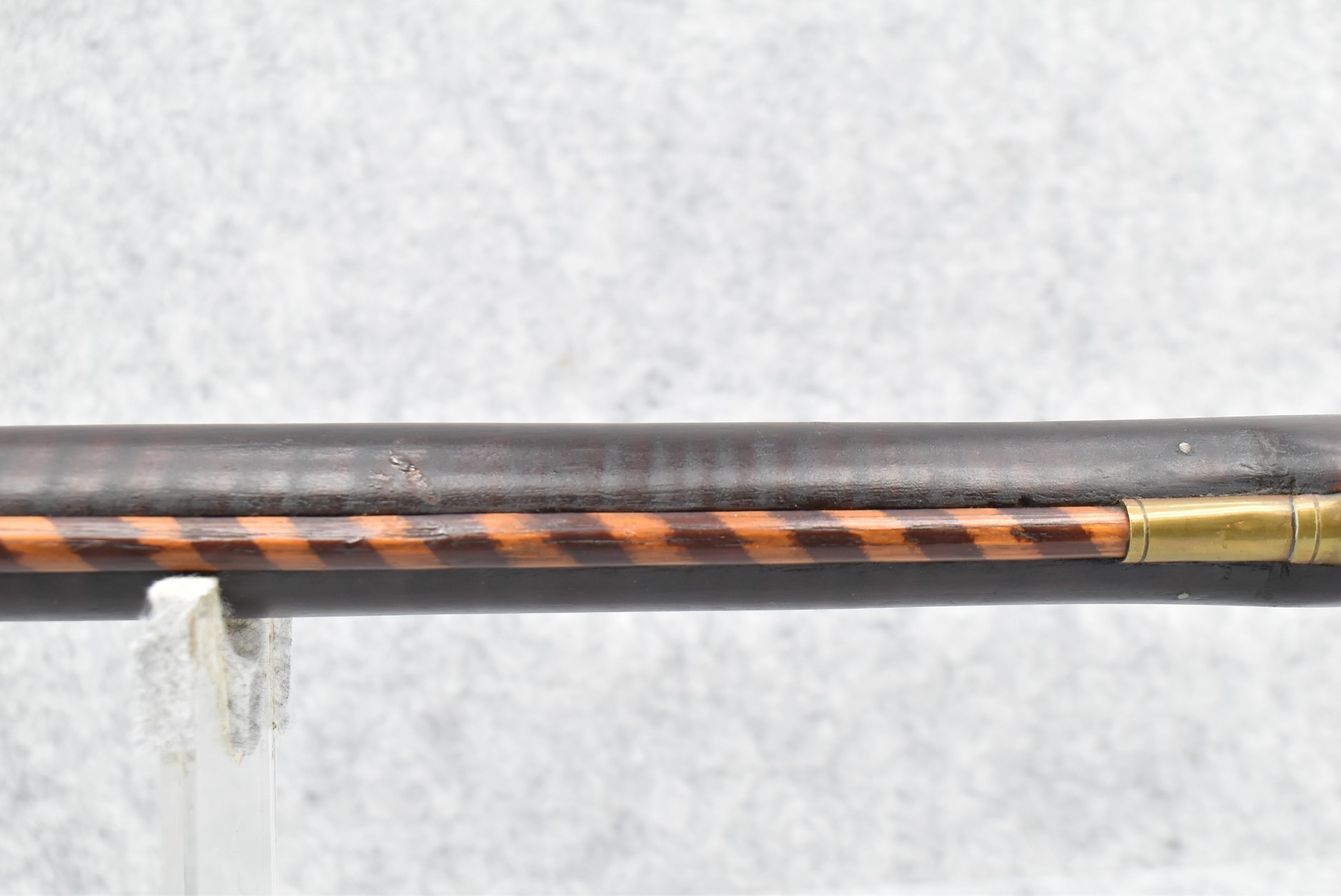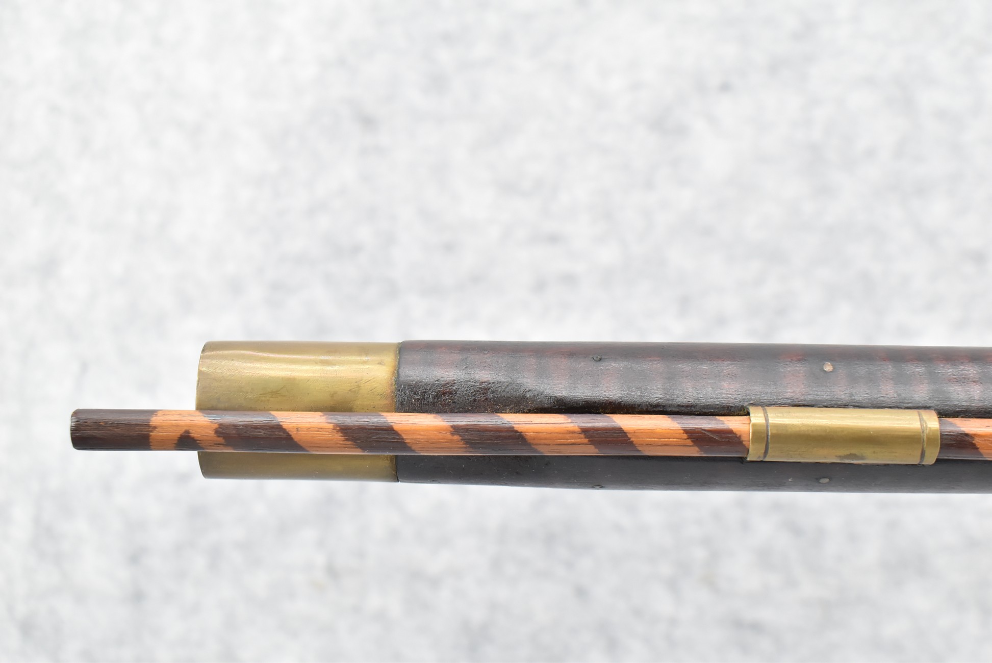 174. Unsigned Percussion 50 Cal. Kentucky Long Rifle – w/50 Cal. 38” Heavy Octagon Barrel w/Front & Rear Barrel Sights – w/Full Length Tiger Maple Restock w/Brass Cap Box & Furniture – w/Double Set Triggers – Note: Brass Toe Plate Pulled Loose at Butt Plate – Overall Length of 53 ¾”