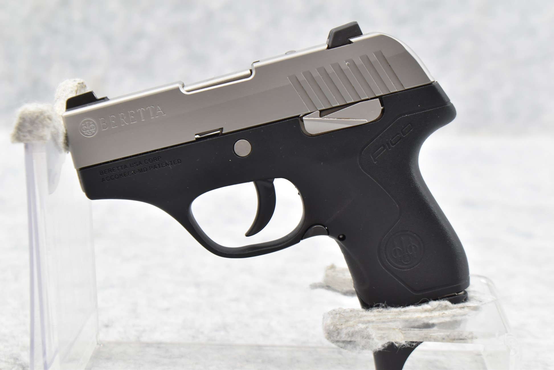 174R. Beretta – Mod. BU Pico 380 – 380 Auto Cal. Semi-Auto Pistol – w/2¾” Barrel w/3-Dot Factory Sights – Satin Stainless Finish – w/Black Polymer Frame and Grips – w/2 Factory Detachable Magazines – New in Factory Box w/Soft Case and Accessories