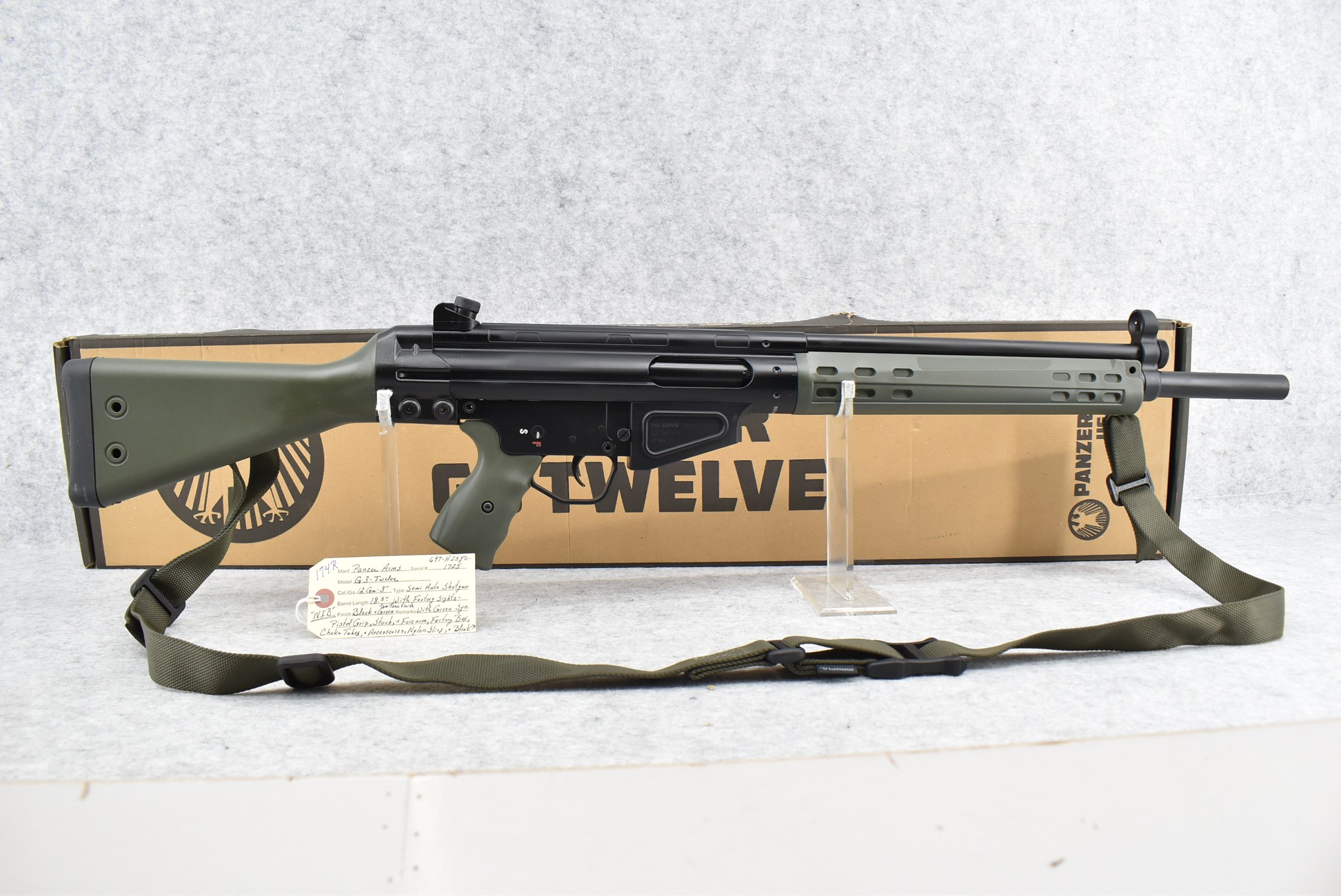 174R. Panzer Arms – Mod. G3-Twelve – 12ga. 3” Semi-Auto Shotgun – w/18.5” Barrel w/Factory Sights – Black/Green Two-Tone Finish – w/Green Synthetic Pistol Grip Stocks w/Butt Pad – w/Nylon Sling – New w/Factory Box, Choke Tubes & Accessories