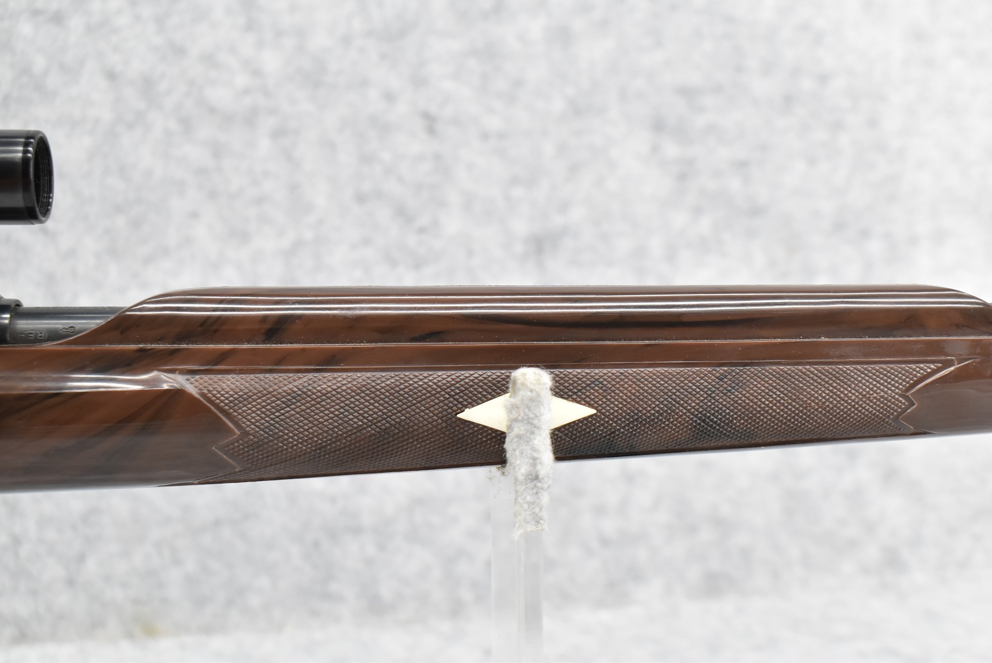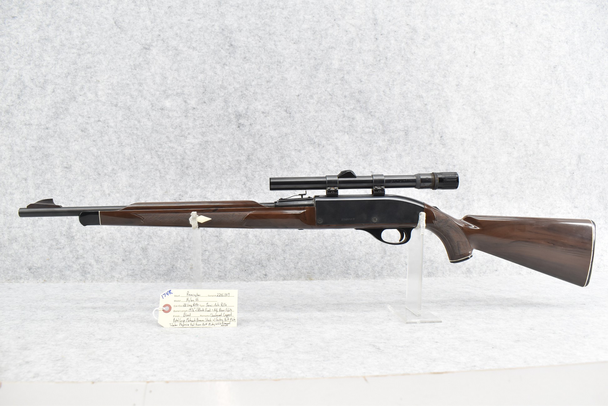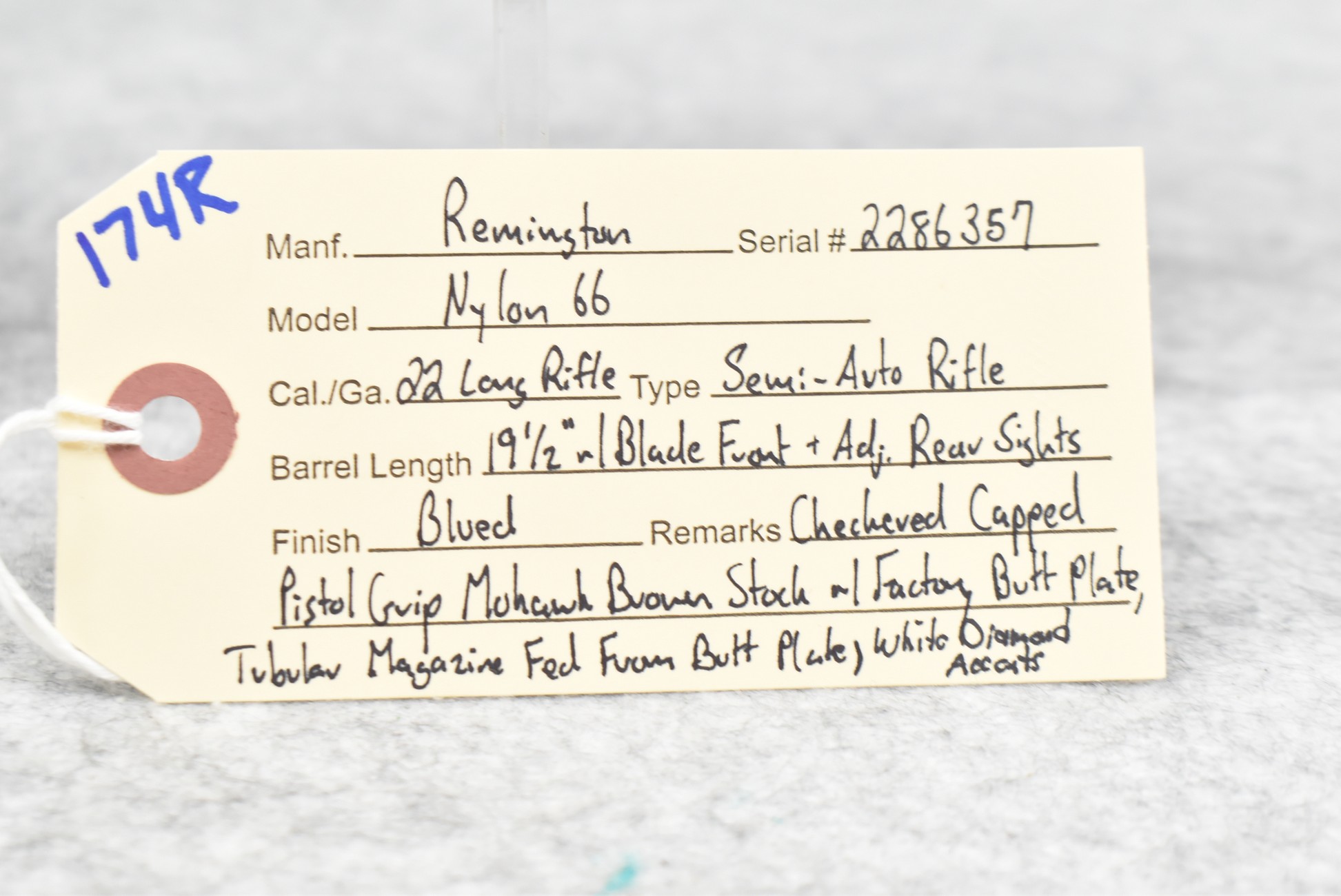 174R. Remington – Mod. Nylon 66 – 22 Long Rifle Cal. Semi-Auto Rifle – w/19 ½” Barrel w/Blade Front & Adj. Rear Sights – Blued Finish – w/Checkered Capped Pistol Grip Mohawk Brown Stock w/Factory Butt Plate & White Diamond Accents – Tubular Fed From Butt Plate