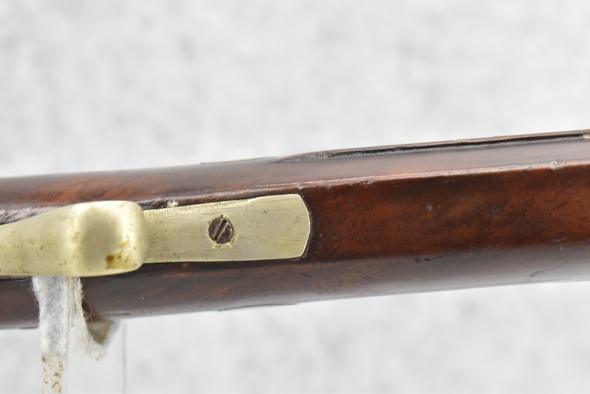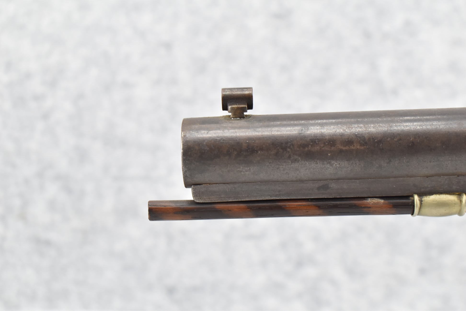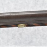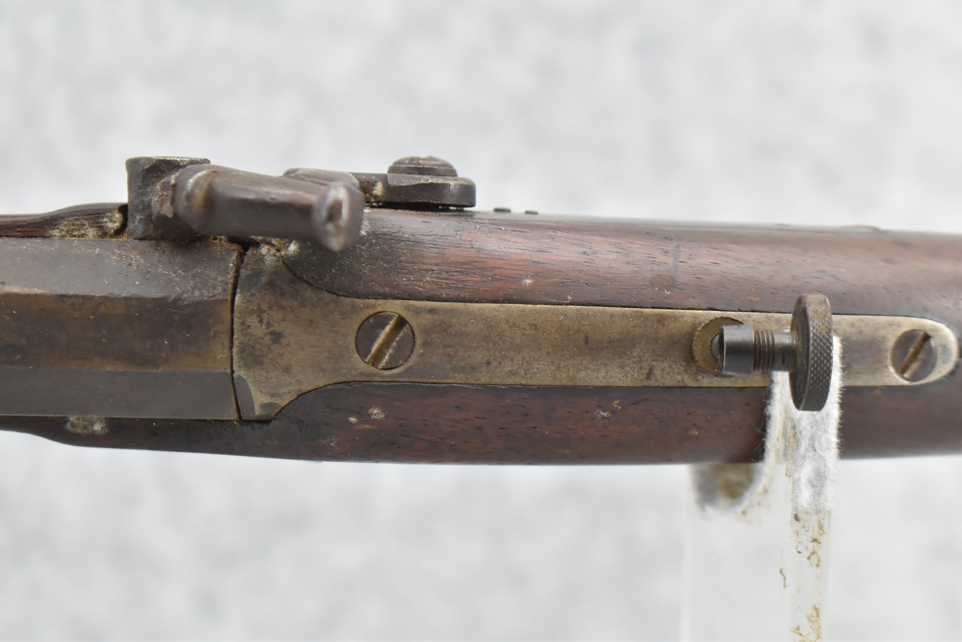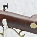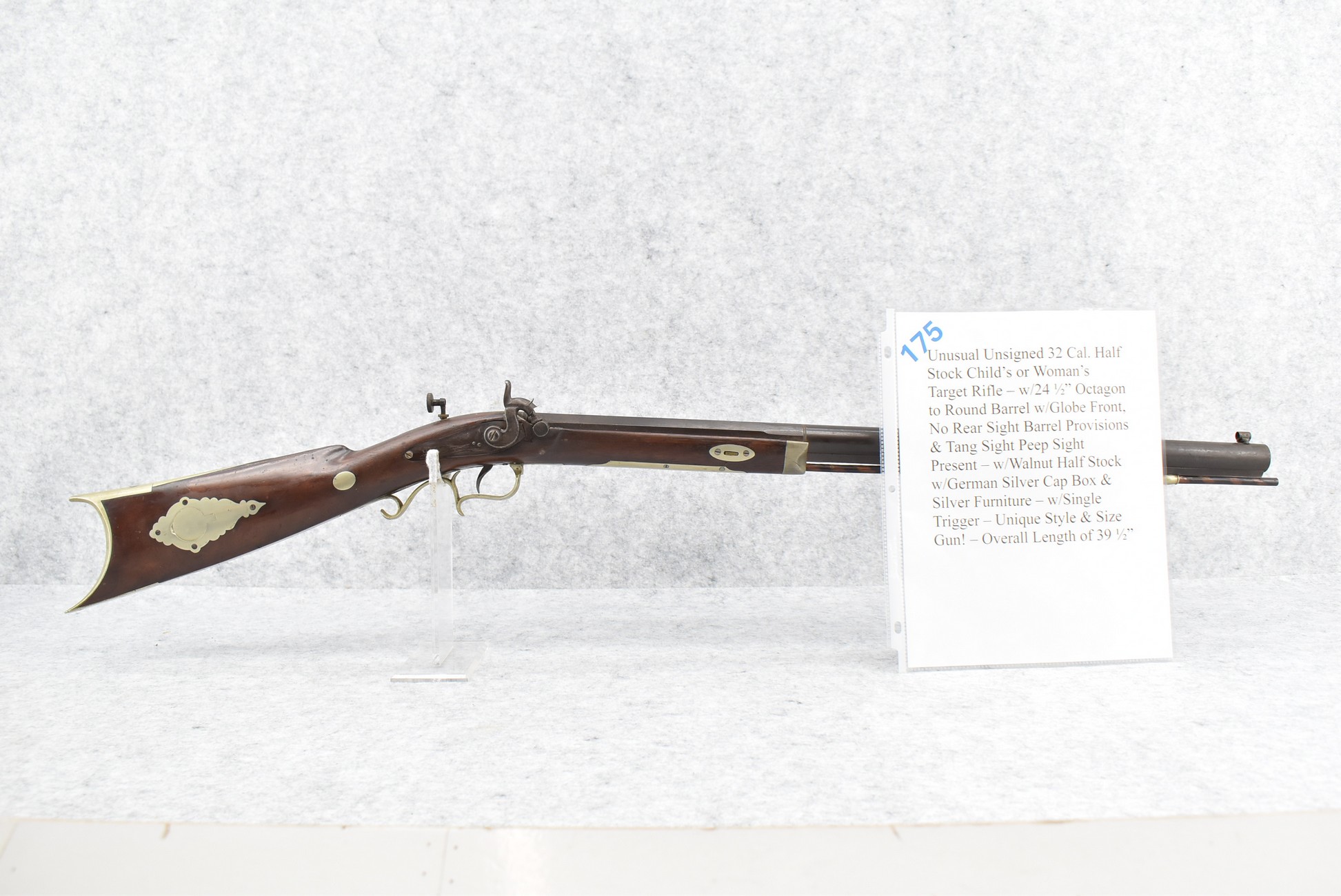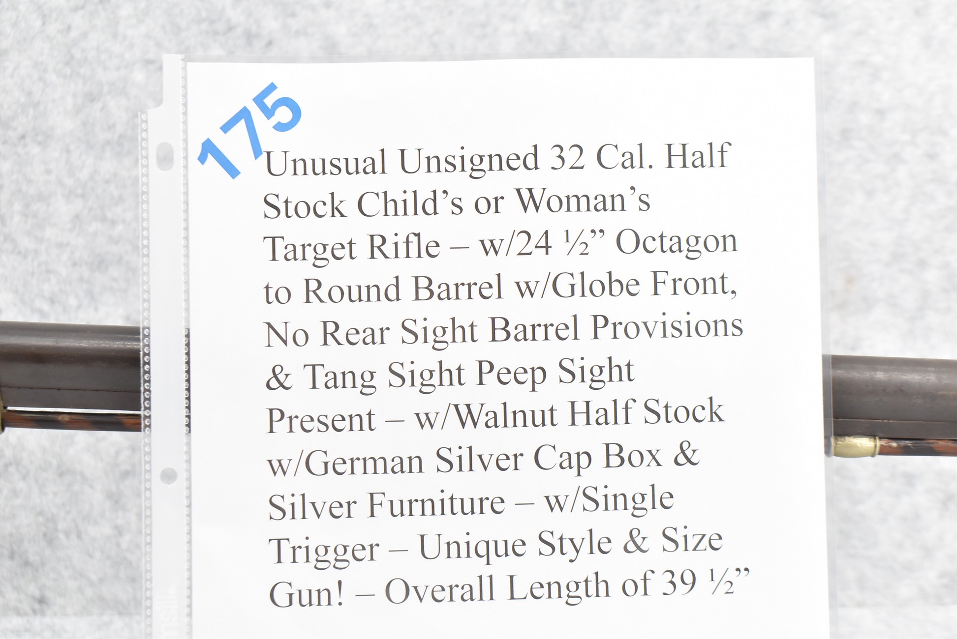 175. Unusual Unsigned 32 Cal. Half Stock Child’s or Woman’s Target Rifle – w/24 ½” Octagon to Round Barrel w/Globe Front, No Rear Sight Barrel Provisions & Tang Sight Peep Sight Present – w/Walnut Half Stock w/German Silver Cap Box & Silver Furniture – w/Single Trigger – Unique Style & Size Gun! – Overall Length of 39 ½”