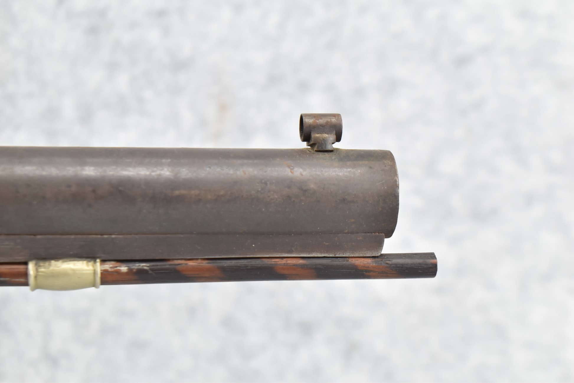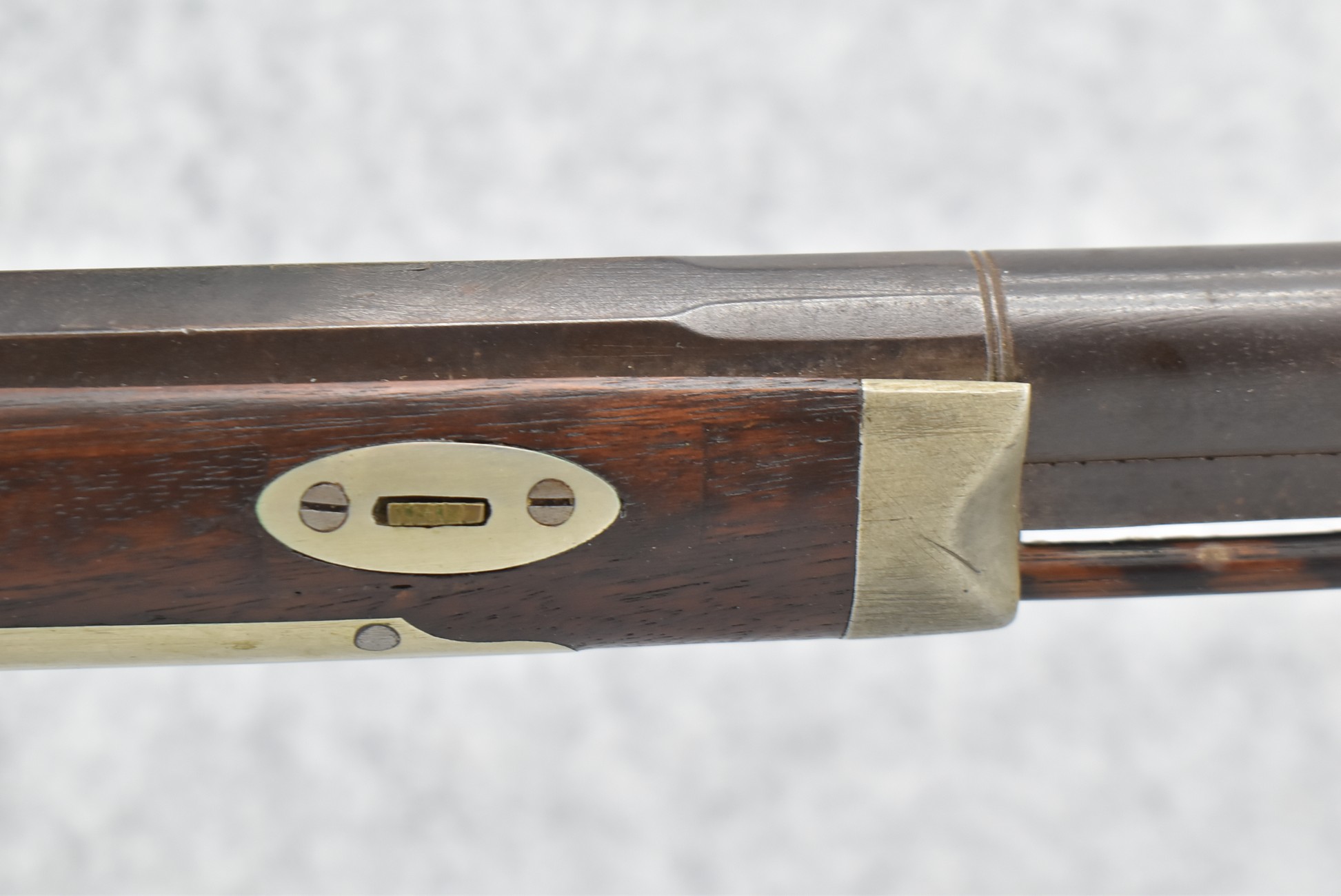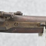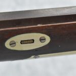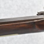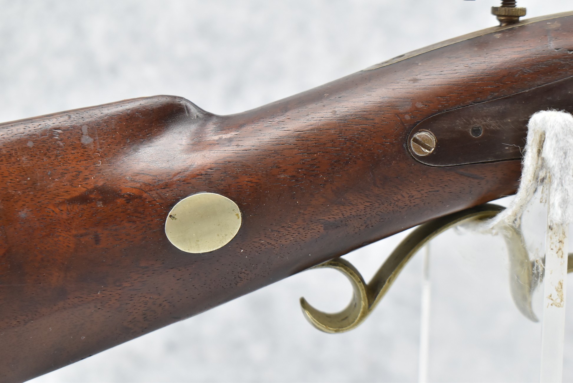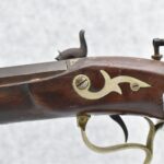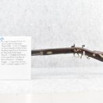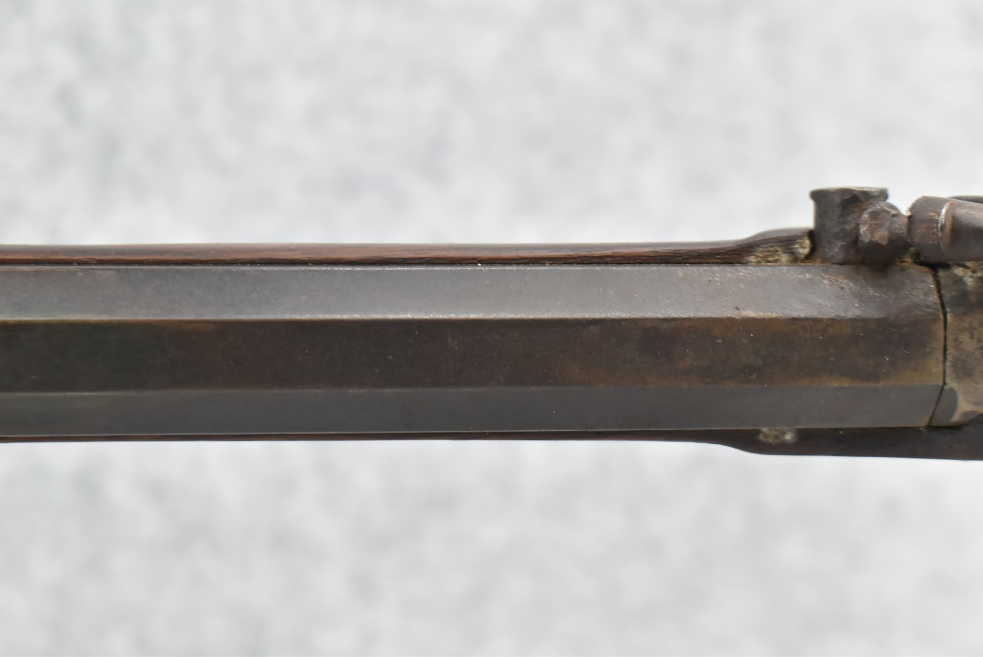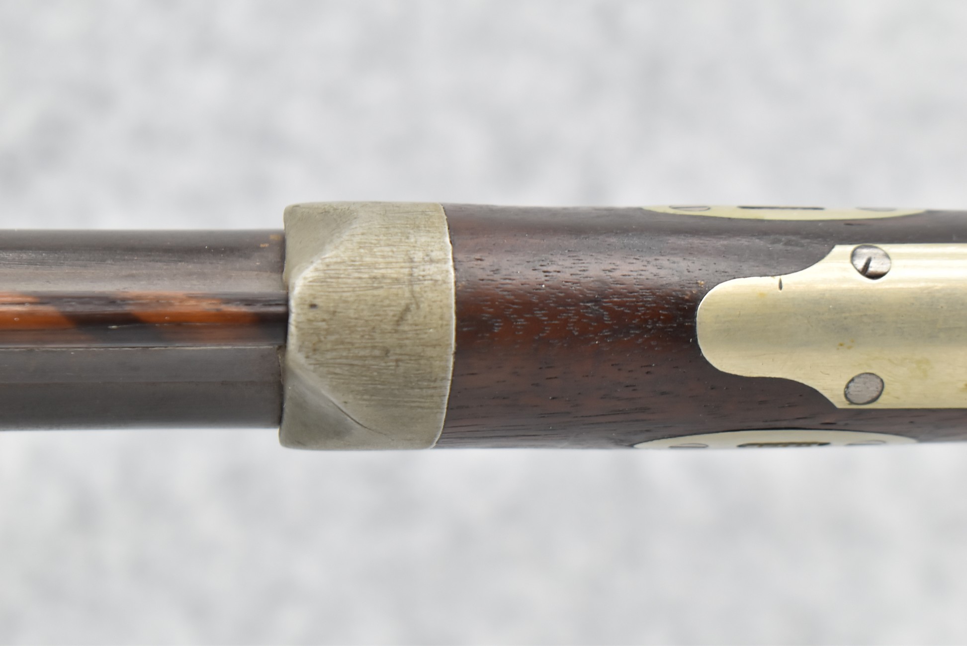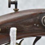 175. Unusual Unsigned 32 Cal. Half Stock Child’s or Woman’s Target Rifle – w/24 ½” Octagon to Round Barrel w/Globe Front, No Rear Sight Barrel Provisions & Tang Sight Peep Sight Present – w/Walnut Half Stock w/German Silver Cap Box & Silver Furniture – w/Single Trigger – Unique Style & Size Gun! – Overall Length of 39 ½”