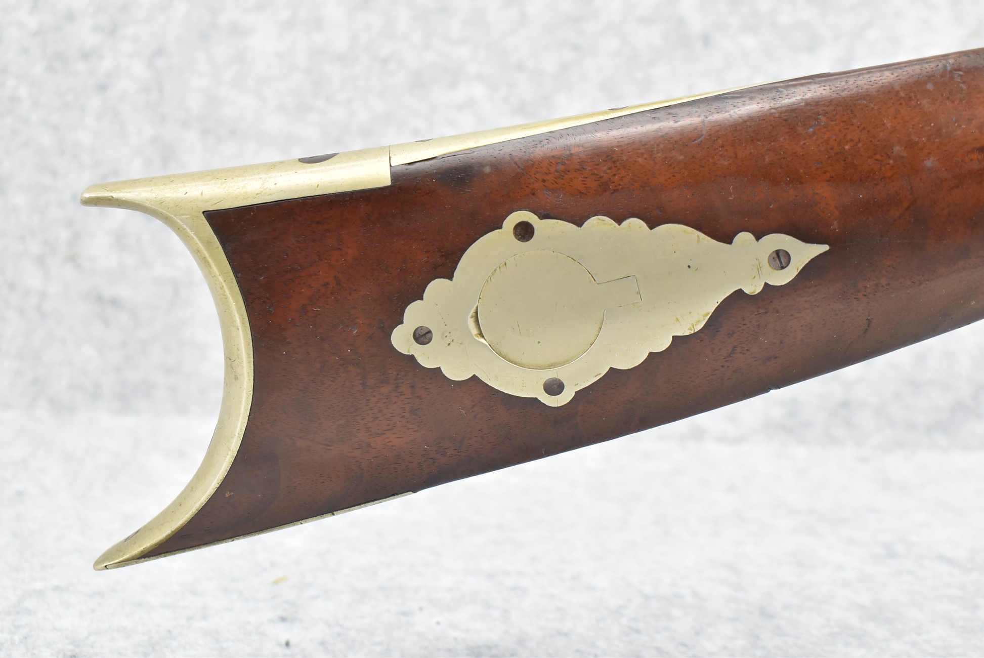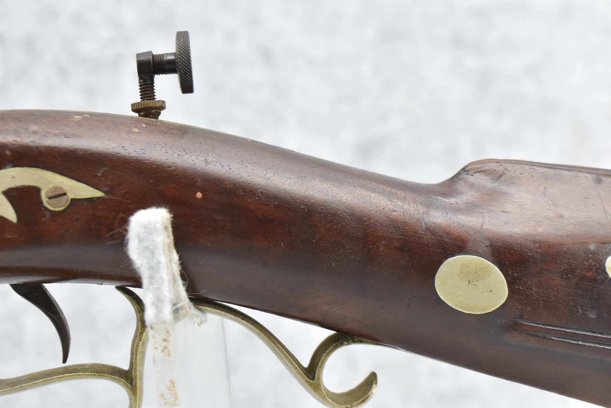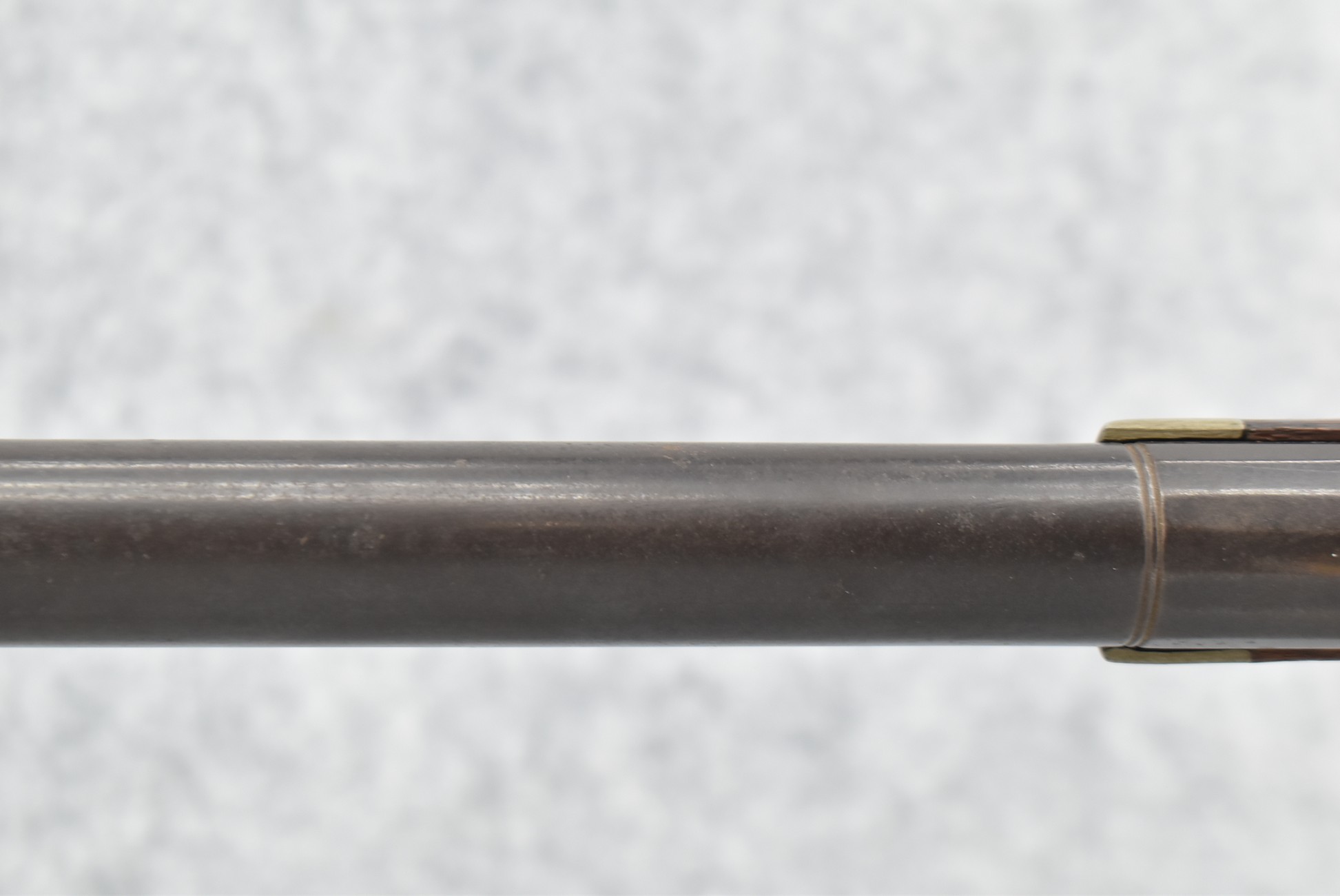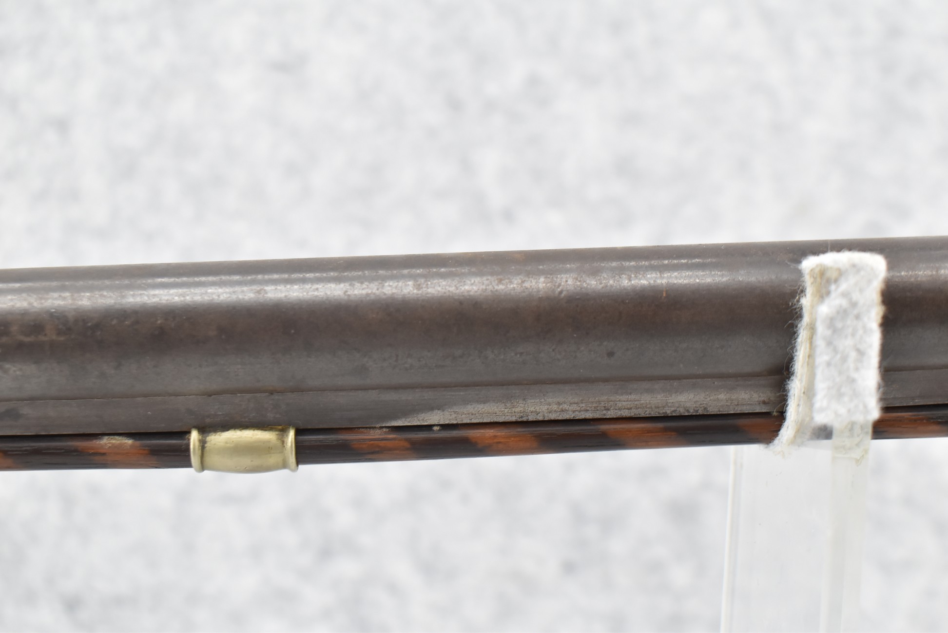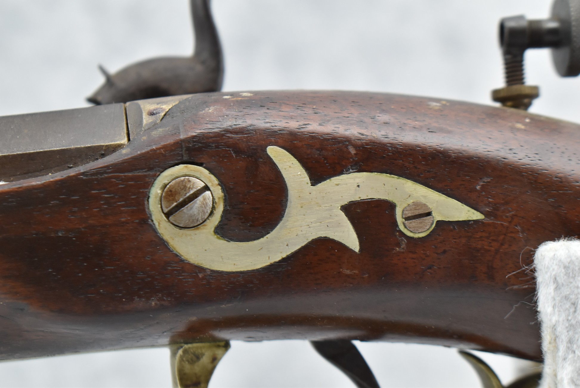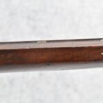 175. Unusual Unsigned 32 Cal. Half Stock Child’s or Woman’s Target Rifle – w/24 ½” Octagon to Round Barrel w/Globe Front, No Rear Sight Barrel Provisions & Tang Sight Peep Sight Present – w/Walnut Half Stock w/German Silver Cap Box & Silver Furniture – w/Single Trigger – Unique Style & Size Gun! – Overall Length of 39 ½”