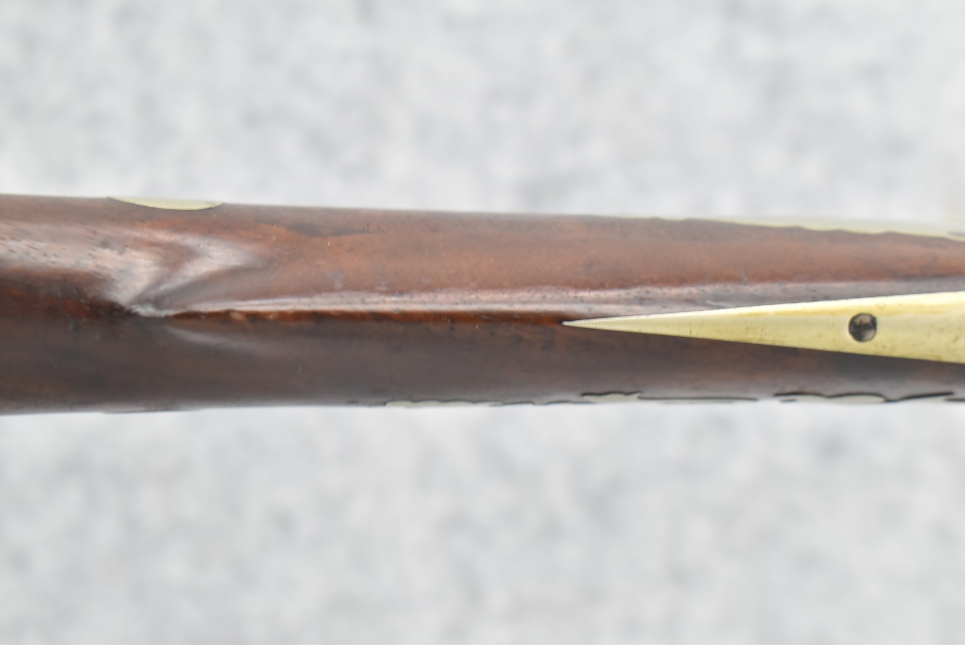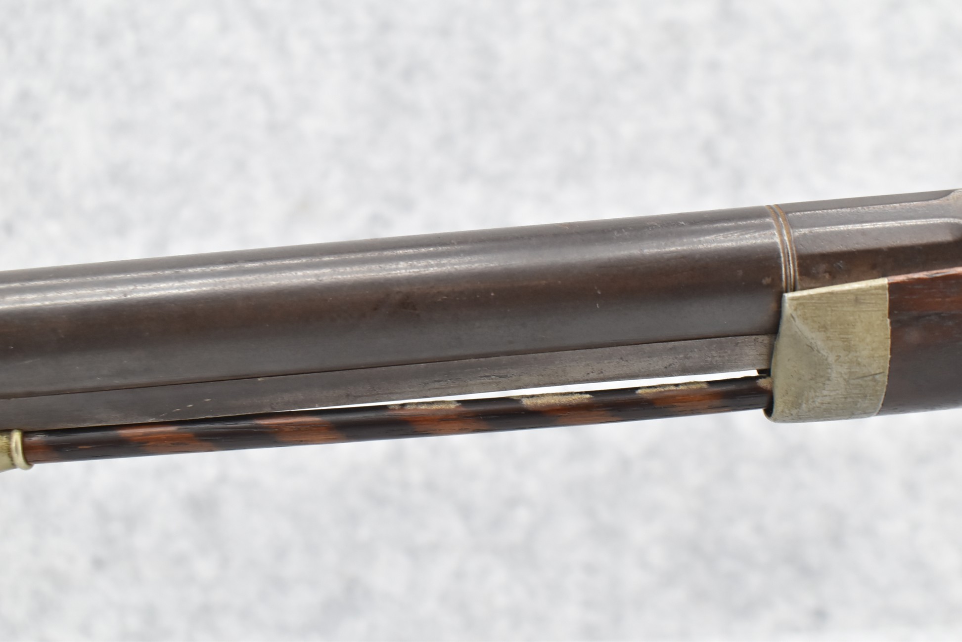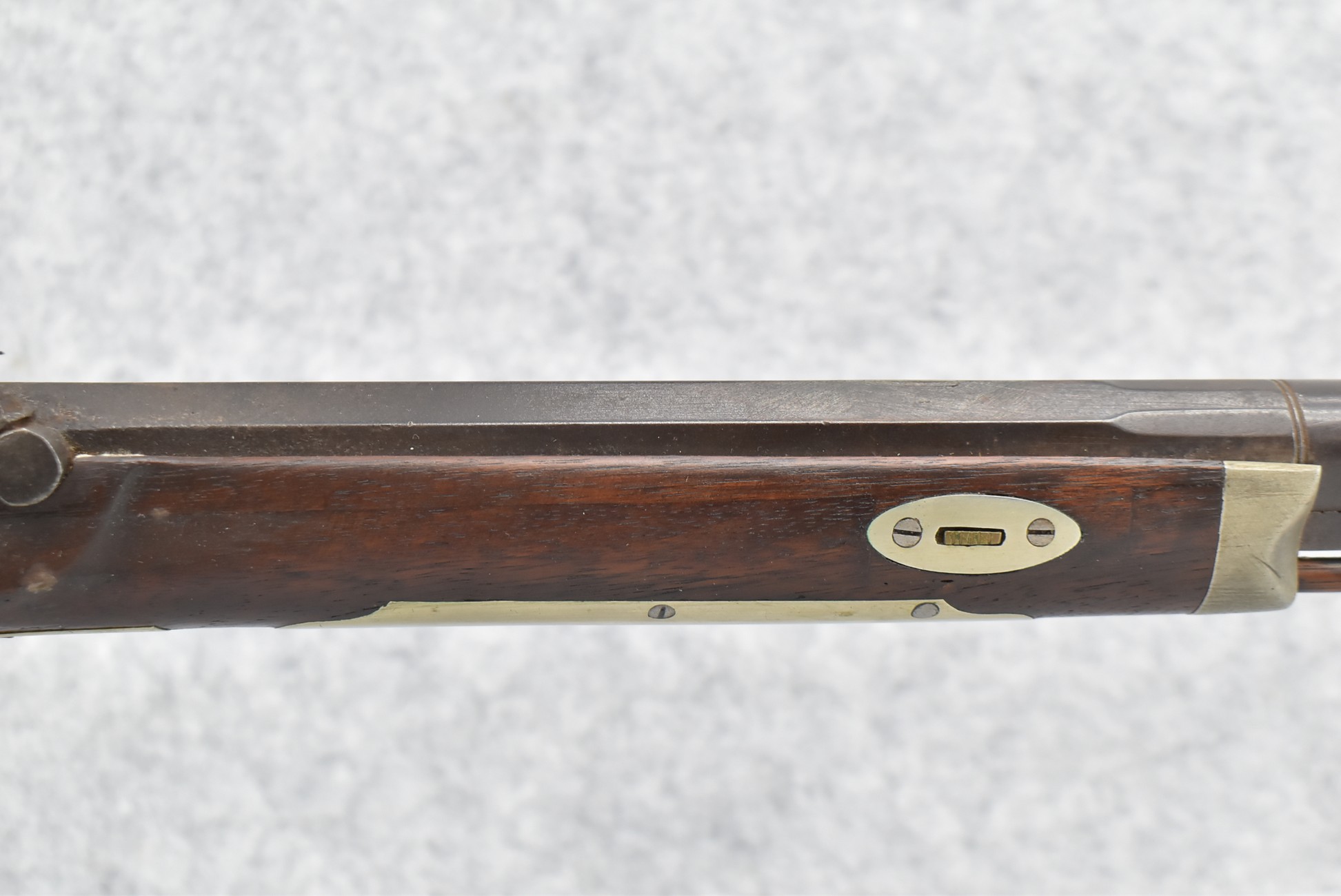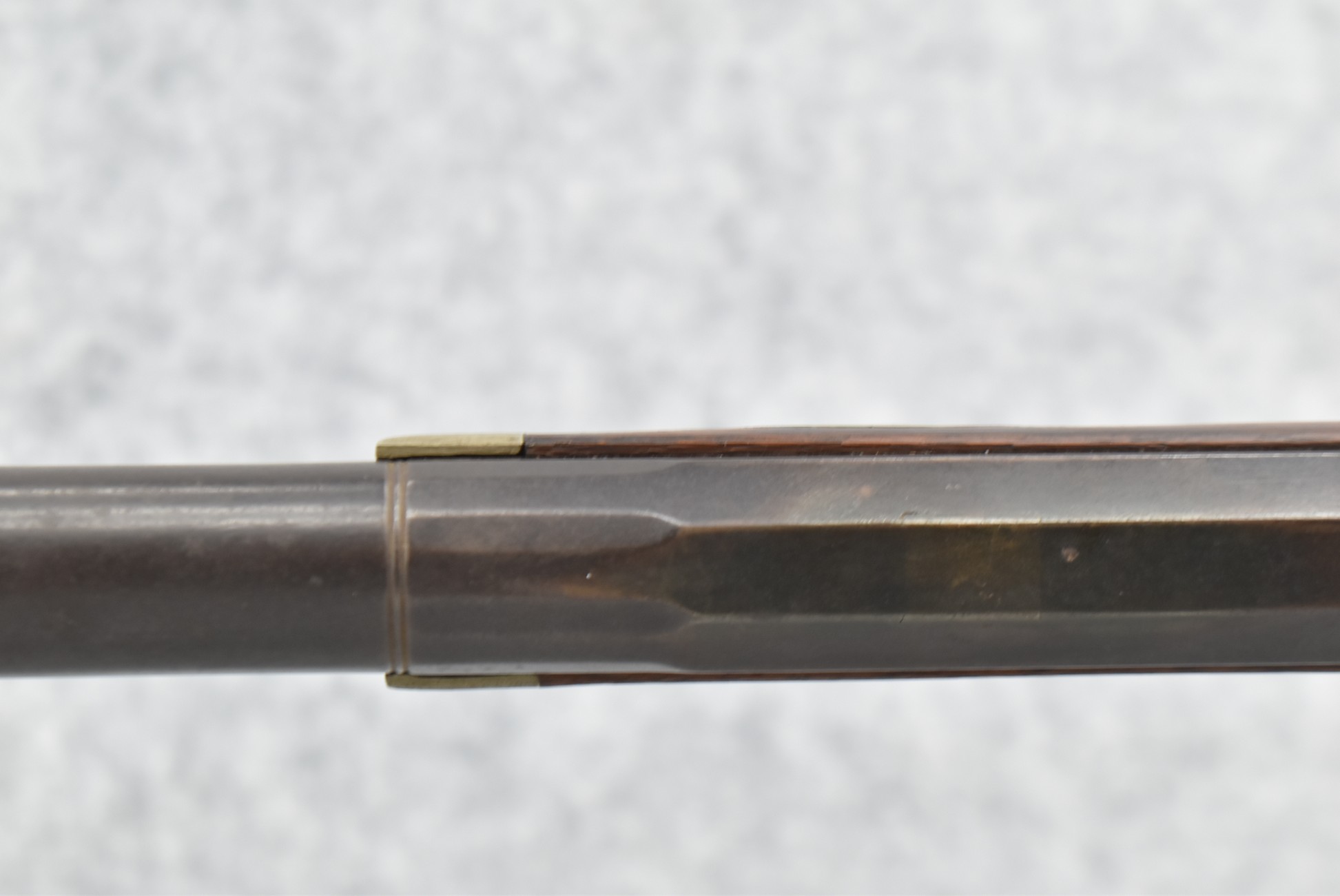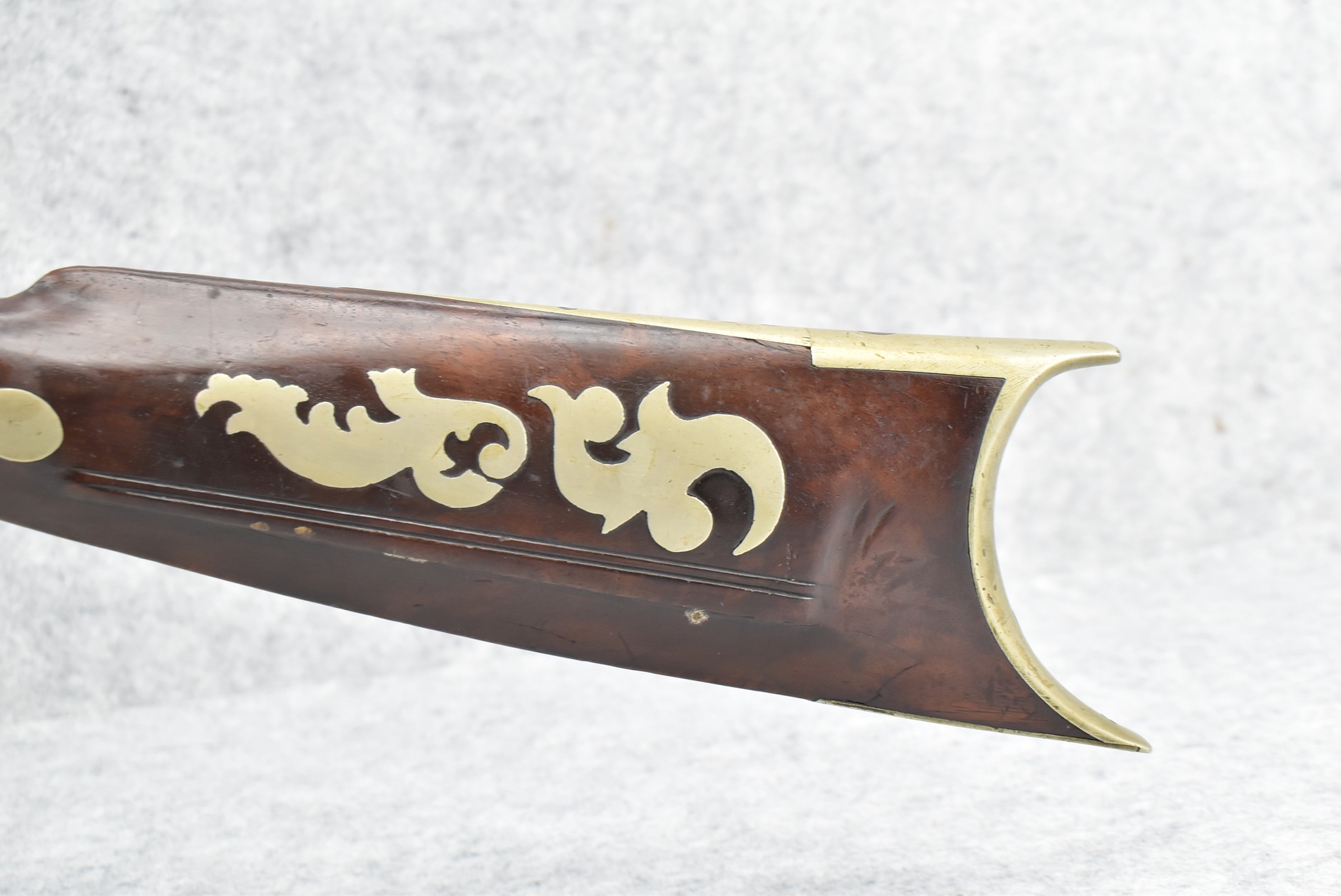 175. Unusual Unsigned 32 Cal. Half Stock Child’s or Woman’s Target Rifle – w/24 ½” Octagon to Round Barrel w/Globe Front, No Rear Sight Barrel Provisions & Tang Sight Peep Sight Present – w/Walnut Half Stock w/German Silver Cap Box & Silver Furniture – w/Single Trigger – Unique Style & Size Gun! – Overall Length of 39 ½”