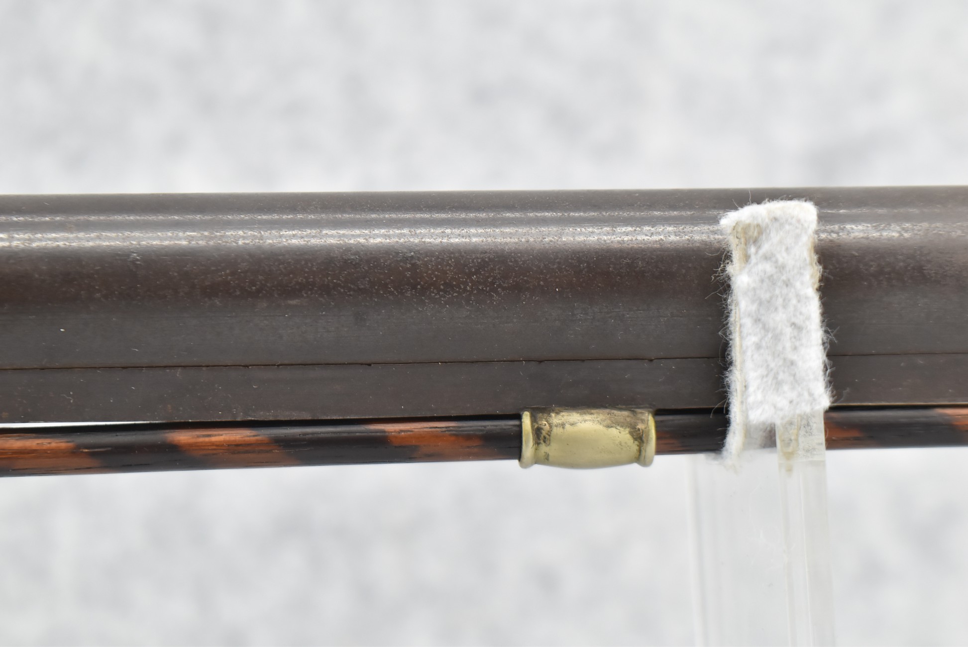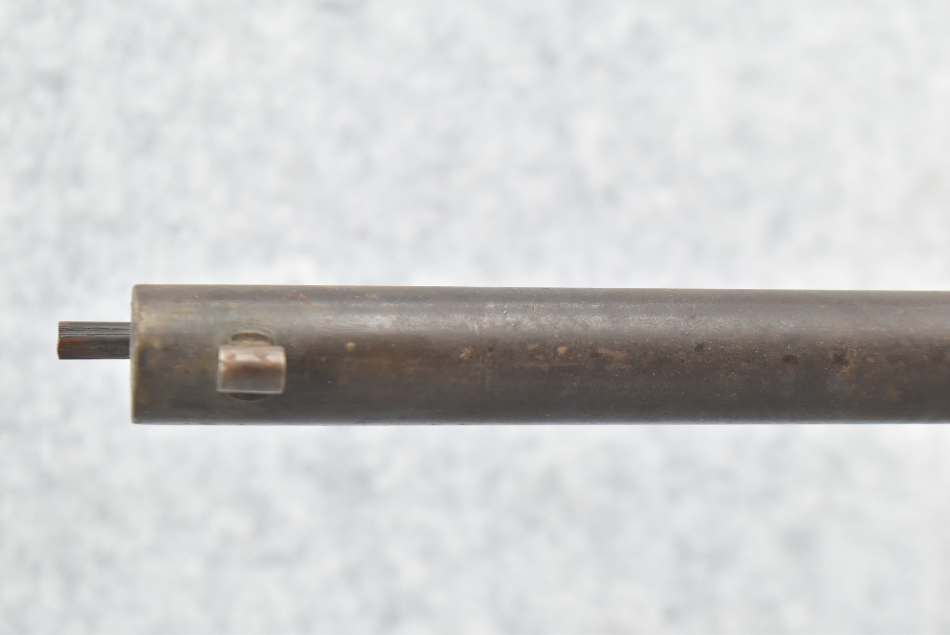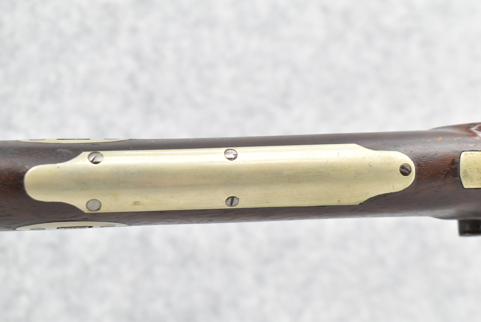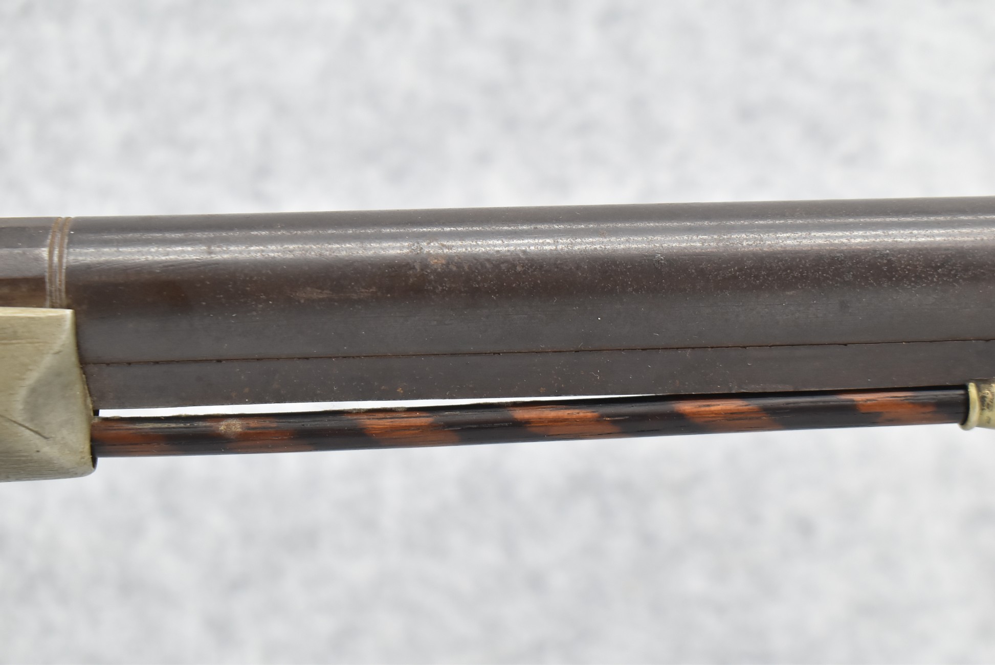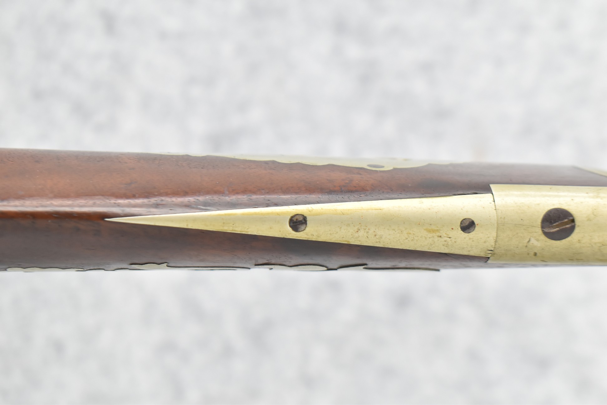 175. Unusual Unsigned 32 Cal. Half Stock Child’s or Woman’s Target Rifle – w/24 ½” Octagon to Round Barrel w/Globe Front, No Rear Sight Barrel Provisions & Tang Sight Peep Sight Present – w/Walnut Half Stock w/German Silver Cap Box & Silver Furniture – w/Single Trigger – Unique Style & Size Gun! – Overall Length of 39 ½”