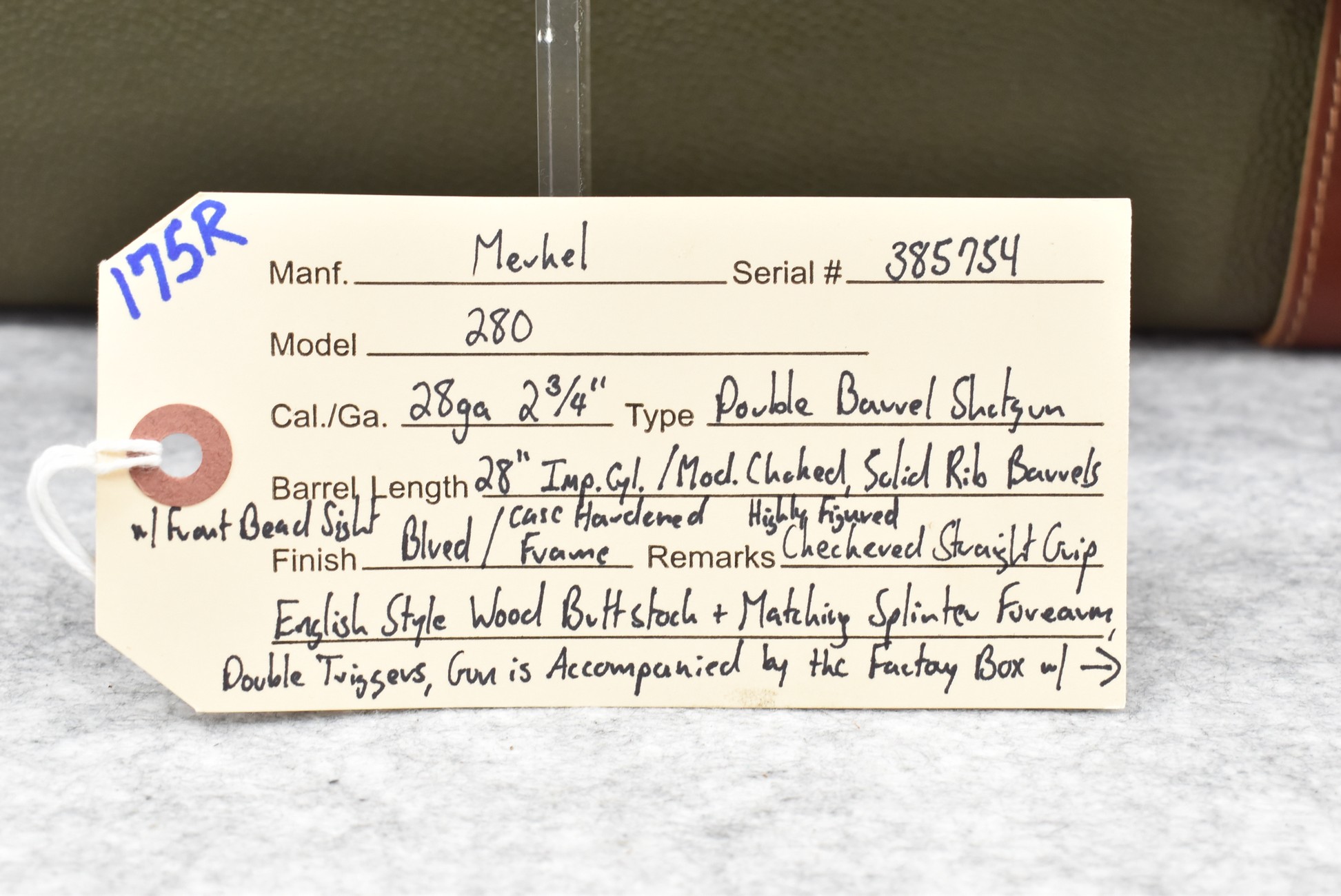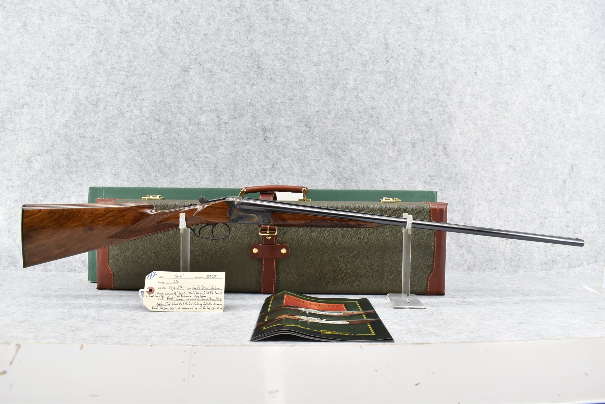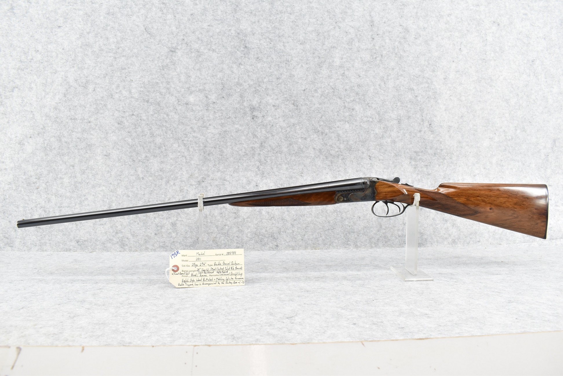 175R. Merkel – Mod. 280 – 28ga. 2 ¾” Double Barrel Shotgun – w/28” Imp. Cyl./Mod. Choked, Solid Rib Barrels w/Front Bead Sight – Blued Finish w/Case Hardened Frame – w/Highly Figured Checkered Straight Grip English Style Wood Butt Stock w/Factory Butt Plate & Matching Splinter Forearm – w/Double Triggers – Gun is Accompanied by the Factory Box, Manuals & Factory Merkel Leather Takedown Case w/Keys