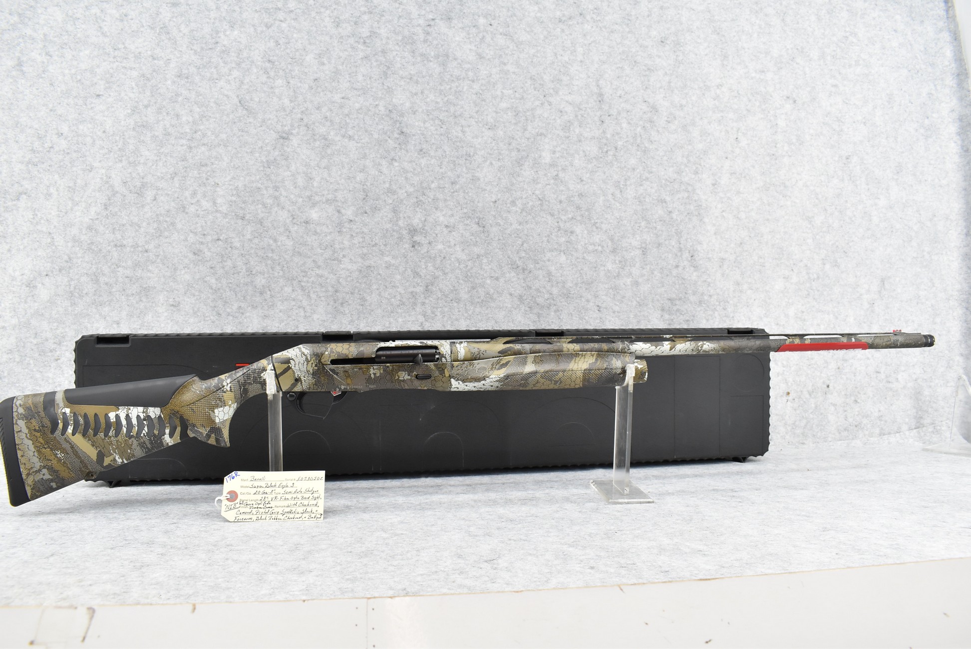 176R. Benelli – Mod. Super Black Eagle 3 – 20ga. 3” Semi-Auto Shotgun – w/28” Vent-Rib Barrel w/Fiber Optic Bead Sight – Full Gore OptiFade Timber Camo Coverage – w/Checkered Camoed Pistol Grip Synthetic Stocks w/Black Rubber Cheek Piece & Butt Pad – New w/Factory Hard Case & Manual