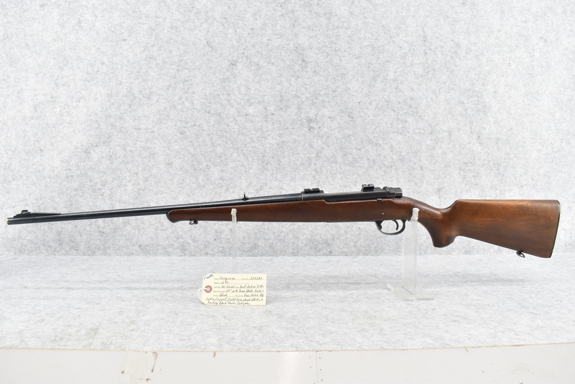 176R. Husqvarna – Mod. 1640 – 30-06 U.S. Cal. Bolt Action Rifle – w/24” Barrel w/Ramp Blade Front and Adjustable Rear Notch Sights – Blued Finish – w/Capped Pistol Grip Wood Stock w/Factory Butt Plate