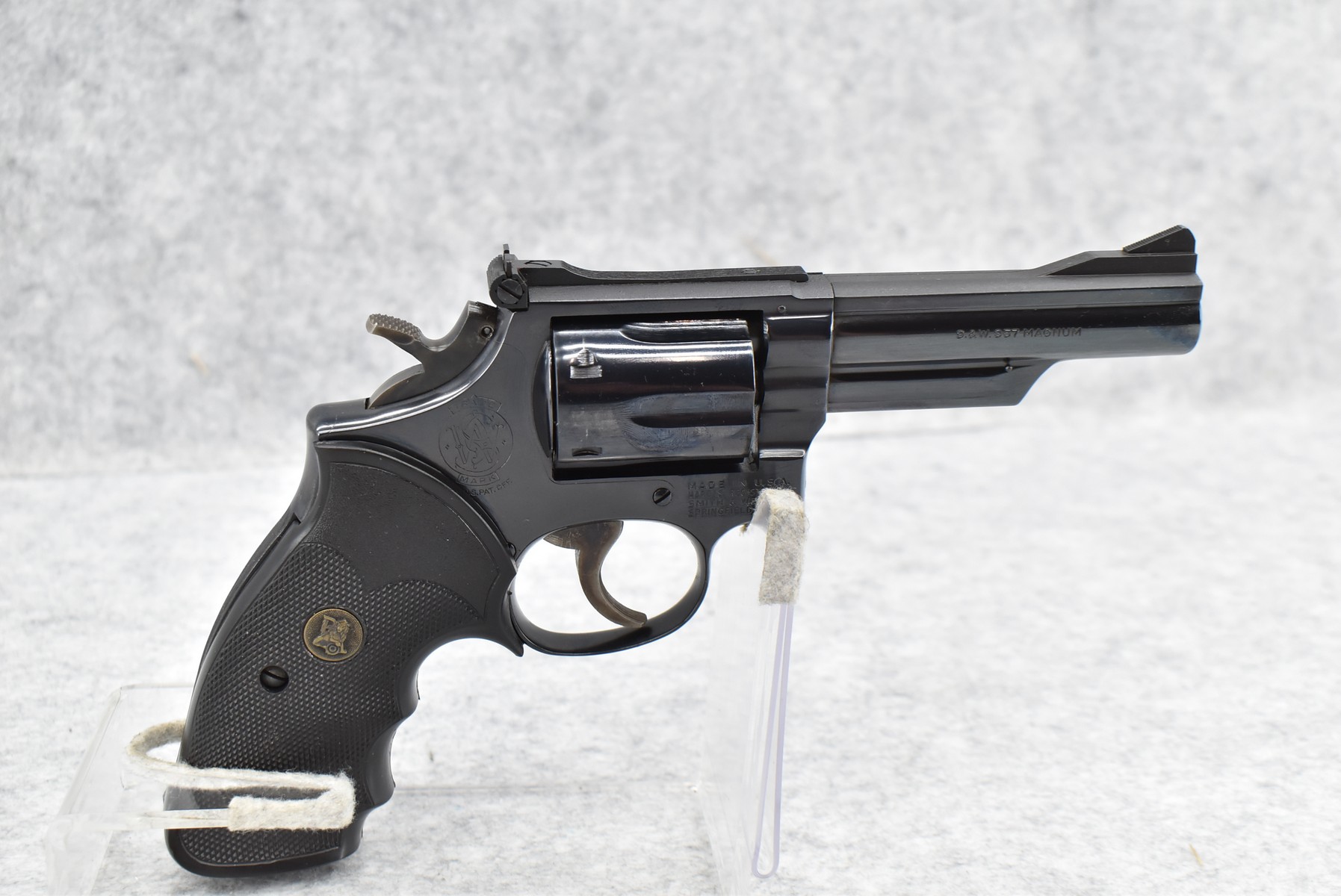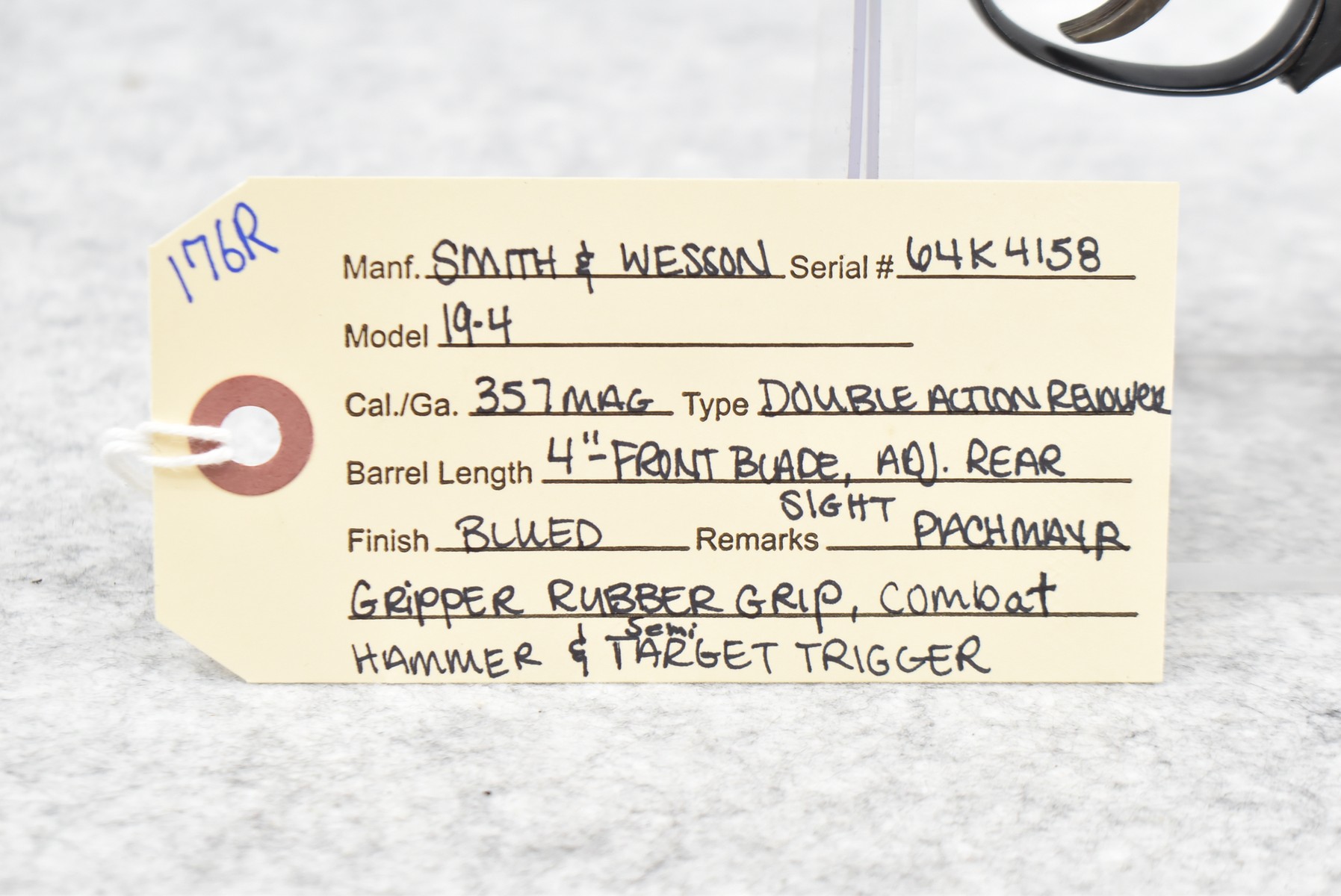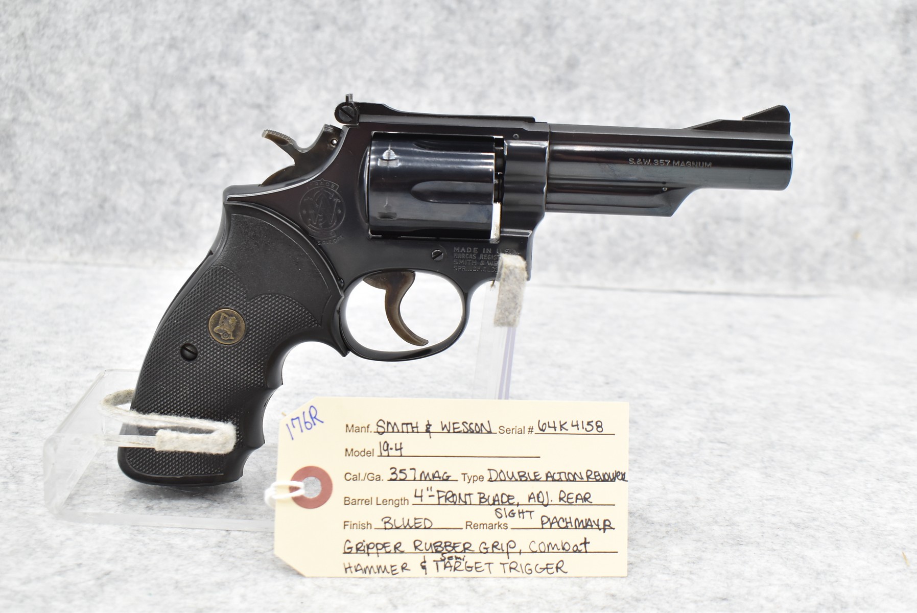 176R. Smith & Wesson – Mod. 19-4 – 357 Mag. Cal. Double Action Revolver – w/4” Barrel w/Front Blade & Adj. Rear Sights – Blued Finish – w/Pachmayr Grip Rubber Grip – Mfg. 1980