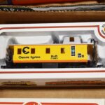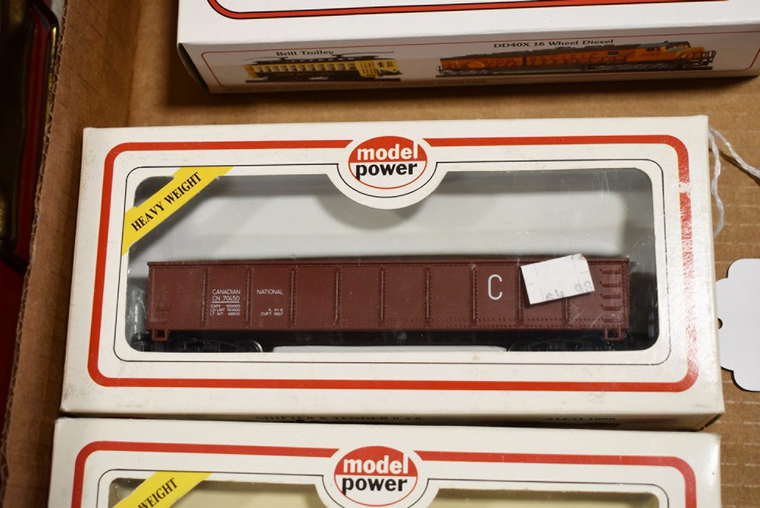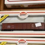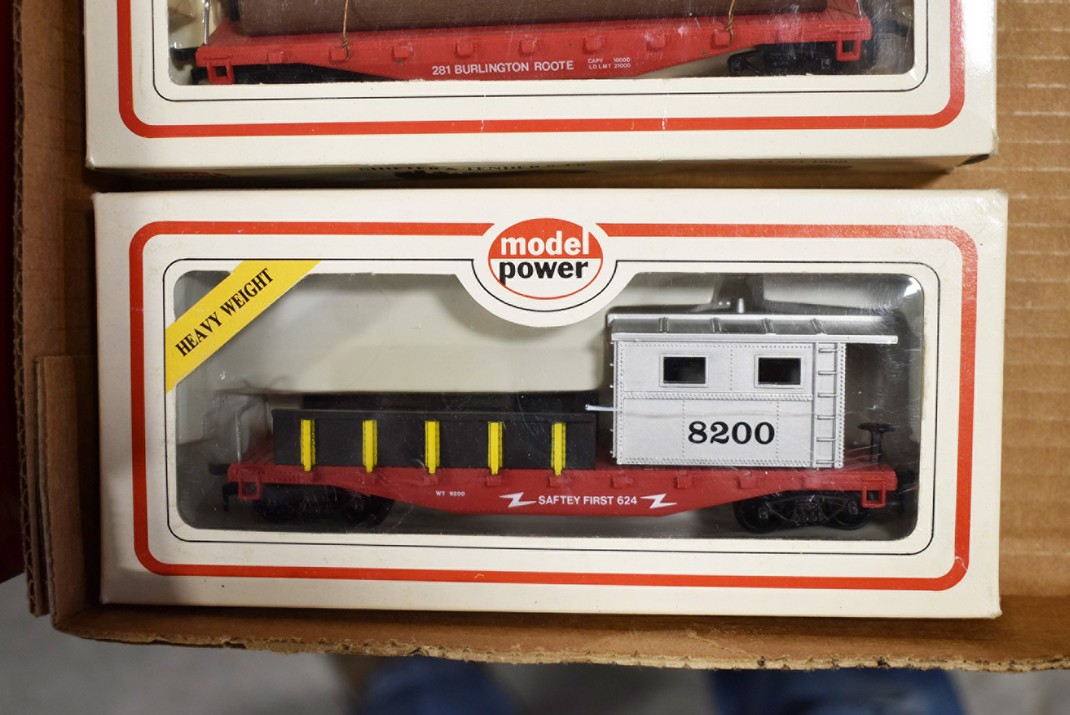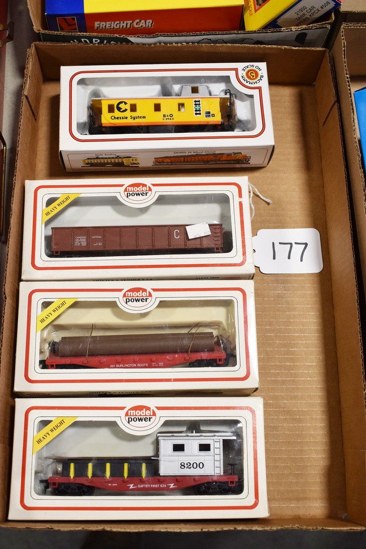 177. Lot of 4 HO-Scale Train Cars – Including Model Power 8200 Safety, Model Power 8210 Burlington, Model Power 8504 CN, and Bachmann Chessie System B&O C-3963 – All w/Boxes