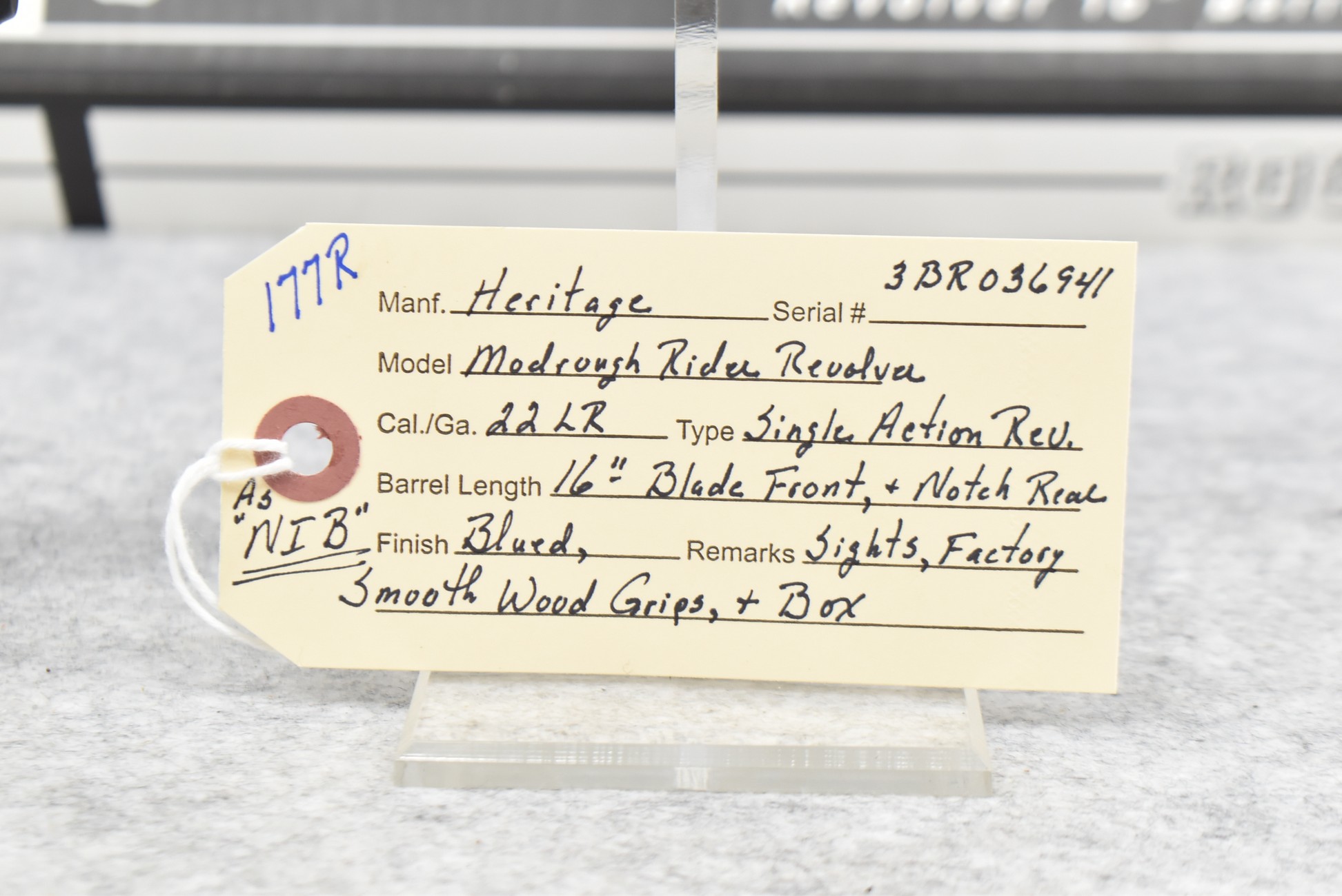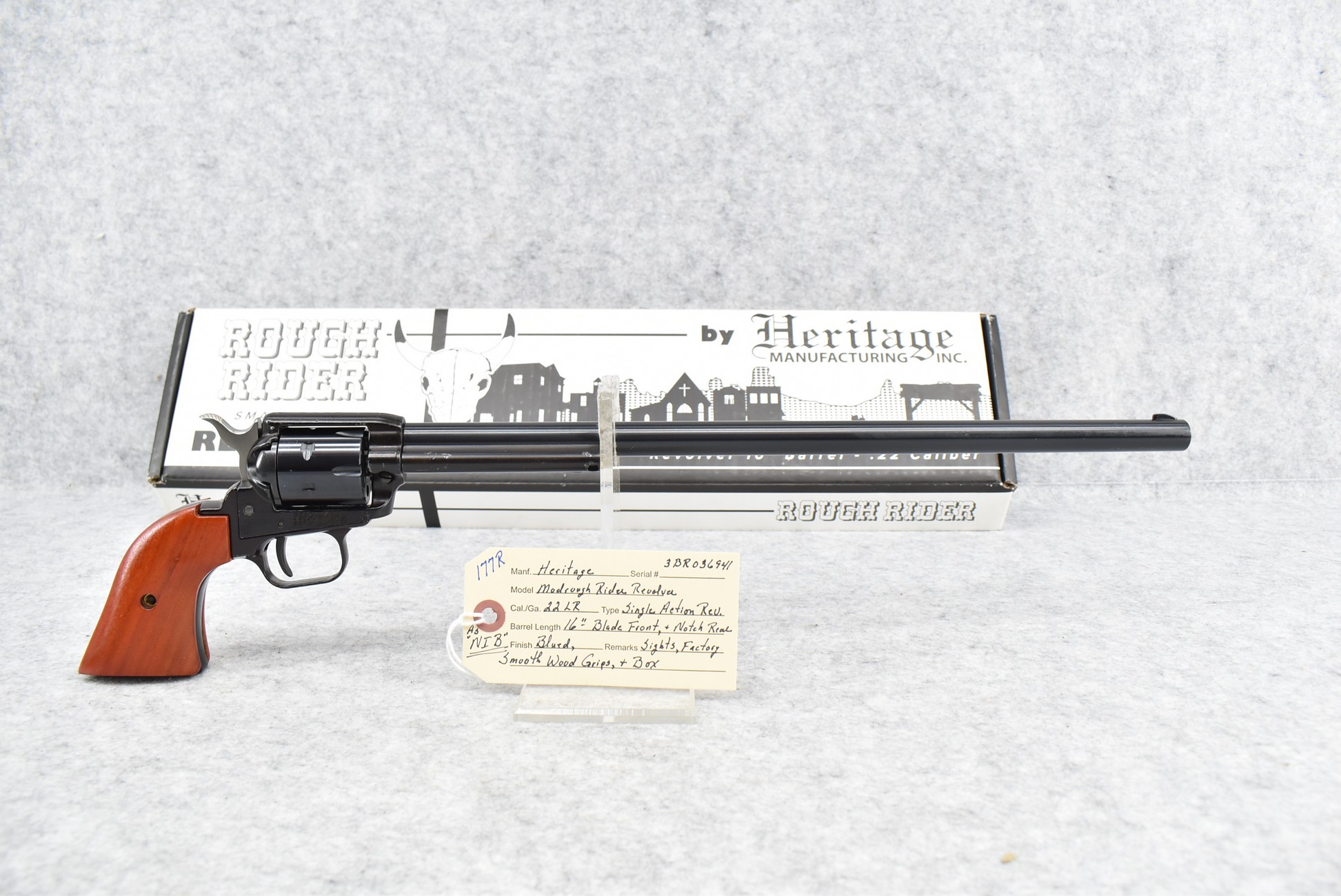 177R. Heritage – Mod. Rough Rider – 22LR Cal. Single Action Revolver – w/16” Barrel w/Blade Front & Notch Rear Sights – Blued Finish – w/Factory Smooth Wood Grips – As New w/Box