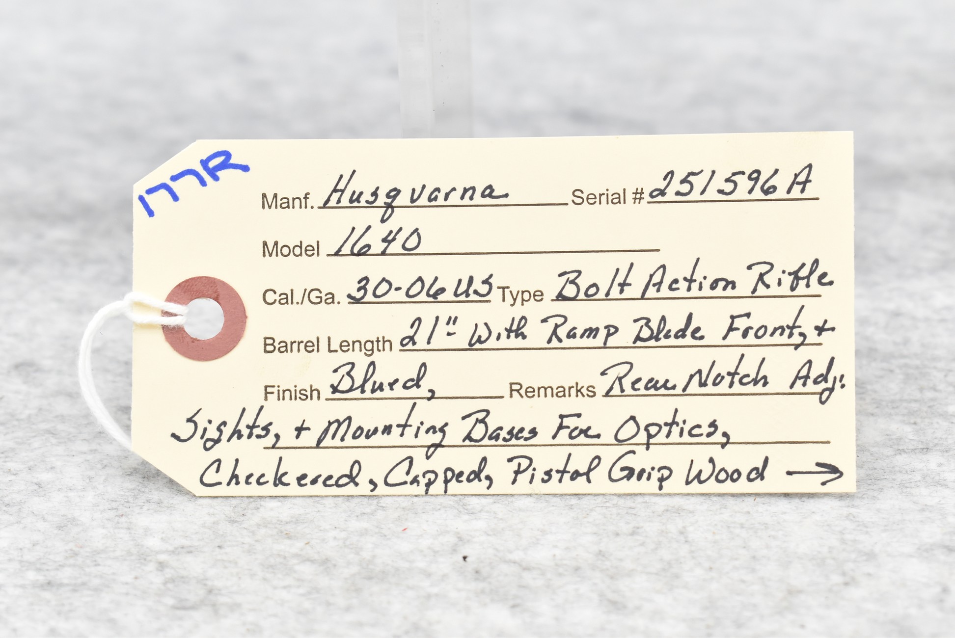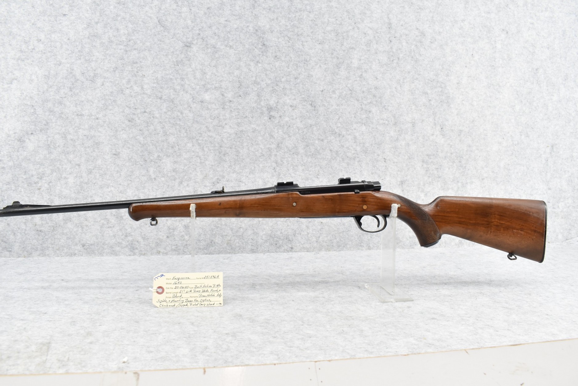 177R. Husqvarna – Mod. 1640 – 30-06 U.S. Cal. Bolt Action Rifle – w/21” Barrel w/Ramp Blade Front and Adjustable Rear Notch Sights – Blued Finish – w/Checkered Capped Pistol Grip Wood Stock w/Factory Butt Plate