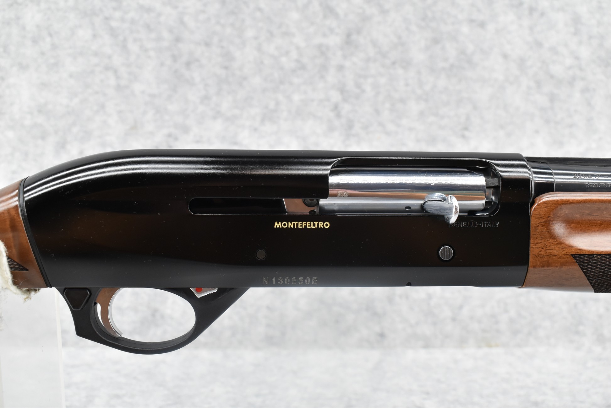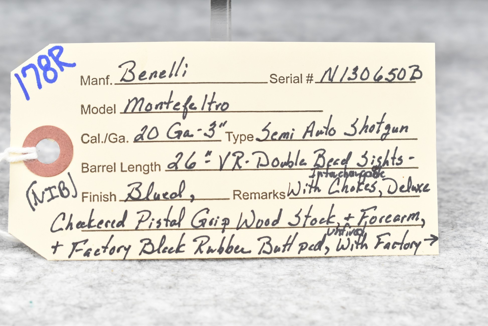 178R. Benelli – Mod. Montefeltro – 20ga. 3” Semi-Auto Shotgun – w/26” Vent-Rib Barrel w/Interchangeable Chokes & Double Bead Sights – Blued Finish – w/Checkered Pistol Grip Wood Stocks w/Factory Butt Pad – Unfired w/Factory Take Down Hard Case, Manuals, Chokes & Accessories