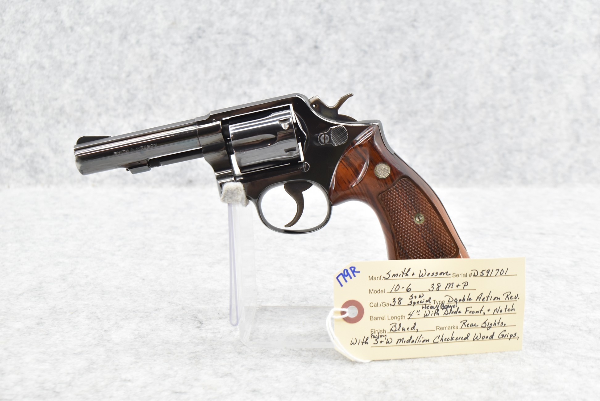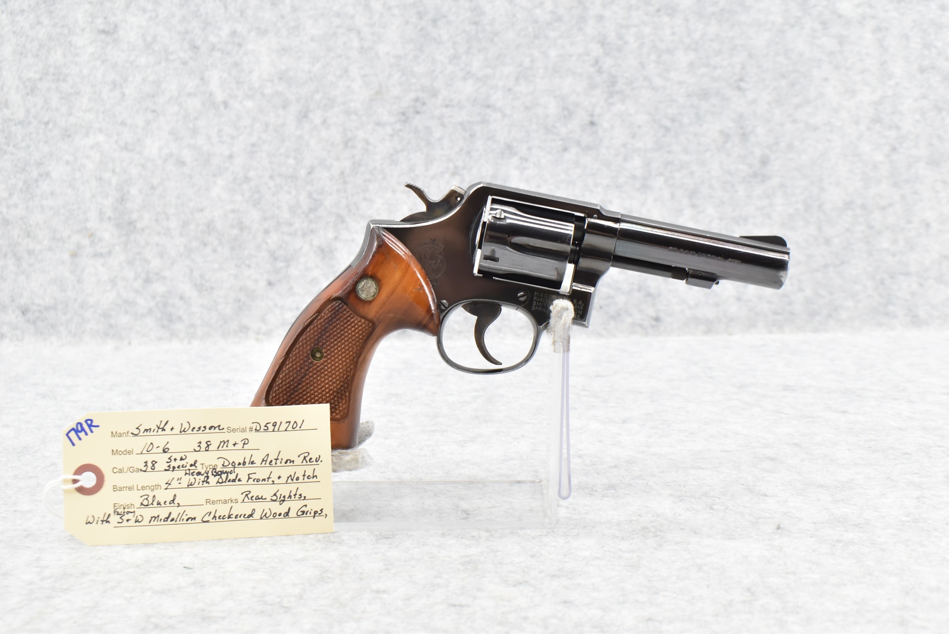 179R. Smith & Wesson – Mod. 10-6 – 38 S&W Special Cal. Double Action Revolver – w/4” Heavy Barrel w/Blade Front and Rear Notch Sights – Blued Finish – w/Factory Smith & Wesson Medallion Checkered Wood Grips