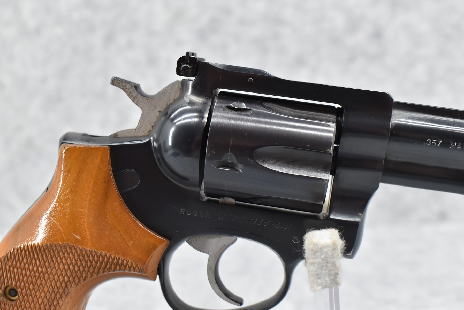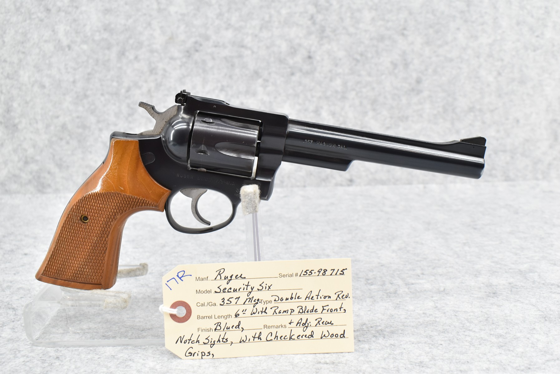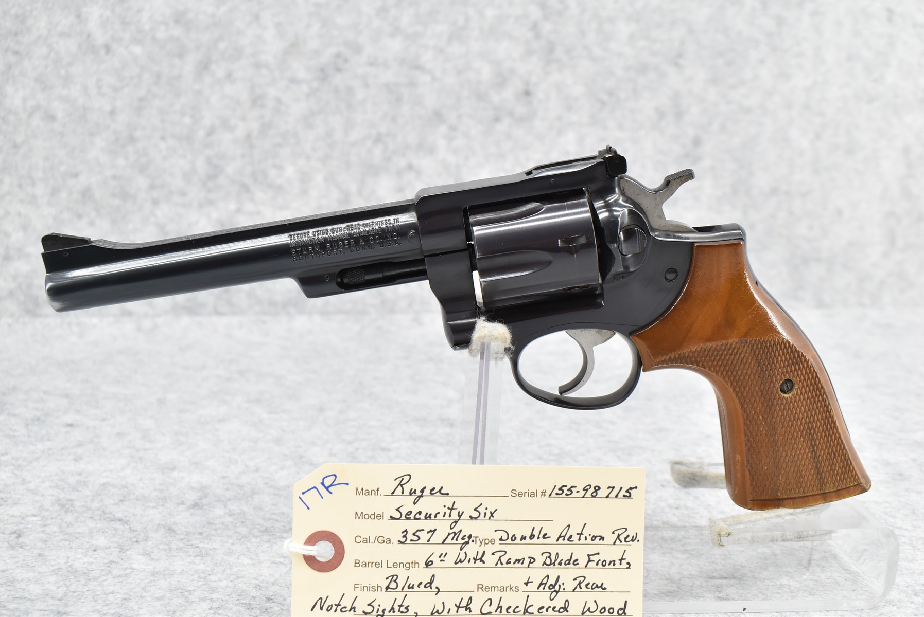 17R. Ruger – Mod. Security Six – 357 Mag. Cal. Double Action Revolver – w/6” Barrel w/Ramp Blade Front & Adj. Rear Notch Sights – Blued Finish – w/Checkered Wood Grips